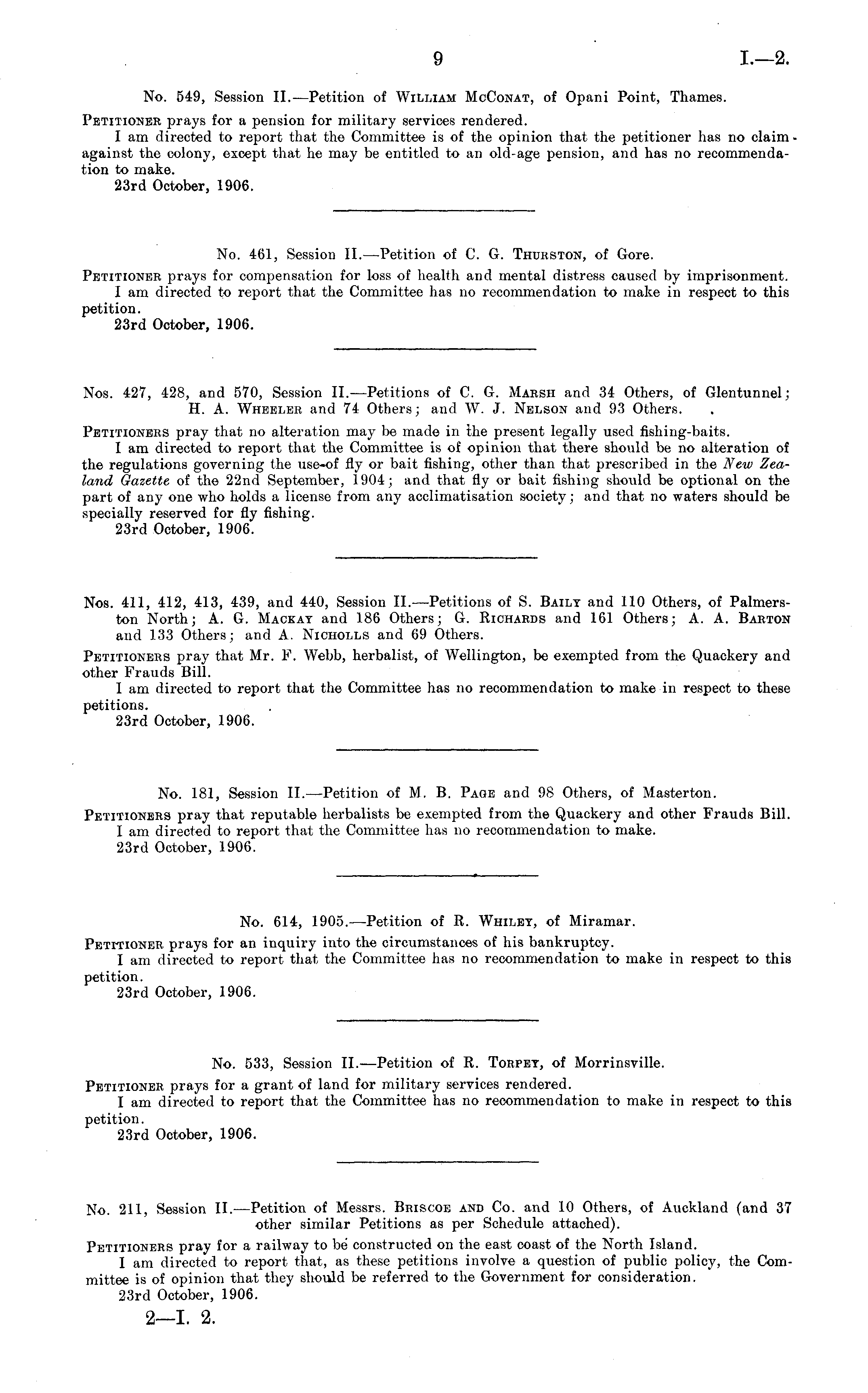 No. 461, Session ll.—Petition of C. G. Thurston, of Gore. Petitioner prays for compensation for loss of health and mental distress caused by imprisonment. I am directed to report that the Committee has no recommendation to make in respect to this petition. 23rd October, 1906. Nos. 427, 428, and 570, Session ll.—Petitions of C. G. Mabsh and 34 Others, of Glentunnel; H. A. Wheeler and 74 Others; and W. J. Nelson and 93 Others. Petitioners pray that no alteration may be made in Ihe present legally used fishing-baits. I am directed to report that the Committee is of opinion that there should be no alteration of the regulations governing the use-of fly or bait fishing, other than that prescribed in the New Zealand Gazette of the 22nd September, 1904; and that fly or bait fishing should be optional on the part of any one who holds a license from any acclimatisation society; and that no waters should be specially reserved for fly fishing. 23rd October, 1906. Nos. 411, 412, 413, 439, and 440, Session ll.—Petitions of S. Baily and 110 Others, of Palmerston North; A. G. Mackat and 186 Others; G. Richards and 161 Others; A. A. Barton and 133 Others; and A. Nicholls and 69 Others. Petitioners pray that Mr. F. Webb, herbalist, of Wellington, be exempted from the Quackery and other Frauds Bill. I am directed to report that the Committee has no recommendation to make in respect to these petitions. 23rd October, 1906. No. 181, Session ll.—Petition of M. B. Page and 98 Others, of Masterton. Petitioners pray that reputable herbalists be exempted from the Quackery and other Frauds Bill. I am directed to report that the Committee has no recommendation to make. 23rd October, 1906. No. 614, 1905.—Petition of R. Whilet, of Miramar. Petitioner prays for an inquiry into the circumstances of his bankruptcy. I am directed to report that the Committee has no recommendation to make in respect to this petition. 23rd October, 1906. No. 533, Session ll.—Petition of R. Torpet, of Morrinsville. Petitioner prays for a grant of land for military services rendered. I am directed to report that the Committee has no recommendation to make in respect to this petition. 23rd October, 1906. No. 211, Session ll.—Petition of Messrs. Briscoe and Co. and 10 Others, of Auckland (and 37 other similar Petitions as per Schedule attached). Petitioners pray for a railway to be constructed on the east coast of the North Island. I am directed to report that, as these petitions involve a question of public policy, the Committee is of opinion that they should be referred to the Government for consideration. 23rd October, 1906. 2—l. 2.