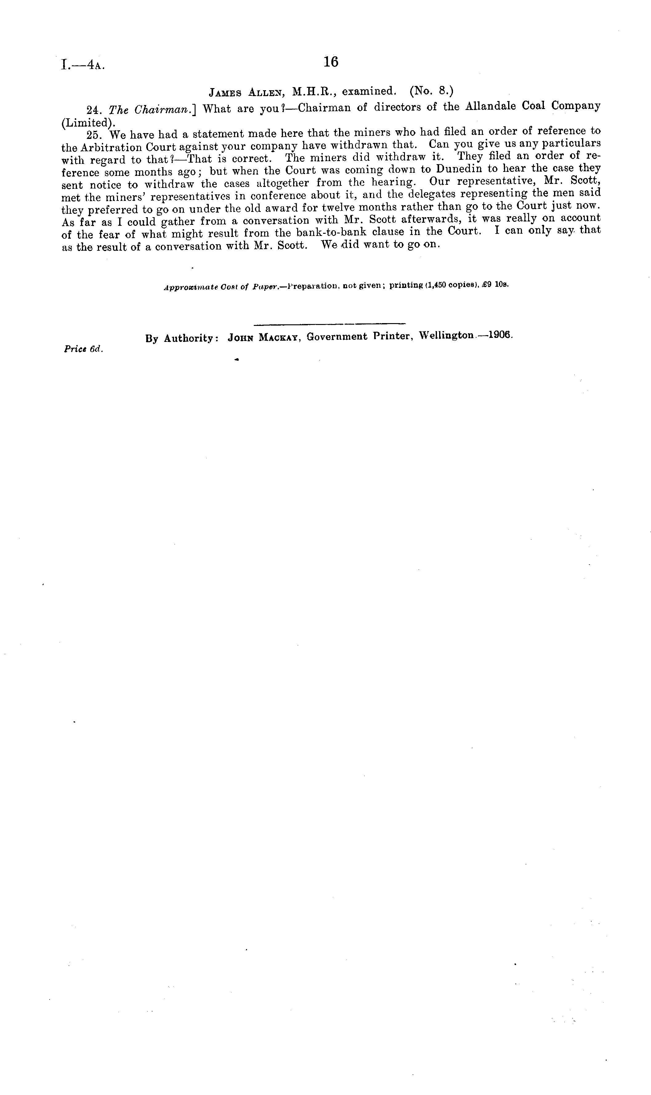 James Allen, M.H.R., examined. (No. 8.) 24. The Chairman.] What are you ?—Chairman of directors of the Allandale Coal Company (Limited). 25. We have had a statement made here that the miners who had filed an order of reference to the Arbitration Court against your company have withdrawn that. Can you give us any particulars with regard to that?—That is correct. The miners did withdraw it. They filed an order of reference some months ago; but when the Court was coming down to Dunedin to hear the case they sent notice to withdraw the cases altogether from the hearing. Our representative, Mr. Scott, met the miners' representatives in conference about it, and the delegates representing the men said they preferred to go on under the old award for twelve months rather than go to the Court just now. As 'far as I could gather from a conversation with Mr. Scott afterwards, it was really on account of the fear of what might result from the bank-to-bank clause in the Court, I can only say that as the result of a conversation with Mr. Scott. We did want to go on.