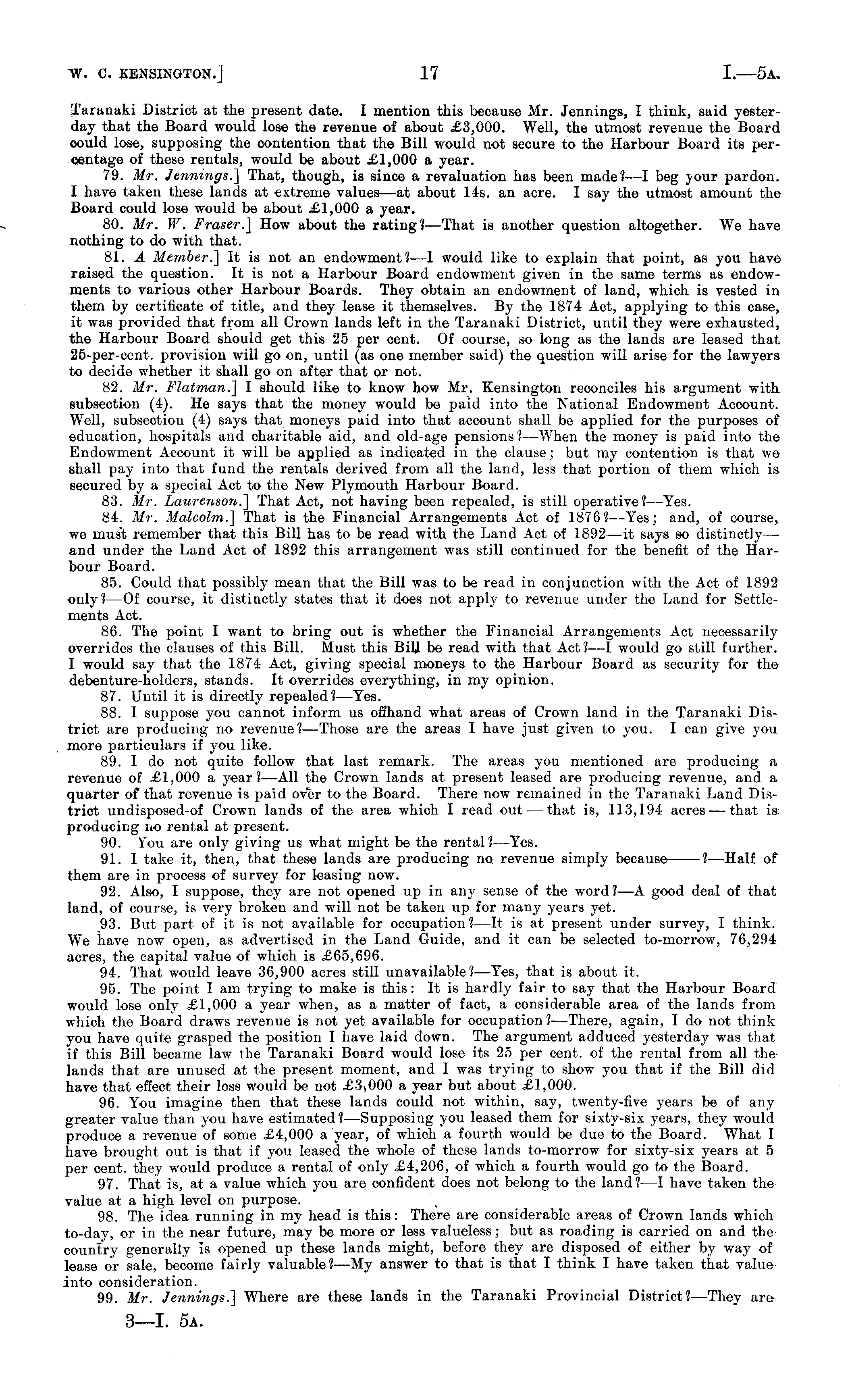 Taranaki District at the present date. I mention this because Mr. Jennings, I think, said yesterday that the Board would lose the revenue of about £3,000. Well, the utmost revenue the Board could lose, supposing the contention that the Bill would not secure to the Harbour Board its percentage of these rentals, would be about £1,000 a year. 79. Mr. Jennings.] That, though, is since a revaluation has been made?—I beg your pardon. I have taken these lands at extreme values—at about 14s. an acre. I say the utmost amount the Board could lose would be about £1,000 a year. 80. Mr. W. Fraser.] How about the rating?—That is another question altogether. We have nothing to do with that. 81. A Member.] It is not an endowment?—I would like to explain that point, as you have raised the question. It is not a Harbour Board endowment given in the same terms as endowments to various other Harbour Boards. They obtain an endowment of land, which is vested in them by certificate of title, and they lease it themselves. By the 1874 Act, applying to this case, it was provided that from all Crown lands left in the Taranaki District, until they were exhausted, the Harbour Board should get this 25 per cent. Of course, so long as the lands are leased that 25-per-cent. provision will go on, until (as one member said) the question will arise for the lawyers to decide whether it shall go on after that or not. 82. Mr. Flatman.] I should like to know how Mr. Kensington reconciles his argument with subsection (4). He says that the money would be paid into the National Endowment Account. Well, subsection (4) says that moneys paid into that account shall be applied for the purposes of education, hospitals and charitable aid, and old-age pensions ?—When the money is paid into the Endowment Account it will be applied as indicated in the clause; but my contention is that we shall pay into that fund the rentals derived from all the land, less that portion of them which is secured by a special Act to the New Plymouth Harbour Board. 83. Mr. Laurenson.] That Act, not having been repealed, is still operative?—Yes. 84. Mr. Malcolm.] That is the Financial Arrangements Act of 1876?—Yes; and, of course, we mus"t remember that this Bill has to be read with the Land Act of 1892—it says so distinctly — and under the Land Act of 1892 this arrangement was still continued for the benefit of the Harbour Board. 85. Could that possibly mean that the Bill was to be read in conjunction with the Act of 1892 only ?—Of course, it distinctly states that it does not apply to revenue under the Land for Settlements Act. 86. The point I want to bring out is whether the Financial Arrangements Act necessarily overrides the clauses of this Bill. Must this Bill be read with that Act?—l would go still further. I would say that the 1874 Act, giving special moneys to the Harbour Board as security for the debenture-holders, stands. It overrides everything, in my opinion. 87. Until it is directly repealed?—Yes. 88. I suppose you cannot inform us offhand what areas of Crown land in the Taranaki District are producing no revenue?—Those are the areas I have just given to you. I can give you more particulars if you like. 89. I do not quite follow that last remark. The areas you mentioned are producing a revenue of £1,000 a year?—All the Crown lands at present leased are producing revenue, and a quarter of that revenue is paid over to the Board. There now remained in the Taranaki Land District undisposed-of Crown lands of the area which I read out — that is, 113,194 acres—that is. producing no rental at present. 90. you are only giving us what might be the rental?—Yes. 91. I take it, then, that these lands are producing no revenue simply because ?—Half of them are in process of survey for leasing now. 92. Also, I suppose, they are not opened up in any sense of the word?—A good deal of that land, of course, is very broken and will not be taken up for many years yet. 93. But part of it is not available for occupation?—lt is at present under survey, I think. We have now open, as advertised in the Land Guide, and it can be selected to-morrow, 76,294 acres, the capital value of which is £65,696. 94. That would leave 36,900 acres still unavailable?—Yes, that is about it. 95. The point lam trying to make is this: It is hardly fair to say that the Harbour Board would lose only £1,000 a year when, as a matter of fact, a considerable area of the lands from which the Board draws revenue is not yet available for occupation ?—There, again, I do not think you have quite grasped the position I have laid down. The argument adduced yesterday was that if this Bill became law the Taranaki Board would lose its 25 per cent, of the rental from all the lands that are unused at the present moment, and I was trying to show you that if the Bill did have that effect their loss would be not £3,000 a year but about £1,000. 96. You imagine then that these lands could not within, say, twenty-five years be of any greater value than you have estimated ?—Supposing you leased them for sixty-six years, they would produce a revenue of some £4,000 a year, of which a fourth would be due to the Board. What I have brought out is that if you leased the whole of these lands to-morrow for sixty-six years at 5 per cent, they would produce a rental of only £4,206, of which a fourth would go to the Board. 97. That is, at a value which you are confident does not belong to the land?—l have taken the value at a high level on purpose. 98. The idea running in my head is this: There are considerable areas of Crown lands which to-day, or in the near future, may be more or less valueless; but as roading is carried on and the country generally is opened up these lands might, before they are disposed of either by way of lease or sale, become fairly valuable?—My answer to that is that I think I have taken that value into consideration. 99. Mr. Jennings.] Where are 