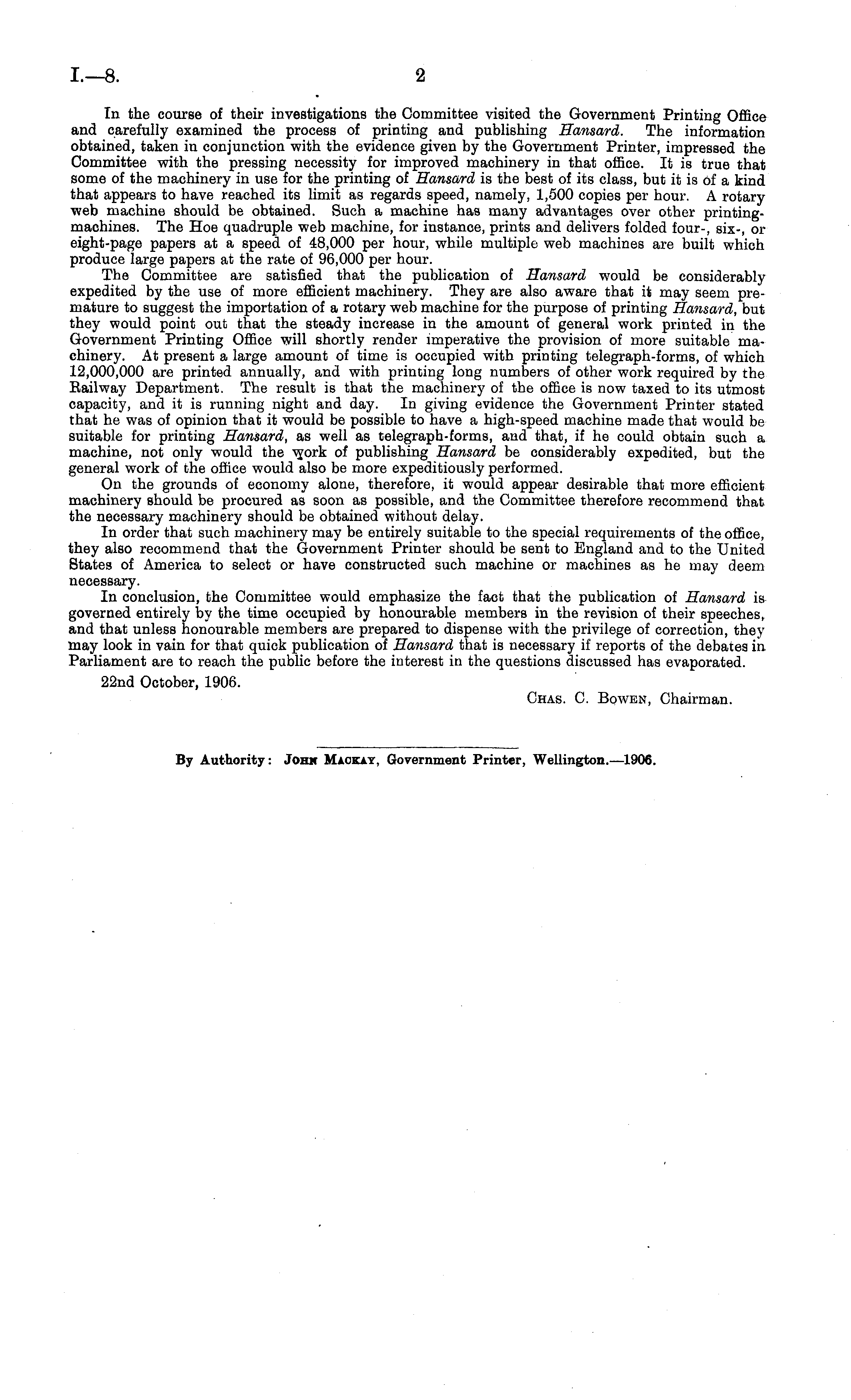 In the course of their investigations the Committee visited the Government Printing Office and carefully examined the process of printing and publishing Hansard. The information obtained, taken in conjunction with the evidence given by the Government Printer, impressed the Committee with the pressing necessity for improved machinery in that office. It is true that some of the machinery in use for the printing of Hansard is the best of its class, but it is of a kind that appears to have reached its limit as regards speed, namely, 1,500 copies per hour. A rotary web machine should be obtained. Such a machine has many advantages over other printingmachines. The Hoe quadruple web machine, for instance, prints and delivers folded four-, six-, or eight-page papers at a speed of 48,000 per hour, while multiple web machines are built which produce large papers at the rate of 96,000 per hour. The Committee are satisfied that the publication of Hansard would be considerably expedited by the use of more efficient machinery. They are also aware that it may seem premature to suggest the importation of a rotary web machine for the purpose of printing Hansard, but they would point out that the steady increase in the amount of general work printed in the Government Printing Office will shortly render imperative the provision of more suitable machinery. At present a large amount of time is occupied with printing telegraph-forms, of which 12,000,000 are printed annually, and with printing long numbers of other work required by the Railway Department. The result is that the machinery of the office is now taxed to its utmost capacity, and it is running night and day. In giving evidence the Government Printer stated that he was of opinion that it would be possible to have a high-speed machine made that would be suitable for printing Hansard, as well as telegraph-forms, and that, if he could obtain such a machine, not only would the work of publishing Hansard be considerably expedited, but the general work of the office would also be more expeditiously performed. On the grounds of economy alone, therefore, it would appear desirable that more efficient machinery should be procured as soon as possible, and the Committee therefore recommend that the necessary machinery should be obtained without delay. In order that such machinery may be entirely suitable to the special requirements of the office, they also recommend that the Government Printer should be sent to England and to the United States of America to select or have constructed such machine or machines as he may deem necessary. In conclusion, the Committee would emphasize the fact that the publication of Hansard is governed entirely by the time occupied by honourable members in the revision of their speeches, and that unless honourable members are prepared to dispense with the privilege of correction, they may look in vain for that quick publication of Hansard that is necessary if reports of the debates in Parliament are to reach the public before the interest in the questions discussed has evaporated. 22nd October, 1906. Chas. C. Bowen, Chairman.