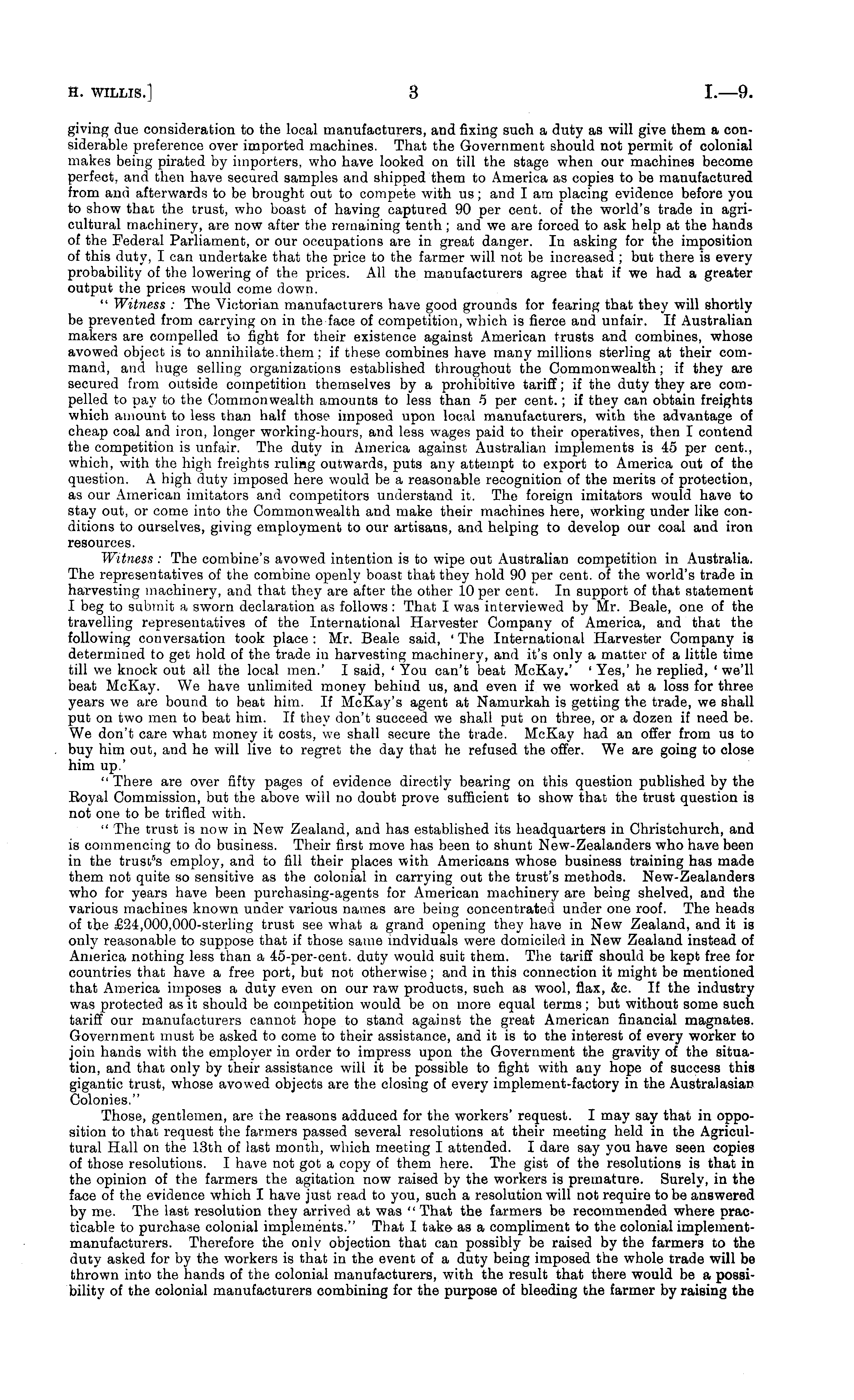 giving due consideration to the local manufacturers, and fixing such a duty as will give them a considerable preference over imported machines. That the Government should not permit of colonial makes being pirated by importers, who have looked on till the stage when our machines become perfect, and then have secured samples and shipped them to America as copies to be manufactured from and afterwards to be brought out to compete with us; and lam placing evidence before you to show that the trust, who boast of having captured 90 per cent, of the world's trade in agricultural machinery, are now after the remaining tenth; and we are forced to ask help at the hands of the Federal Parliament, or our occupations are in great danger. In asking for the imposition of this duty, I can undertake that the price to the farmer will not be increased ; but there is every probability of the lowering of the prices. All the manufacturers agree that if we had a greater output the prices would come down. " Witness : The Victorian manufacturers have good grounds for fearing that they will shortly be prevented from carrying on in the face of competition, which is fierce and unfair. If Australian makers are compelled "to fight for their existence against American trusts and combines, whose avowed object is to annihilate.them: if these combines have many millions sterling at their command, and huge selling organizations established throughout the Commonwealth; if they are secured from outside competition themselves by a prohibitive tariff; if the duty they are compelled to pay to the Commonwealth amounts to less than 5 per cent.; if they can obtain freights which amount to less than half those imposed upon local manufacturers, with the advantage of cheap coal and iron, longer working-hours, and less wages paid to their operatives, then I contend the competition is unfair. The duty in America against Australian implements is 45 per cent., which, with the high freights ruling outwards, puts any attempt to export to America out of the question. A high duty imposed here would be a reasonable recognition of the merits of protection, as our American imitators and competitors understand it. The foreign imitators would have to stay out, or come into the Commonwealth and make their machines here, working under like conditions to ourselves, giving employment to our artisans, and helping to develop our coal and iron resources. Witness : The combine's avowed intention is to wipe out Australian competition in Australia. The representatives of the combine openly boast that they hold 90 per cent, of the world's trade in harvesting machinery, and that they are after the other 10 per cent. In support of that statement I beg to submit a sworn declaration as follows : That I was interviewed by Mr. Beale, one of the travelling representatives of the International Harvester Company of America, and that the following conversation took place : Mr. Beale said, ' The International Harvester Company is determined to get hold of the trade in harvesting machinery, and it's only a matter of a little time till we knock out all the local men.' I said, ' You can't beat McKay.' ' Yes,' he replied, ' we'll beat McKay. We have unlimited money behind us, and even if we worked at a loss for three years we are bound to beat him. If McKay's agent at Namurkah is getting the trade, we shall put on two men to beat him. If they don't succeed we shall put on three, or a dozen if need be. We don't care what money it costs, we shall secure the trade. McKay had an offer from us to buy him out, and he will live to regret the day that he refused the offer. We are going to close him up.' " There are over fifty pages of evidence directly bearing on this question published by the Eoyal Commission, but the above will no doubt prove sufficient to show that the trust question is not one to be trifled with. " The trust is now in New Zealand, and has established its headquarters in Christchurch, and is commencing to do business. Their first move has been to shunt New-Zealanders who have been in the trust 5 s employ, and to fill their places with Americans whose business training has made them not quite so sensitive as the colonial in carrying out the trust's methods. New-Zealanders who for years have been purchasing-agents for American machinery are being shelved, and the various machines known under various names are being concentrated under one roof. The heads of the £24,000,000-sterling trust see what a grand opening they have in New Zealand, and it is only reasonable to suppose that if those same indviduals were domiciled in New Zealand instead of America nothing less than a 45-per-cent. duty would suit them. The tariff should be kept free for countries that have a free port, but not otherwise; and in this connection it might be mentioned that America imposes a duty even on our raw products, such as wool, flax, &c. If the industry was protected as it should be competition would be on more equal terms; but without some such tariff our manufacturers cannot hope to stand against the great American financial magnates. Government must be asked to come to their assistance, and it is to the interest of every worker to join hands with the employer in order to impress upon the Government the gravity of the situation, and that only by their assistance will it be possible to fight with any hope of success this gigantic trust, whose avowed objects are the closing of every implement-factory in the Australasian Colonies." Those, gentlemen, are the reasons adduced for the workers' request. I may say that in opposition to that request the farmers passed several resolutions at their meeting held in the Agricultural Hall on the 13th of last month, which meeting I attended. I dare say you have seen copies of those resolutions. I have not got a copy of them here. The gist of the resolutions is that in the opinion of the farmers the agitation now raised by the workers is premature. Su