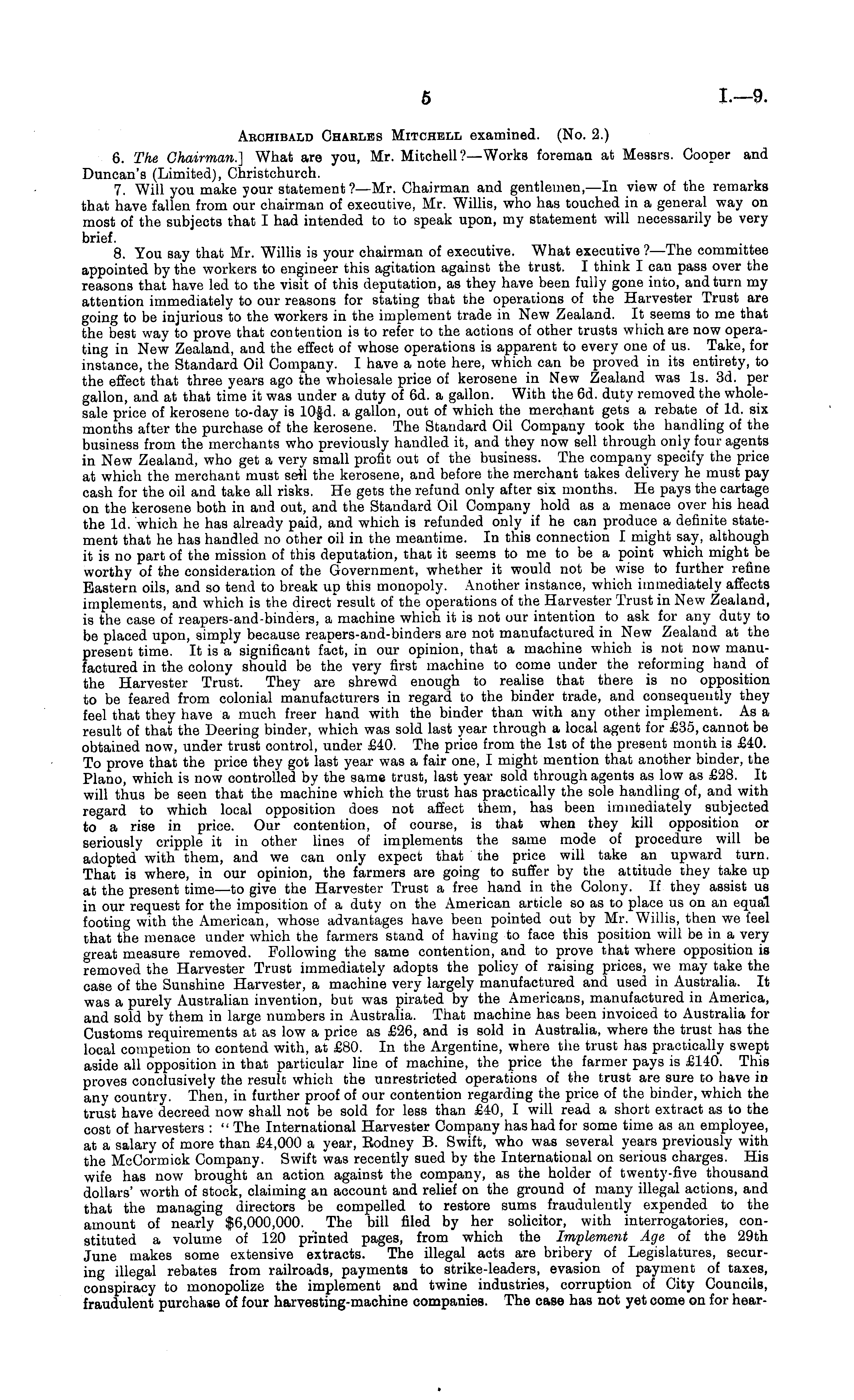 Archibald Charles Mitchell examined. (No. 2.) 6. The Chairman.] What are you, Mr. Mitchell? —Works foreman at Messrs. Cooper and Duncan's (Limited), Christchurch. 7. Will you make your statement ?—Mr. Chairman and gentlemen,—ln view of the remarks that have fallen from our chairman of executive, Mr. Willis, who has touched in a general way on most of the subjects that I had intended to to speak upon, my statement will necessarily be very brief. 8. You say that Mr. Willis is your chairman of executive. What executive ?—The committee appointed by the workers to engineer this agitation against the trust. I think I can pass over the reasons that have led to the visit of this deputation, as they have been fully gone into, and turn my attention immediately to our reasons for stating that the operations of the Harvester Trust are going to be injurious "to the workers in the implement trade in New Zealand. It seems to me that the best way to prove that contention is to refer to the actions of other trusts which are now operating in New Zealand, and the effect of whose operations is apparent to every one of us. Take, for instance, the Standard Oil Company. I have a note here, which can be proved in its entirety, to the effect that three years ago the wholesale price of kerosene in New Zealand was Is. 3d. per gallon, and at that time it was under a duty of 6d. a gallon. With the 6d. duty removed the wholesale price of kerosene to-day is lOfd. a gallon, out of which the merchant gets a rebate of Id. six months after the purchase of the kerosene. The Standard Oil Company took the handling of the business from the merchants who previously handled it, and they now sell through only four agents in New Zealand, who get a very small profit out of the business. The company specify the price at which the merchant must sett the kerosene, and before the merchant takes delivery he must pay cash for the oil and take all risks. He gets the refund only after six months. He pays the cartage on the kerosene both in and out, and the Standard Oil Company hold as a menace over his head the Id. which he has already paid, and which is refunded only if he can produce a definite statement that he has handled no other oil in the meantime. In this connection I might say, although it is no part of the mission of this deputation, that it seems to me to be a point which might be worthy of the consideration of the Government, whether it would not be wise to further refine Eastern oils, and so tend to break up this monopoly. Another instance, which immediately affects implements, and which is the direct'result of the operations of the Harvester Trust in New Zealand, is the case of reapers-and-binders, a machine which it is not our intention to ask for any duty to be placed upon, simply because reapers-and-binders are not manufactured in New Zealand at the present time. It is a significant fact, in our opinion, that a machine which is not now manufactured in the colony should be the very first machine to come under the reforming hand of the Harvester Trust. They are shrewd enough to realise that there is no opposition to be feared from colonial manufacturers in regard to the binder trade, and consequently they feel that they have a much freer hand with the binder than with any other implement. As a result of that the Deering binder, which was sold last year through a local agent for £35, cannot be obtained now, under trust control, under £40. The price from the Ist of the present month is £40. To prove that the price they got last year was a fair one, I might mention that another binder, the Piano, which is now controlled by the same trust, last year sold through agents as low as £28. It will thus be seen that the machine which the trust has practically the sole handling of, and with regard to which local opposition does not affect them, has been immediately subjected to a rise in price. Our contention, of course, is that when they kill opposition or seriously cripple it in other lines of implements the same mode of procedure will be adopted with them, and we can only expect that the price will take an upward turn. That is where, in our opinion, the farmers are going to suffer by the attitude they take up at the present time—to give the Harvester Trust a free hand in the Colony. If they assist us in our request for the imposition of a duty on the American article so as to place us on an equal footing with the American, whose advantages have been pointed out by Mr. Willis, then we feel that the menace under which the farmers stand of having to face this position will be in a very great measure removed. Following the same contention, and to prove that where opposition is removed the Harvester Trust immediately adopts the policy of raising prices, we may take the case of the Sunshine Harvester, a machine very largely manufactured and used in Australia. It was a purely Australian invention, but was pirated by the Americans, manufactured in America, and sold by them in large numbers in Australia. That machine has been invoiced to Australia for Customs requirements at as low a price as £26, and is sold in Australia, where the trust has the local competion to contend with, at £80. In the Argentine, where the trust has practically swept aside all opposition in that particular line of machine, the price the farmer pays is £140. This proves conclusively the result which the unrestricted operations of the trust are sure to have in any country. Then, in further proof of our contention regarding the price of the binder, which the trust have decreed now shall not be sold for less than £40, I will read a short extract as to the cost of harvesters : " The International Harvester Company has had for some time as an employee, at a salary of more than £4,000 a year, Rodney B. Swift, who was several years previously with the McCormick Company. Swift was recently sued by the International on serious charges. His wife has now broug
