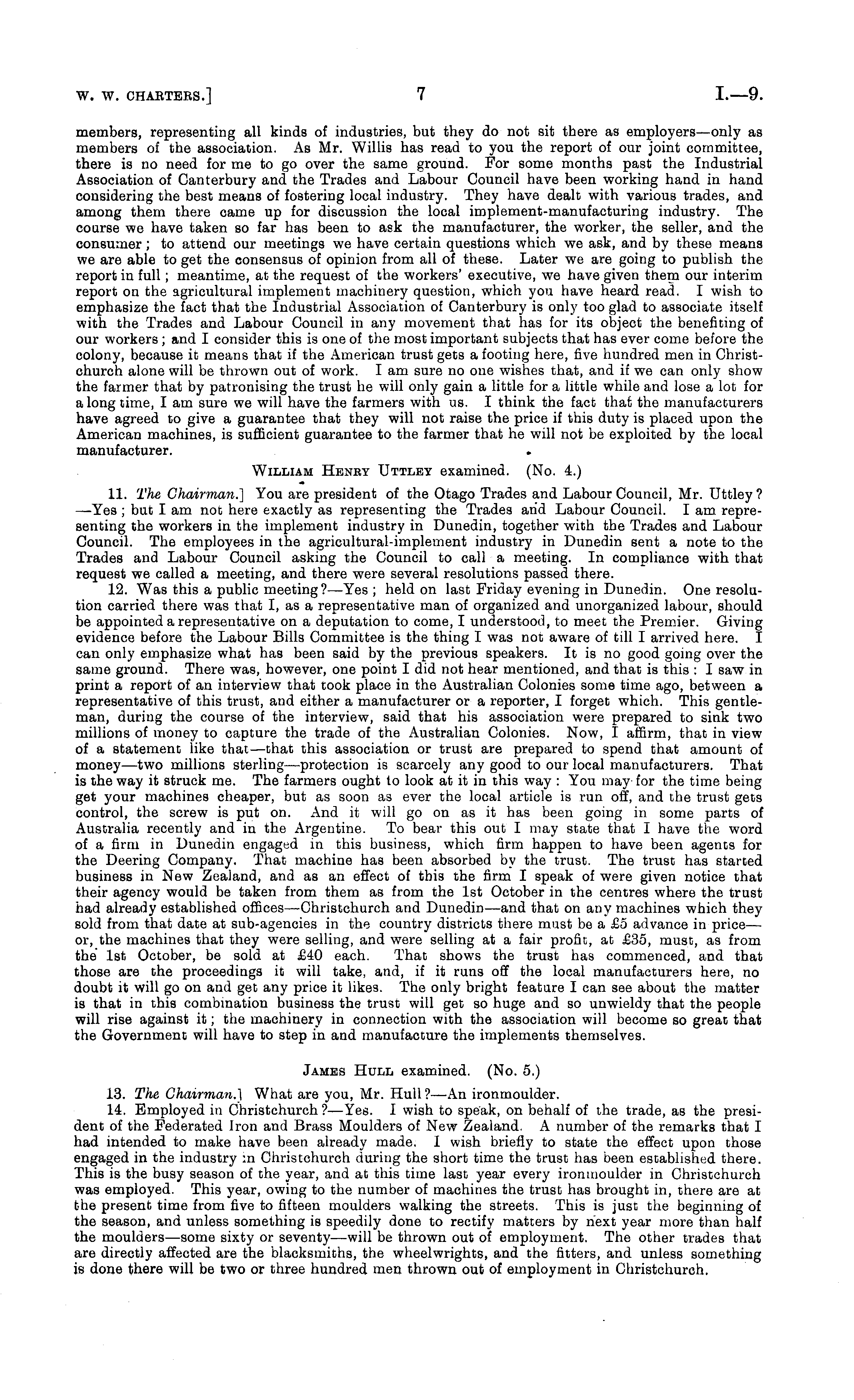 members, representing all kinds of industries, but they do not sit there as employers—only as members of the association. As Mr. Willis has read to you the report of our joint committee, there is no need for me to go over the same ground. For some months past the Industrial Association of Canterbury and the Trades and Labour Council have been working hand in hand considering the best means of fostering local industry. They have dealt with various trades, and among them there came up for discussion the local implement-manufacturing industry. The course we have taken so far has been to ask the manufacturer, the worker, the seller, and the consumer ; to attend our meetings we have certain questions which we ask, and by these means we are able to get the consensus of opinion from all of these. Later we are going to publish the report in full; meantime, at the request of the workers' executive, we have given them our interim report on the agricultural implement machinery question, which you have heard read. I wish to emphasize the fact that the Industrial Association of Canterbury is only too glad to associate itself with the Trades and Labour Council in any movement that has for its object the benefiting of our workers ; and I consider this is one of the most important subjects that has ever come before the colony, because it means that if the American trust gets a footing here, five hundred men in Christchurch alone will be thrown out of work. lam sure no one wishes that, and if we can only show the farmer that by patronising the trust he will only gain a little for a little while and lose a lot for a long time, lam sure we will have the farmers with us. I think the fact that the manufacturers have agreed to give a guarantee that they will not raise the price if this duty is placed upon the American machines, is sufficient guarantee to the farmer that he will not be exploited by the local manufacturer. . William Heney Uttley examined. (No. 4.) 11. The Chairman.] You are president of the Otago Trades and Labour Council, Mr. Uttley? —-Yes ; but lam not here exactly as representing the Trades and Labour Council. lam representing the workers in the implement industry in Dunedin, together with the Trades and Labour Council. The employees in the agricultural-implement industry in Dunedin sent a note to the Trades and Labour Council asking the Council to call a meeting. In compliance with that request we called a meeting, and there were several resolutions passed there. 12. Was this a public meeting?— Yes; held on last Friday evening in Dunedin. One resolution carried there was that I, as a representative man of organized and unorganized labour, should be appointed a representative on a deputation to come, I understood, to meet the Premier. Giving evidence before the Labour Bills Committee is the thing I was not aware of till I arrived here. I can only emphasize what has been said by the previous speakers. It is no good going over the same ground. There was, however, one point I did not hear mentioned, and that is this : I saw in print a report of an interview that took place in the Australian Colonies some time ago, between a representative of this trust, and either a manufacturer or a reporter, I forget which. This gentleman, during the course of the interview, said that his association were prepared to sink two millions of money to capture the trade of the Australian Colonies. Now, I affirm, that in view of a statement like that—that this association or trust are prepared to spend that amount of money—two millions sterling—protection is scarcely any good to our local manufacturers. That is the way it struck me. The farmers ought to look at it in this way : You may for the time being get your machines cheaper, but as soon as ever the local article is run off, and the trust gets control, the screw is put on. And it will go on as it has been going in some parts of Australia recently and in the Argentine. To bear this out I may state that I have the word of a firm in Dunedin engaged in this business, which firm happen to have been agents for the Deering Company. That machine has been absorbed by the trust. The trust has started business in New Zealand, and as an effect of this the firm I speak of were given notice that their agency would be taken from them as from the Ist October in the centres where the trust had already established offices —Christchurch and Dunedin —and that on any machines which they sold from that date at sub-agencies in the country districts there must be a £5 advance in price— or, the machines that they were selling, and were selling at a fair profit, at £35, must, as from the Ist October, be sold at £40 each. That shows the trust has commenced, and that those are the proceedings it will take, and, if it runs off the local manufacturers here, no doubt it will go on and get any price it likes. The only bright feature I can see about the matter is that in this combination business the trust will get so huge and so unwieldy that the people will rise against it; the machinery in connection with the association will become so great that the Government will have to step in and manufacture the implements themselves. James Hull examined. (No. 5.) 13. The Chairman.} What are you, Mr. Hull ? —An ironmoulder. 14. Employed in Christchurch ?—Yes. I wish to speak, on behalf of the trade, as the president of the Federated Iron and Brass Moulders of New Zealand. A number of the remarks that I had intended to make have been already made. I wish briefly to state the effect upon those engaged in the industry :n Christchurch during the short time the trust has been established there. This is the busy season of the year, and at this time last year every ironmoulder in Christchurch was employed. This year, owing to the number of machines the trust has brought in, there are at the present time from five to fifteen moulders walking the streets. This is just the beginning of 