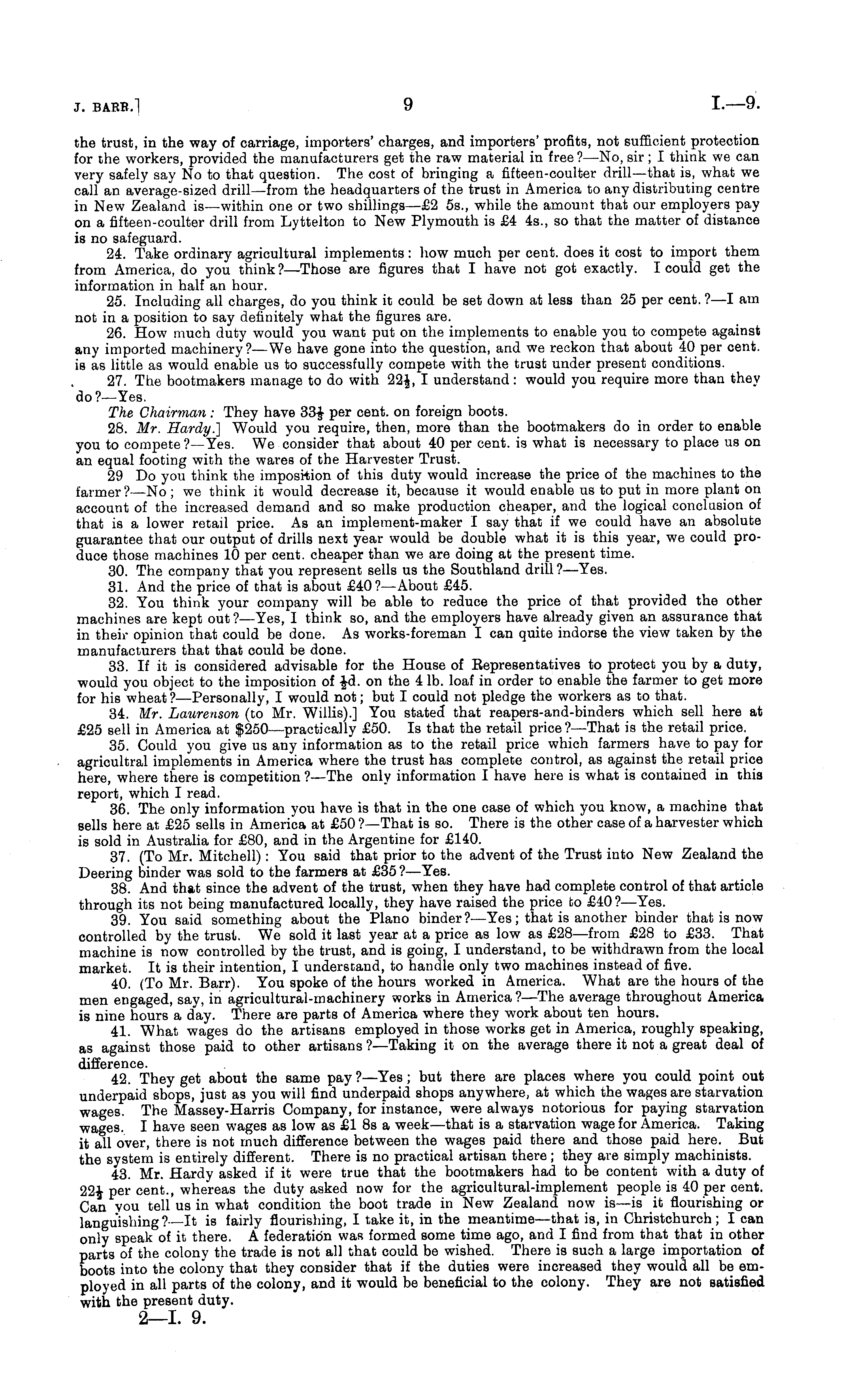 the trust, in the way of carriage, importers' charges, and importers' profits, not sufficient protection for the workers, provided the manufacturers get the raw material in free ?—No, sir ; I think we can very safely say No to that question. The cost of bringing a fifteen-coulter drill—that is, what we call an average-sized drill—from the headquarters of the trust in America to any distributing centre in New Zealand is—within one or two shillings—£2 55., while the amount that our employers pay on a fifteen-coulter drill from Lyttelton to New Plymouth is £4 45., so that the matter of distance is no safeguard. 24. Take ordinary agricultural implements: how much per cent, does it cost to import them from America, do you think?— Those are figures that I have not got exactly. I could get the information in half an hour. 25. Including all charges, do you think it could be set down at less than 25 per cent. ?—I am not in a position to say definitely what the figures are. 26. How much duty would you want put on the implements to enable you to compete against any imported machinery?—We have gone into the question, and we reckon that about 40 per cent, is as little as would enable us to successfully compete with the trust under present conditions. 27. The bootmakers manage to do with 225, I understand : would you require more than they do?— Yes. The Chairman : They have 33£ per cent, on foreign boots. 28. Mr. Hardy.] Would you require, then, more than the bootmakers do in order to enable you to compete ?—Yes. We consider that about 40 per cent, is what is necessary to place us on an equal footing with the wares of the Harvester Trust. 29 Do you think the imposition of this duty would increase the price of the machines to the farmer?—No; we think it would decrease it, because it would enable us to put in more plant on account of the increased demand and so make production cheaper, and the logical conclusion of that is a lower retail price. As an implement-maker I say that if we could have an absolute guarantee that our output of drills next year would be double what it is this year, we could produce those machines 10 per cent, cheaper than we are doing at the present time. 30. The company that you represent sells us the Southland drill ?—Yes. 31. And the price of that is about £40?—About £45. 32. You think your company will be able to reduce the price of that provided the other machines are kept out ?—Yes, I think so, and the employers have already given an assurance that in their opinion that could be done. As works-foreman I can quite indorse the view taken by the manufacturers that that could be done. 33. If it is considered advisable for the House of Eepresentatives to protect you by a duty, would you object to the imposition of £d. on the 4 lb. loaf in order to enable the farmer to get more for his wheat?—Personally, I would not; but I could not pledge the workers as to that. 34. Mr. Laurenson (to Mr. Willis).] You stated that reapers-and-binders which sell here at £25 sell in America at $250—practically £50. Is that the retail price?— That is the retail price. 35. Could you give us any information as to the retail price which farmers have to pay for agricultral implements in America where the trust has complete control, as against the retail price here, where there is competition ?—The only information I have here is what is contained in this report, which I read. 36. The only information you have is that in the one case of which you know, a machine that sells here at £25 sells in America at £50?—That is so. There is the other case of a harvester which is sold in Australia for £80, and in the Argentine for £140. 37. (To Mr. Mitchell): You said that prior to the advent of the Trust into New Zealand the Deering binder was sold to the farmers at £35 ?—Yes. 38. And that since the advent of the trust, when they have had complete control of that article through its not being manufactured locally, they have raised the price to £40?— Yes. 39. You said something about the Piano binder?— Yes; that is another binder that is now controlled by the trust. We sold it last year at a price as low as £28—from £28 to £33. That machine is now controlled by the trust, and is going, I understand, to be withdrawn from the local market. It is their intention, I understand, to handle only two machines instead of five. 40. (To Mr. Barr). You spoke of the hours worked in America. What are the hours of the men engaged, say, in agricultural-machinery works in America ?—The average throughout America is nine hours a day. There are parts of America where they work about ten hours. 41. What wages do the artisans employed in those works get in America, roughly speaking, as against those paid to other artisans ?—Taking it on the average there it not a great deal of difference. 42. They get about the same pay?— Yes; but there are places where you could point out underpaid sbops, just as you will find underpaid shops anywhere, at which the wages are starvation wages. The Massey-Harris Company, for instance, were always notorious for paying starvation wages. I have seen wages as low as £1 8s a week—that is a starvation wage for America. Taking it all over, there is not much difference between the wages paid there and those paid here. But the system is entirely different. There is no practical artisan there; they are simply machinists. 43. Mr. Hardy asked if it were true that the bootmakers had to be content with a duty of 22£ per cent., whereas the duty asked now for the agricultural-implement people is 40 per cent. Can you tell us in what condition the boot trade in New Zealand now is—is it flourishing or languishing ? It is fairly flourishing, I take it, in the meantime—that is, in Christchurch ; I can only speak of it there. A federation was formed some time ago, and I find from that that in other parts of the colony the trade is not all that could b