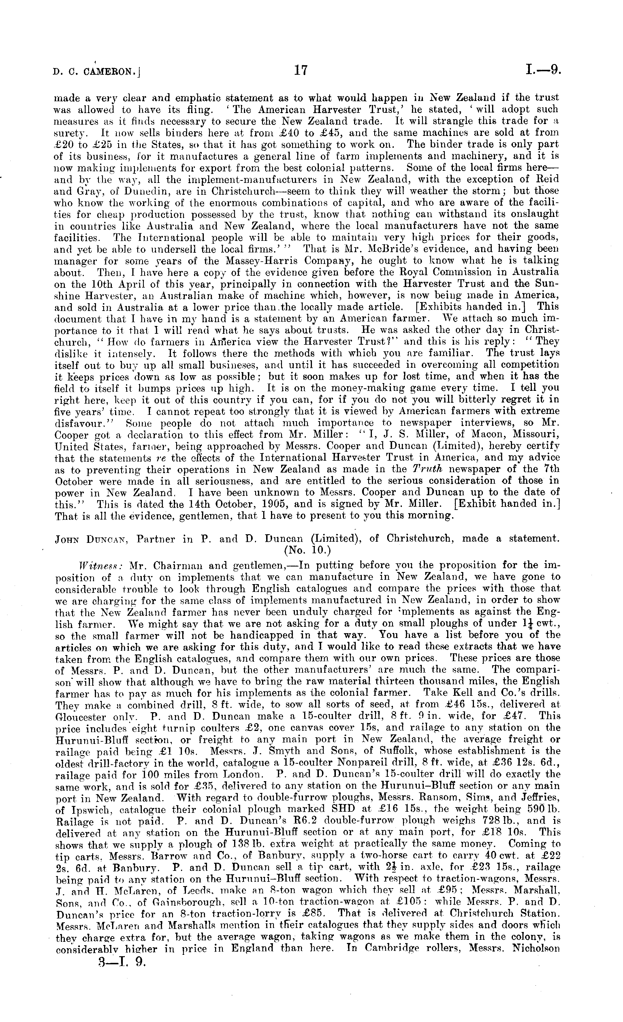 made a very clear and emphatic statement as to what would happen in New Zealand if the trust was allowed to have its fling. 'The American Harvester Trust,' he stated, 'will adopt such measures as it finds necessary to secure the New Zealand trade. It will strangle this trade for a surety. It now sells binders here at from £40 to £45, and the same machines are sold at from £20 to £25 in the States, so that it has got something to work on. The binder trade is only part of its business, for it manufactures a general line of farm implements and machinery, and it is now making implements for export from the best colonial patterns. Some of the local firms here— and by the way, all the implement-manufucturers in New Zealand, with the exception of Reid and Gray, of Dunedin, are in Christchurch —seem to think they will weather the storm; but those who know the working of the enormous combinations of capital, and who are aware of the facilities for cheap production possessed by the trust, know that nothing can withstand its onslaught in countries like Australia and New Zealand, where the local manufacturers have not the same facilities. The International people will be able to maintain very high jjrices for their goods, and yet be able to undersell the local firms.' ' That is Mr. Mcßride's evidence, and having been manager for some years of the Massey-Harris Company, he ought to know what he is talking about. Then, I have here a copy of the evidence given before the Royal Commission in Australia on the 10th April of this year, principally in connection with the Harvester Trust and the Sunshine Harvester, an Australian make of machine which, however, is now being made in America, and sold in Australia at a lower price than the locally made article. [Exhibits handed in.] This document that I have in my hand is a statement by an American farmer. We attach so much importance to it thai I will read what he says about trusts. He was asked the other day in Christchurch, " How do farmers in Arfierica view the Harvester Trust?" and this is his reply: " They dislike it intensely. It follows there the methods with which you are familiar. The trust lays itself out to buy up all small busineses, and until it has succeeded in overcoming all competition it keeps prices down as low as possible ; but it soon makes up for lost time, and when it has the field to itself it bumps prices up high. It is on the money-making game every time. I tell you right here, keep it out of this country if you can, for if you do not you will bitterly regret it in five years' time. I cannot repeat too strongly that it is viewed by American farmers with extreme disfavour." Some people do not attach much importa7ice to newspaper interviews, so Mr. Cooper got a declaration to this effect from Mr. Miller: "I, J. S. Miller, of Macon, Missouri, United States, farmer, being approached by Messrs. Cooper and Duncan (Limited), hereby certify that the statements re the effects of the International Harvester Trust in America, and my advice as to preventing their operations in New Zealand as made in the Truth newspaper of the 7th October were made in all seriousness, and are entitled to the serious consideration of those in power in New Zealand. I have been unknown to Messrs. Cooper and Duncan up to the date of this." Tins is dated the 14th October, 1905, and is signed by Mr. Miller. [Exhibit handed in. ] That is all the evidence, gentlemen, that 1 have to present to you this morning. John Duncan, Partner in P. and D. Duncan (Limited), of Christchurch, made a statement. (No. 10.) Witness: Mr. Chairman and gentlemen,—ln putting before you the proposition for the imposition of a duty on implements that we can manufacture in New Zealand, we have gone to considerable trouble to look through English catalogues and compare the prices with those that we are charging for the same class of implements manufactured in New Zealand, in order to show that the New Zealand farmer has never been unduly charged for : mplements as against the English farmer. We might say that we are not asking for a duty on small ploughs of under ljcwt., so the small farmer will not be handicapped in that way. You have a list before you of the articles on which we are asking for this duty, and I would like to read these extracts that we have taken from the English catalogues, and compare them with our own prices. These prices are those of Messrs. P. and D. Duncan, but the other manufacturers' are much the same. The comparison will show that although we have to bring the raw material thirteen thousand miles, the English farmer ha>. to pay as much for his implements as the colonial farmer. Take Kell and Co.'s drills. They make a combined drill, 8 ft. wide, to sow all sorts of seed, at from £46 155., delivered at Gloucester only. P. and D. Duncan make a 15-coulter drill, 8 ft. 0 in. wide, for £47. Tin's price includes eight turnip coulters £2, one canvas cover 15s, and railage to any station on the Hurunui-Bluff section, or freight to any main port in New Zealand, the average freight or railage paid being £1 10s. Messrs. J. Smyth and Sons, of Suffolk, whose establishment is the oldest drill-factor}' in the world, catalogue a 15-coulter Nonpareil drill, 8 ft. wide, at £36 12s. 6d., railage paid for 1.00 miles from London. P. and D. Duncan's 15-coulter drill will do exactly the same work, and is sold for £35, delivered to any station on the Hurunui—Bluff section or any main port in New Zealand. With regard to double-furrow ploughs, Messrs. Ransom, Sims, and Jeffries, of Ipswich, catalogue their colonial plough marked SHD at £16 155., the weight being 5901b. Railage is not paid. P. and D. Duncan's R6.2 double-furrow plough weighs 728 Ib., and is delivered at any station on the Hurunui-Bluff section or at any main port, for £18 10s. This shows that we supply a plough of 1381b. extra weight at practically the same money. Coming to tip carts. Messrs. Barrow and Co., of B