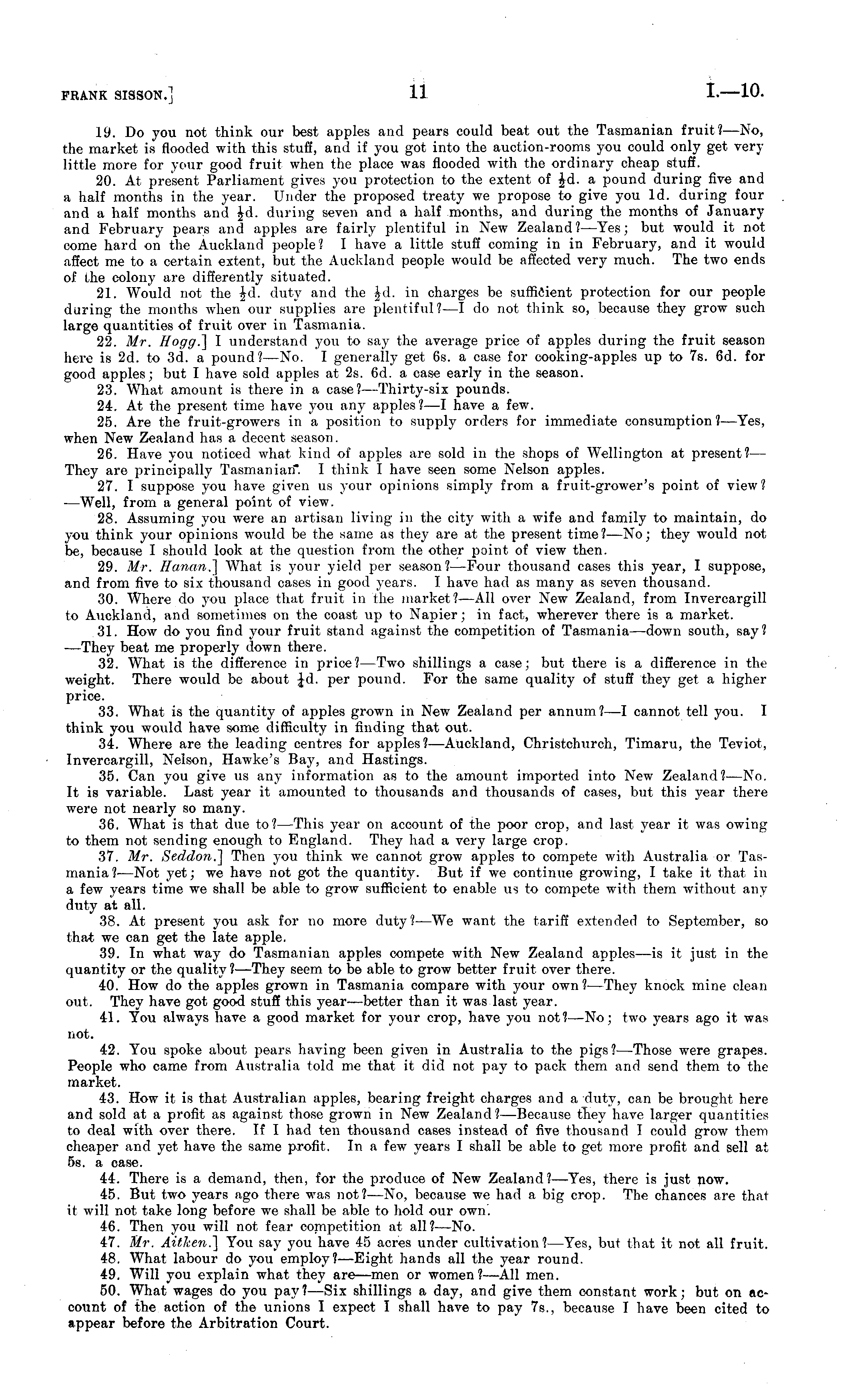 19. Do you not think our best apples and pears could beat out the Tasmanian fruit?—No, the market is flooded with this stuff, and if you got into the auction-rooms you could only get very little more for your good fruit when the place was flooded with the ordinary cheap stuff. 20. At present Parliament gives you protection to the extent of Jd. a pound during five and a half months in the year. Under the proposed treaty we propose to give you Id. during four and a half months and £d. during seven and a half months, and during the months of January and February pears and apples are fairly plentiful in New Zealand? —Yes; but would it not come hard on the Auckland people? I have a little stuff coming in in February, and it would affect me to a certain extent, but the Auckland people would be affected very much. The two ends of the colony are differently situated. 21. Would not the £d. duty and the Jd. in charges be sufficient protection for our people during the months when our supplies are plentiful ?—I do not think so, because they grow such large quantities of fruit over in Tasmania. 22. Mr. Hogg.] I understand you to say the average price of apples during the fruit season here is 2d. to 3d. a pound?— No. I generally get 6s. a case for cooking-apples up to 7s. 6d. for good apples; but I have sold apples at 2s. 6d. a case early in the season. 23. What amount is there in a case?— Thirty-six pounds. 24. At the present time have you any apples?—l have a few. 25. Are the fruit-growers in a position to supply orders for immediate consumption?— Yes, when New Zealand has a decent season. 26. Have you noticed what kind of apples are sold in the shops of Wellington at present?-— They are principally Tasmanian". I think I have seen some Nelson apples. 27. I suppose you have given us your opinions simply from a fruit-grower's point of view? —Well, from a general point of view. 28. Assuming you were an artisan living in the city with a wife and family to maintain, do you think your opinions would be the same as they are at the present time? —No; they would not be, because I should look at the question from the other point of view then. 29. Mr. Hanan.] What is your yield per season?— Four thousand cases this year, I suppose, and from five to six thousand cases in good years. I have had as many as seven thousand. 30. Where do you place that fruit in the market? —All over New Zealand, from Invercargill to Auckland, and sometimes on the coast up to Napier; in fact, wherever there is a market. 31. How do you find your fruit stand against the competition of Tasmania —down south, say? —They beat me properly down there. 32. What is the difference in price?— Two shillings a case; but there is a difference in the weight. There would be about |d. per pound. For the same quality of stuff they get a higher price. 33. What is the quantity of apples grown in New Zealand per annum?—l cannot tell you. I think you would have some difficulty in finding that out. 34. Where are the leading centres for apples?— Auckland, Christchurch, Timaru, the Teviot, Invercargill, Nelson, Hawke's Bay, and Hastings. 35. Can you give us any information as to the amount imported into New Zealand? —No. It is variable. Last year it amounted to thousands and thousands of cases, but this year there were not nearly so many. 36. What is that due to?— This year on account of the poor crop, and last year it was owing to them not sending enough to England. They had a very large crop. 37. Mr. Seddon.] Then you think we cannot grow apples to compete with Australia or Tasmania? —Not yet; we have not got the quantity. But- if we continue growing, I take it that in a few years time we shall be able to grow sufficient to enable us to compete with them without any duty at all. 38. At present you ask for no more duty?—We want the tariff extended to September, so that we can get the late apple. 39. In what way do Tasmanian apples compete with New Zealand apples—is it just in the quantity or the quality? —They seem to be able to grow better fruit over there. 40. How do the apples grown in Tasmania compare with your own ?—They knock mine clean out. They have got good stuff this year—better than it was last year. 41. You always have a good market for your crop, have you not?—No; two years ago it was not. 42. You spoke about pears having been given in Australia to the pigs?— Those were grapes. People who came from Australia told me that it did not pay to pack them and send them to the market. 43. How it is that Australian apples, bearing freight charges and a duty, can be brought here and sold at a profit as against those grown in New Zealand ?—Because they have larger quantities to deal with over there. If I had ten thousand cases instead of five thousand I could grow- them cheaper and yet have the same profit. In a few years I shall be able to get more profit and sell at ss. a case. 44. There is a demand, then, for the produce of New Zealand?— Yes, there is just now. 45. But two years ago there was not? —No, because we had a big crop. The chances are that it will not take long before we shall be able to hold our own. 46. Then you will not fear competition at all?— No. 47. Mr. Aitken.] You say you have 45 acres under cultivation?— Yes, but that it not all fruit. 48. What labour do you employ?— Eight hands all the year round. 49. Will you explain what they are —men or women? —All men. 50. What wages do you pay? —Six shillings a day, and give them constant work; but on account of the action of the unions I expect I shall have to pay 75., because I have been cited to appear before the Arbitration Court.