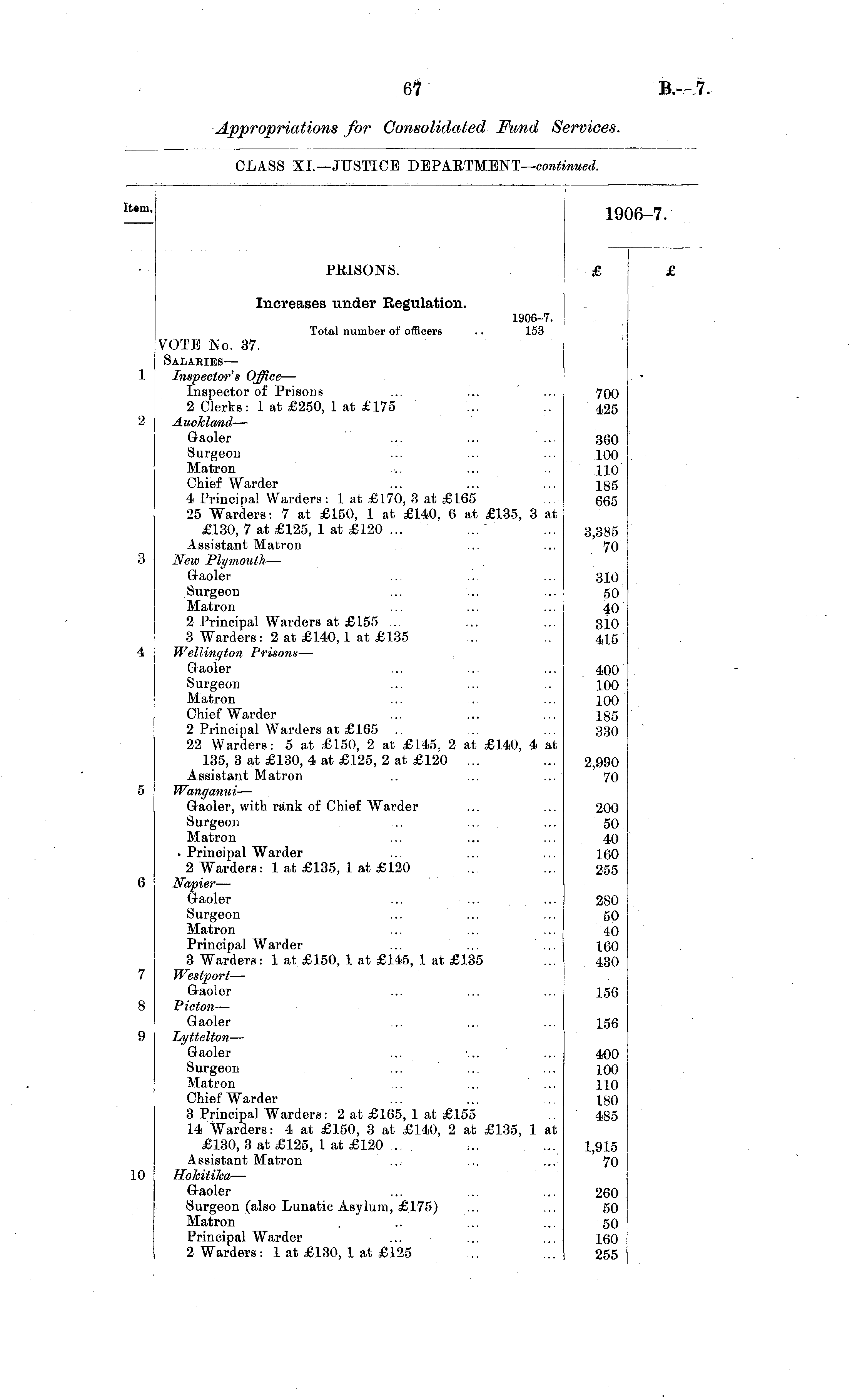 [tarn. 19 '6-7. PRISONS. Increases under Regulation. 1906-7. Total number of officers .. 153 2 VOTE No. 37. Salaries— Inspector's Office — Inspector of Prisons 2 Clerks: 1 at £250, 1 at £175 Auckland — Gaoler ... ... ... Surgeon Matron Chief Warder 4 Principal Warders : 1 at £170, 3 at £165 25 Warders: 7 at £150, 1 at £140, 6 at £135, 3 at £130, 7 at £125, 1 at £120 ... Assistant Matron New Plymouth — Gaoler Surgeon Matron 2 Principal Warders at £155 . 3 Warders: 2 at £140, 1 at £135 Wellington Prisons — Gaoler Surgeon Matron Chief Warder 2 Principal Warders at £165 22 Warders: 5 at £150, 2 at £145, 2 at £140, 4 at 135, 3 at £130, 4 at £125, 2 at £120 ... Assistant Matron Wanganui — Gaoler, with rank of Chief Warder Surgeon Matron Principal Warder 2 Warders: 1 at £135, 1 at £120 Napier — Gaoler ... ... Surgeon Matron ... ... ... Principal Warder 3 Warders: 1 at £150, 1 at £145, 1 at £135 Westport — Gaoler Picton — Gaoler Lyttelton — Gaoler Surgeon Matron Chief Warder 3 Principal Warders: 2 at £165, 1 at £155 14 Warders: 4 at £150, 3 at £140, 2 at £135, 1 at £130, 3 at £125, 1 at £120 ... Assistant Matron Hokitika — Gaoler Surgeon (also Lunatic Asylum, £175) Matron Principal Warder 2 Warders: 1 at £130, 1 at £125 700 425 360 100 110 185 665 3,385 70 310 50 40 310 415 400 100 100 185 330 2,990 70 200 50 40 160 255 6 280 50 40 160 430 7 156 8 9 156 400 100 110 180 485 1,915 70 10 260 50 50 160 255