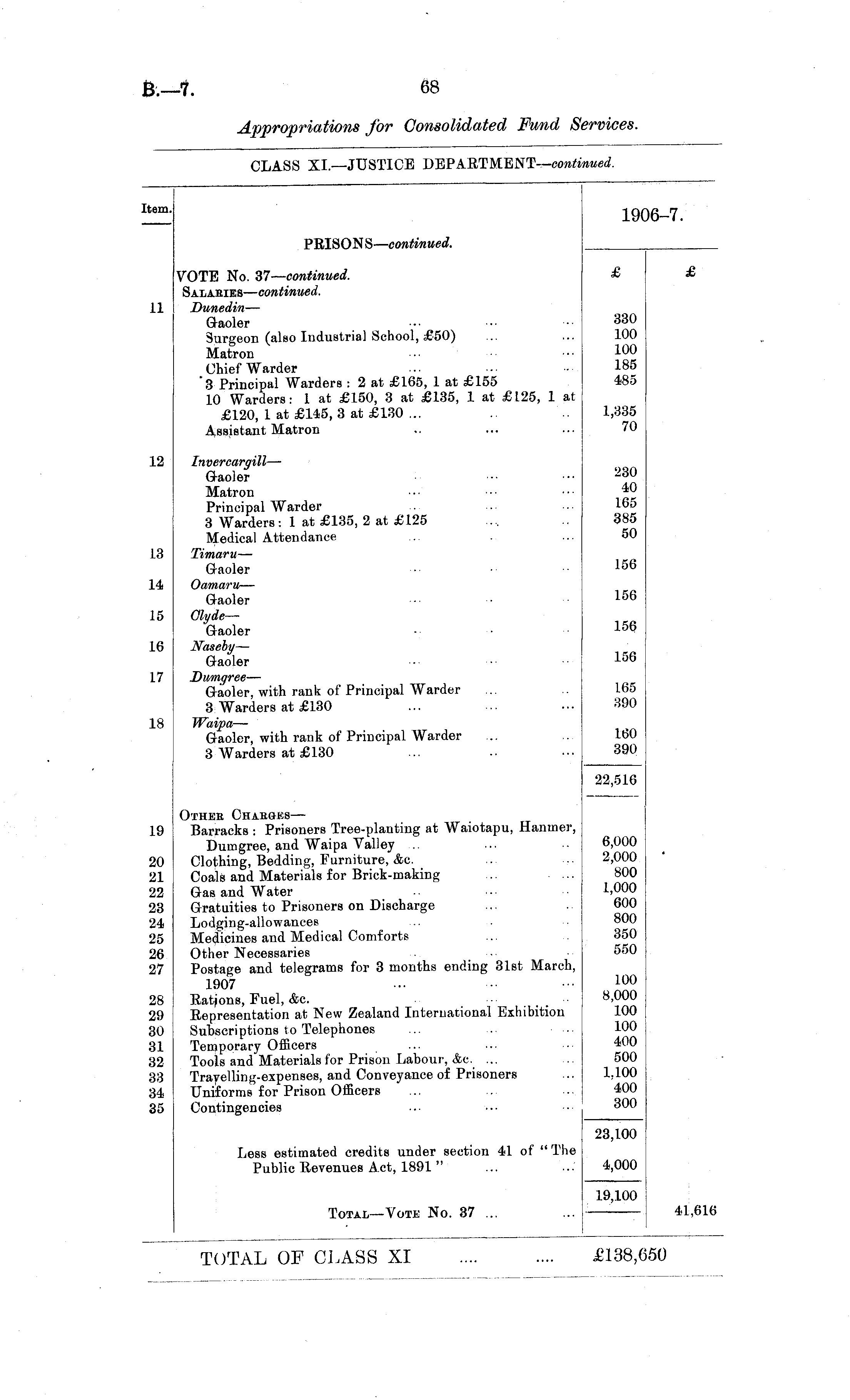 ,em.; 19 i6-7. PRISONS— continued. 11 VOTE No. 37— continued. Salaries — continued. Dunedin — Gaoler Surgeon (also Industrial School, £50) Matron Chief Warder 3 Princinal Warders : 2 at £165, 1 at £155 10 Warders: 1 at £150, 3 at £135, 1 at £125, 1 at £120, 1 at £145, 3 at £130 ... Assistant Matron £ 330 100 100 185 485 1,335 70 12 Invercargill — Gaoler Matron Principal Warder 3 Warders : 1 at £135, 2 at £125 Medical Attendance Timaru — Gaoler 230 40 165 385 50 13 156 14 Oamaru — Gaoler Clyde — Gaoler Naseby — Gaoler 156 15 156 16 156 17 Dumgree — Gaoler, with rank of Principal Warder 3 Warders at £130 Waipa — Gaoler, with rank of Principal Warder 3 Warders at £130 165 390 18 160 390 22,516 19 20 21 22 23 24 25 26 27 Other Charges— Barracks : Prisoners Tree-planting at Waiotapu, Hanmer, Dumgree, and Waipa Valley Clothing, Bedding, Furniture, &c. Coals and Materials for Brick-making ... ... Gas and Water Gratuities to Prisoners on Discharge Lodging-allowances Medicines and Medical Comforts Other Necessaries Postage and telegrams for 3 months ending 31st March, 1907 Rations, Fuel, &c. Representation at New Zealand International Exhibition Subscriptions to Telephones ... ... ■ ... Temporary Officers Tools and Materials for Prison Labour, <&c. ... Travelling-expenses, and Conveyance of Prisoners Uniforms for Prison Officers Contingencies 6,000 2,000 800 1,000 600 800 350 550 28 29 30 31 32 33 34 35 100 8,000 100 100 400 500 1.100 400 300 Less estimated credits under section 41 of " The Public Revenues Act, 1891 " 23,100 4,000 Total—Vote No. 37 ... 19,100 41,61 >F CLASS XI £138 .50