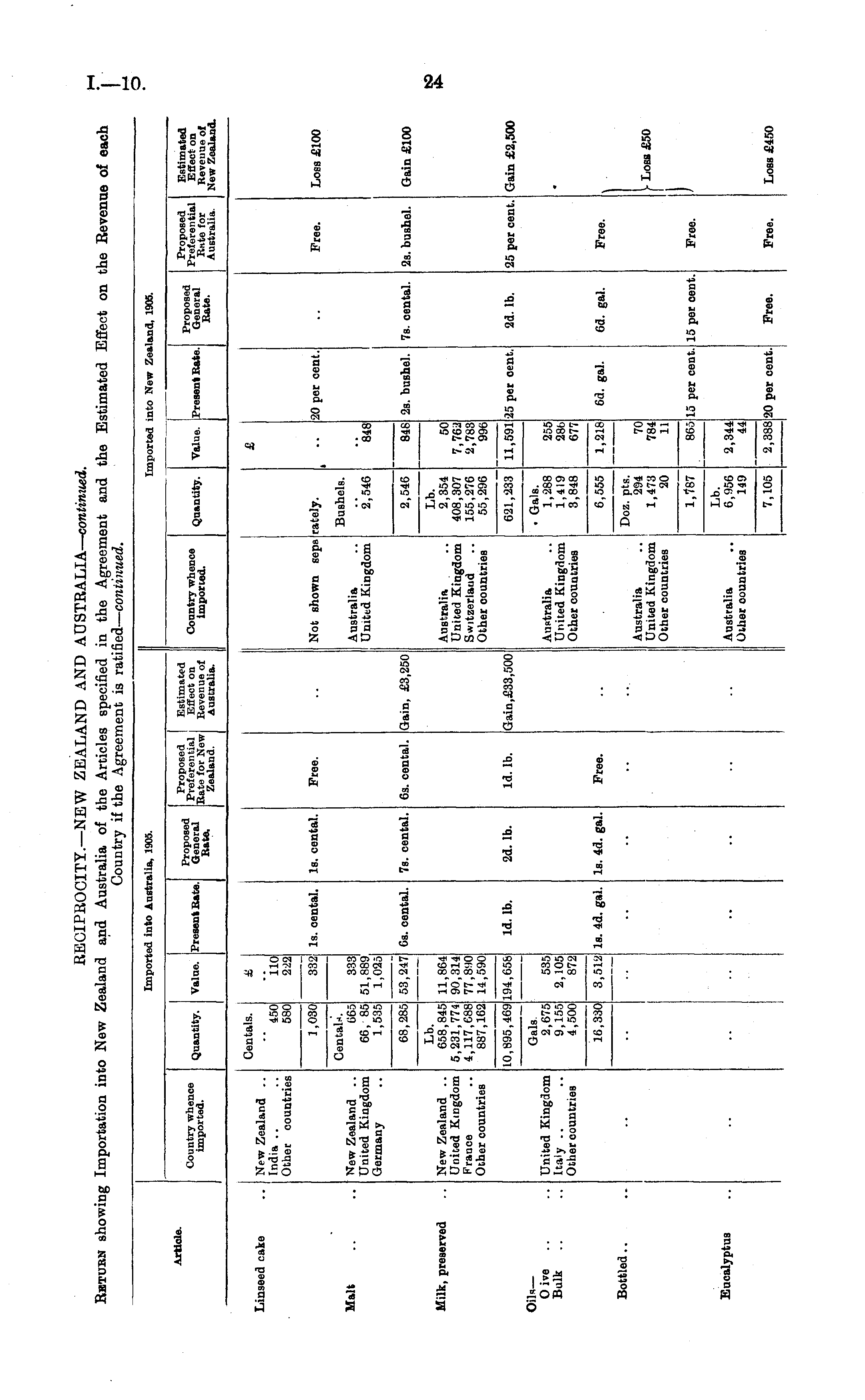 Imported into Australia, 1905. Imported into New Zealand, 1905. Article. Country whence imported. Quantity. Value. Present Rate. Prnr,n«ad Proposed Estimated Preferential Effect on Rata. Bate for New Bevenue of w Zealand. Australia. Prm>nnB<1 Proposed Estimated Country whence 0n . nt itv Value Present Rata General Preferential Effect on imported. Quantity. value, Kate. General Rate for Revenue of ****■ Australia. New Zealand. Centals. £ Linseed cake New Zealand .. India .. Other countries 450 580 "iio 222 1,030 332 Is. cental. Is. cental. Free. New Zealand .. United Kingdom Germany Not shown sepa rately. . • • ■ 20 per cent. Free. Loss £100 Cental*. 665 66, 85 1,535 68,285 Lb. 658,845 5,231,774 4,117,688 887,162 Bushels. . Malt 333 51,889 1,025 53,247 Australia Unittd Kingdom I 848 Milk, preserved 2,546 Lb. 2,354 408,307 155,276 55,296 848 6s. cental. 7s. cental. 6s. cental. Gain, £3,250 2s. bushel. 7s. cental. 2s. bushel. Gain £100 New Zealand .. United Kingdom Prance Other countries 11,864 90,314 77,890 14,590 194,656 Australia United Kingdom Switzerland Other countries 50 7,762 2,783 996 Oils— O ive Bulk .. United Kingdom Italy .. Other oountries 10,895,469 Gals 2,675 9,155 4,500 535 2,105 872 Id. lb. 2d. lb. Id. lb. Gain,£33,500 Australia United Kingdom Other countries 621,233 . Gals. 1,288 1,419 3,848 6,555 11,591 255 28b 677 25 per cent. 2d. lb. 25 per cent. Gain £2,500 Bottled.. 16,330 3,512 Is. 4d. gal. Is. 4d. gal. Free. 1,218 6d. gal. 6d. gal. Free. •• •■ Australia United Kingdom Other countries Doz. pts. 294 1,473 20 70 784 11 Loss £50 Eucalyptus 1,787 Lb. 6,956 149 865 Australia Other countries 15 per cent. 15 per oent. Free. 2,344 44 20 per cent. Free. 7,105 2,388 Free. Loss £450