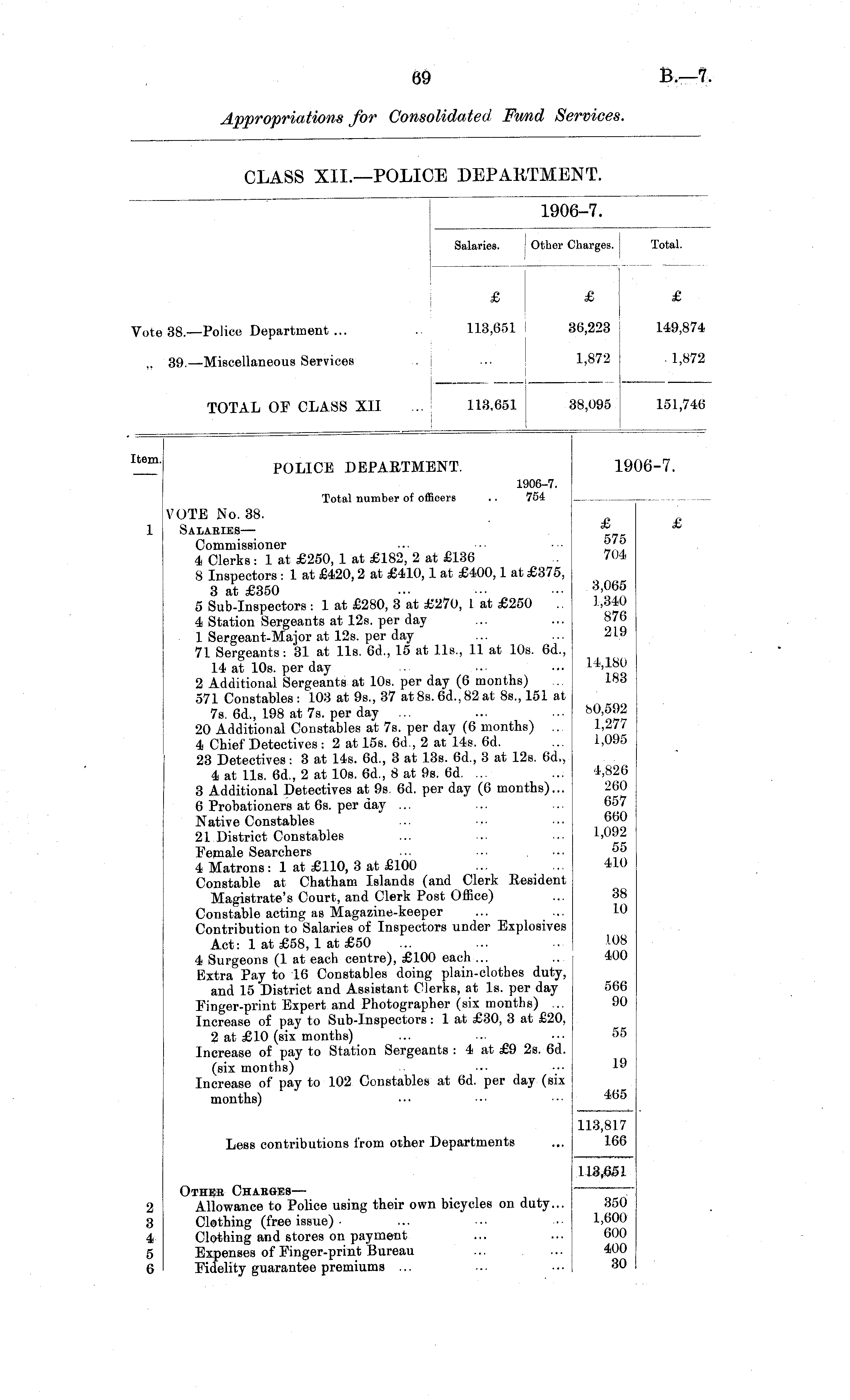 Salaries. Other Charges. Total. £ £ £ £ ote 38.—Police Department ... 113,651 36,223 36,223 149,874 ,, 39. —Miscellaneous Services 1,872 1,872 . 1,872 TOTAL OF CLASS XII 113,651 18,095 151,746 Item. POLICE DEPARTMENT. '6-7. 1906-7. Total number of officers .. 754 VOTE No. 38. Salaries— Commissioner 4 Clerks: 1 at £250, 1 at £182, 2 at £136 8 Inspectors : 1 at £420,2 at £410,1 at £400,1 at £375, 3 at £350 5 Sub-Inspectors : 1 at £280, 3 at £270, 1 at £250 .. 4 Station Sergeants at 12s. per day 1 Sergeant-Major at 12s. per day 71 Sergeants: 31 at lis. 6d., 15 at lis., 11 at 10s. 6d., 14 at 10s. per day 2 Additional Sergeants at 10s. per day (6 months) 571 Constables : 103 at 9s., 37 at 8s. 6d., 82 at 8s., 151 at 7s. 6d., 198 at 7s. per day ... 20 Additional Constables at 7s. per day (6 months) ... 4 Chief Detectives : 2 at 15s. 6d., 2 at 14s. 6d. 23 Detectives: 3 at 14s. 6d., 3 at 13s. 6d., 3 at 12s. 6d., 4 at lis. 6d., 2 at 10s. 6d., 8 at 9s. 6d. ... 3 Additional Detectives at 9s. 6d. per day (6 months)... 6 Probationers at 6s. per day ... Native Constables 21 District Constables Female Searchers 4 Matrons: 1 at £110, 3 at £100 Constable at Chatham Islands (and Clerk Resident Magistrate's Court, and Clerk Post Office) Constable acting as Magazine-keeper Contribution to Salaries of Inspectors under Explosives Act: 1 at £58, 1 at £50 4 Surgeons (1 at each centre), £100 each ... Extra Pay to 16 Constables doing plain-clothes duty, and 15 District and Assistant Clerks, at Is. per day I'inger-print Expert and Photographer (six months) ... Increase of pay to Sub-Inspectors: 1 at £30, 3 at £20, 2 at £10 (six months) Increase of pay to Station Sergeants : 4 at £9 2s. 6d. (six months) Increase of pay to 102 Constables at 6d. per day (six months) £ 575 704 3,065 1,340 876 219 14,180 183 80,592 1,277 1,095 4,826 260 657 660 1,092 55 410 £ 38 10 108 400 566 90 55 19 465 Less contributions from other Departments 113,817 166 Other Charges— Allowance to Police using their own bicycles on duty... Clothing (free issue) ■ Clothing and stores on payment Expenses of Finger-print Bureau Fidelity guarantee premiums ... 113,651 2 3 4 5 6 350 1,600 600 400 30