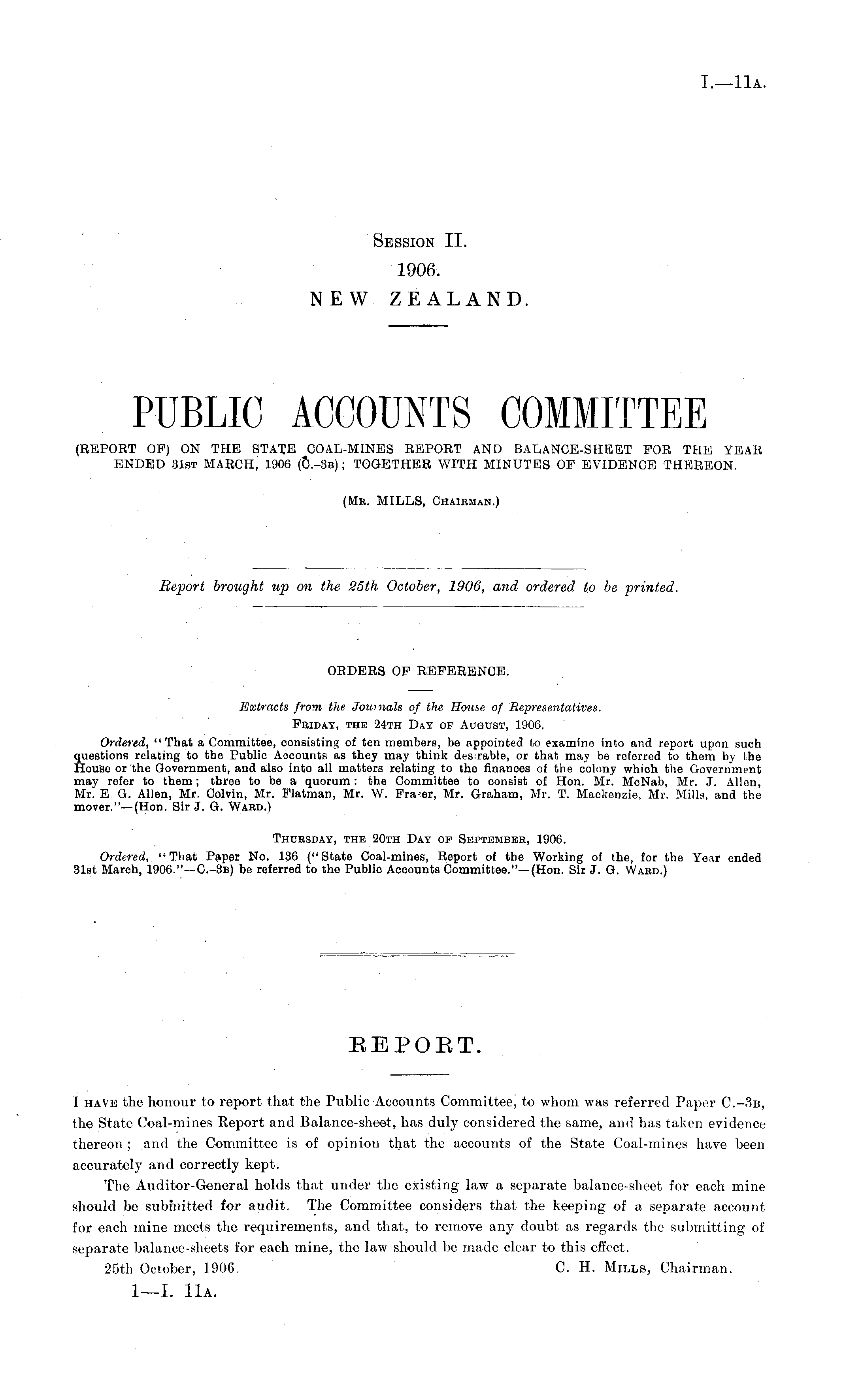 Extracts from the Journals of the House of Representatives. Friday, the 24th Day of August, 190 G. Ordered, "That a Committee, consisting of ten members, be appointed to examine into and report upon such questions relating to the Public Aocounts as thoy may think desirable, or that may be referred to them by the House or the Government, and also into all matters relating to the finances of the colony which the Government may refer to them; three to be a quorum: the Committee to consist of Hon. Mr. MoNab, Mr. J. Allen, Mr. E. G. Allen, Mr. Colvin, Mr. Flatman, Mr. W. Fraer, Mr. Graham, Mr. T. Mackonzie, Mr. Mills, and the mover."—(Hon. Sir J. G. Ward.) Thursday, the 20th Day of September, 1906. Ordered, "That Paper No. 136 ("State Coal-mines, Report of the Working of the, for the Year ended 31st March, 1906."— C.-3b) be referred to the Public Accounts Committee."—(Hon. Sir J. G. Ward.)
