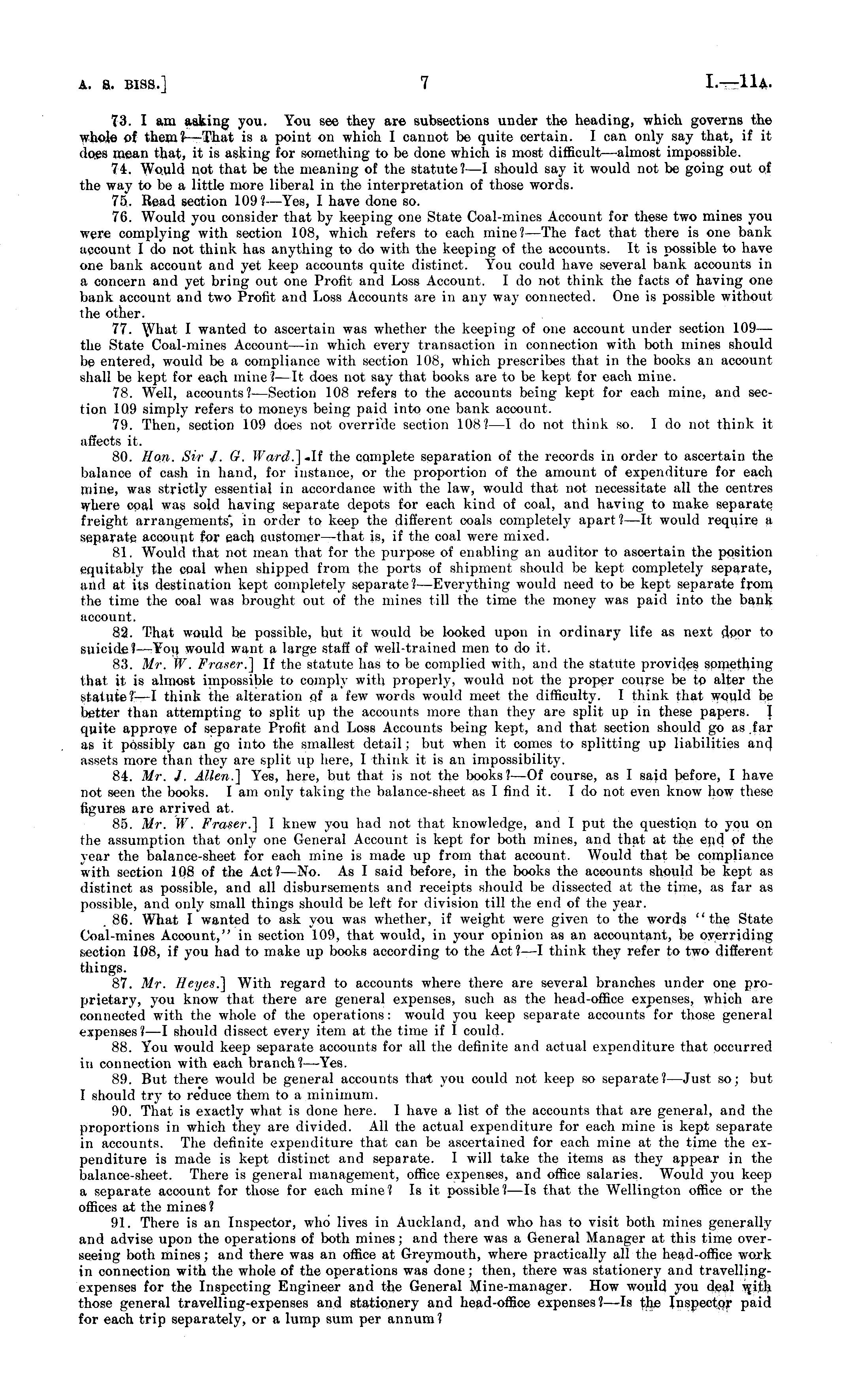 73. I am asking you. You see they are subsections under the heading, which governs the whole of them?' —That is a point on which I cannot be quite certain. I can only say that, if it does mean that, it is asking for something to be done which is most difficult —almost impossible. 74. Would not that be the meaning of the statute ?—I should say it would not be going out of the way to be a little more liberal in the interpretation of those words. 75. Read section 109?— Yes, I have done so. 76. Would you consider that by keeping one State Coal-mines Account for these two mines you were complying with section 108, which refers to each mine?— The fact that there is one bank account Ido not think has anything to do with the keeping of the accounts. It is possible to have one bank account and yet keep accounts quite distinct. You could have several bank accounts in a concern and yet bring out one Profit and Loss Account. Ido not think the facts of having one bank account and two Profit and Loss Accounts are in any waj- connected. One is possible without the other. 77. \Vhat l wanted to ascertain was whether the keeping of one account under section 109— the State Coal-mines Account—in which every transaction in connection with both mines should be entered, would be a compliance with section 108, which prescribes that in the books an account shall be kept for each mine ?—lt does not say that books are to be kept for each mine. 78. Well, accounts?— Section 108 refers to the accounts being kept for each mine, and section 109 simply refers to moneys being paid into one bank account. 79. Then, section 109 does not override section 108?— I do not think so. I do not think it affects it. 80. Hon. Sir J. G. Ward.] -If the complete separation of the records in order to ascertain the balance of cash in hand, for instance, or the proportion of the amount of expenditure for each mine, was strictly essential in accordance with the law, would that not necessitate all the centres where coal was sold having separate depots for each kind of coal, and having to make separate freight arrangements', in order to keep the different coals completely apart ?—lt would require a separate account for each customer —that is, if the coal were mixed. 81. Would that not mean that for the purpose of enabling an auditor to ascertain the position equitably the coal when shipped from the ports of shipment should be kept completely separate, and at its destination kept completely separate?— Everything would need to be kept separate from the time the coal was brought out of the mines till the time the money was paid into the bank account. 82. That would be possible, but it would be looked upon in ordinary life as next door to suicide? —You would want a large staff of well-trained men to do it. 83. Mr. W. Fraser.] If the statute has to be complied with, and the statute provides something that it is almost impossible to comply with properly, would not the proper course be to alter the statute?I—l1 —I think the alteration of a few words would meet the difficulty. I think that would be better than attempting to split up the accounts more than they are split up in these papers. I quite approve of separate Profit and Loss Accounts being kept, and that section should go as far as it possibly can go into the smallest detail; but when it comes to splitting up liabilities and assets more than they are split up here, I think it is an impossibility. 84. Mr. J. Allen.] Yes, here, but that is not the books?—Of course, as I said before, I have not seen the books. lam only taking the balance-sheet as I find it. Ido not even know how these figures are arrived at. 85. Mr. W. Fraser.] I knew you had not that knowledge, and I put the question to you on the assumption that only one General Account is kept for both mines, and that at the end of the year the balance-sheet for each mine is made up from that account. Would that be compliance with section 108 of the Act?— No. As I said before, in the books the accounts should be kept as distinct as possible, and all disbursements and receipts should be dissected at the time, as far as possible, and only small things should be left for division till the end of the year. 86. What I wanted to ask you was whether, if weight were given to the words "the State Coal-mines Account," in section 109, that would, in your opinion as an accountant, be overriding section 108, if you had to make up books according to the Act? —I think they refer to two different things. 87. Mr. Heyes.] With regard to accounts where there are several branches under one proprietary, you know that there are general expenses, such as the head-office expenses, which are connected with the whole of the operations: would you keep separate accounts for those general expenses?—l should dissect every item at the time if I could. 88. You would keep separate accounts for all the definite and actual expenditure that occurred in connection with each branch?— Yes. 89. But there would be general accounts that you could not keep so separate?— Just so; but I should try to reduce them to a minimum. 90. That is exactly what is done here. I have a list of the accounts that are general, and the proportions in which they are divided. All the actual expenditure for each mine is kept separate in accounts. The definite expenditure that can be ascertained for each mine at the time the expenditure is made is kept distinct and separate. I will take the items as they appear in the balance-sheet. There is general management, office expenses, and office salaries. Would you keep a separate account for those for each mine? Is it possible?—ls that the Wellington office or the offices at the mines ? 91. There is an Inspector, who lives in Auckland, and who has to visit both mines generally and advise upon the operations of both mines; and there was a General Manager at this time overseeing both mines; and there was an office at Gr