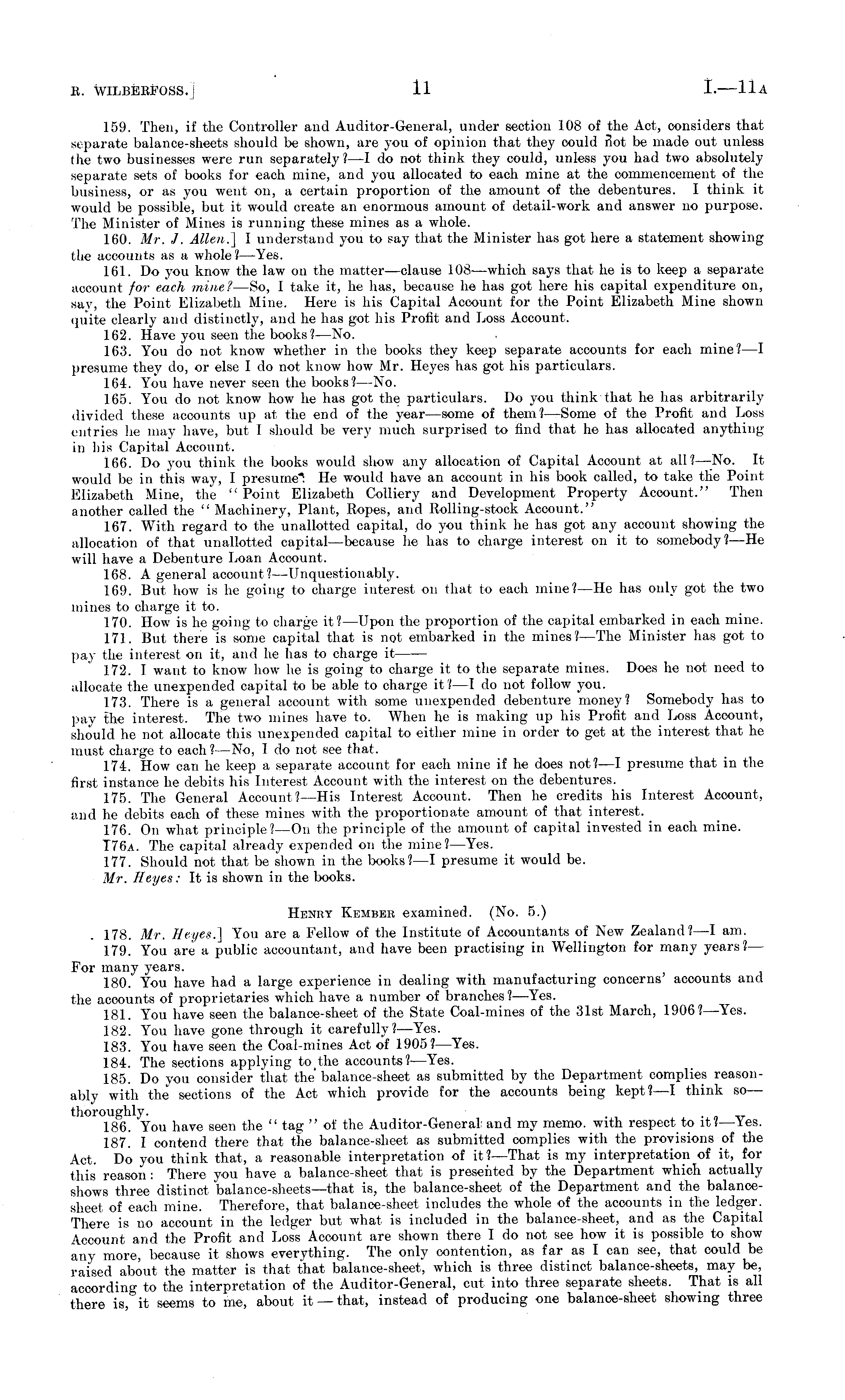 159. Then, if the Controller and Auditor-General, under section 108 of the Act, considers that separate balance-sheets should be shown, are 3-ou of opinion that they could Sot be made out unless the two businesses were run separately? —I do not think they could, unless you had two absolutely separate sets of books for each mine, and you allocated to each mine at the commencement of the business, or as you went on, a certain proportion of the amount of the debentures. I think it would be possible, but it would create an enormous amount of detail-work and answer no purpose. The Minister of Mines is running these mines as a whole. 160. Mr. J. Allen.] 1 understand you to say that the Minister has got here a statement showing the accounts as a whole? —Yes. 161. Do you know the law on the matter —clause 108—which says that he is to keep a separate account for each mine? —So, I take it, he has, because he has got here his capital expenditure on, say, the Point Elizabeth Mine. Here is his Capital Account for the Point Elizabeth Mine shown tpiite clearly and distinctly, and he has got his Profit and Loss Account. 162. Have you seen the books? —No. 163. You do not know whether in the books they keep separate accounts for each mine? —I presume they do, or else I do not know how Mr. Heyes has got his particulars. 164. You have never seen the books?— No. 165. You do not know how lie has got the particulars. Do you think that he has arbitrarily divided these accounts up tit the end of the year —some of them?— Some of the Profit and Loss entries he may have, but I should be very much surprised to find that he has allocated anything in his Capital Account. 166. Do you think the books would show any allocation of Capital Account at all?— No. It would be in this way, I presume*: He would have an account in his book called, to take the Point Elizabeth Mine, the " Point Elizabeth Colliery and Development Property Account." Then another called the " Machinery, Plant, Ropes, and Rolling-stock Account." 167. With regard to the unallotted capital, do you think he has got any account showing the allocation of that unallotted capital—because he has to charge interest on it to somebody? —He will have a Debenture Loan Account. 168. A general account? —Unquestionably. 169. But how is he going to charge interest on that to each mine?—He has only got the two mines to charge it to. 170. How is he going to charge it?— Upon the proportion of the capital embarked in each mine. 171. But there is some capital that is not embarked in the mines? —The Minister has got to pay the interest on it, and he has to charge it 172. I want to know how he is going to charge it to the separate mines. Does he not need to allocate the unexpended capital to be able to charge it?—l do not follow you. 173. There is a general account with some unexpended debenture money? Somebody has to pay the interest. The two mines have to. When he is making up his Profit and Loss Account, should he not allocate this unexpended capital to either mine in order to get at the interest that he must charge to each? —No, I do not see that. 174. How can he keep a separate account for each mine if he does not?—l presume that in the first instance he debits his Interest Account with the interest on the debentures. 175. The General Account?— His Interest Account. Then he credits his Interest Account, and he debits each of these mines with the proportionate amount of that interest. 176. On what principle?—On the principle of the amount of capital invested in each mine. T76a. The capital already expended on the mine?— Yes. 177. Should not that be shown in the books? —I presume it would be. Mr. Heyes: It is shown in the books. Henry Kember examined. (No. 5.) 178. Mr. //ryes.] You are a Fellow of the Institute of Accountants of New Zealand?—l am. 179. You are a public accountant, and have been practising in Wellington for many years? — For many years. 180. You have had a large experience in dealing with manufacturing concerns' accounts and the accounts of proprietaries which have a number of branches ?—Yes. 181. You have seen the balance-sheet of the State Coal-mines of the 31st March, 1906?— Yes. 182. You have gone through it carefully?— Yes. 183. You have seen the Coal-mines Act of 1905?— Yes. 184. The sections applying to the accounts? —Yes. 185. Do you consider that the balance-sheet as submitted by the Department complies reasonably with the" sections of the Act which provide for the accounts being kept?—l think so — thoroughly. . 186. You have seen the " tag " of the Auditor-General and my memo, with respect to it ! —Yes. 187. I contend there that the balance-sheet as submitted complies with the provisions of the Act. Do you think that, a reasonable interpretation of it?— That is my interpretation of it, for this reason : There you have a balance-sheet that is presented by the Department which actually shows three distinct balance-sheets—that is, the balance-sheet of the Department and the balancesheet of each mine. Therefore, that balance-sheet includes the whole of the accounts in the ledger. There is no account in the ledger but what is included in the balance-sheet, and as the Capital Account and the Profit and Loss Account are shown there I do not see how it is possible to show any more, because it shows everything. The only contention, as far as I can see, that could be raised about the matter is that that balance-sheet, which is three distinct balance-sheets, may be, according to the interpretation of the Auditor-General, cut into three separate sheets. That is all there is, it seems to me, about it —that, instead of producing one balance-sheet showing three