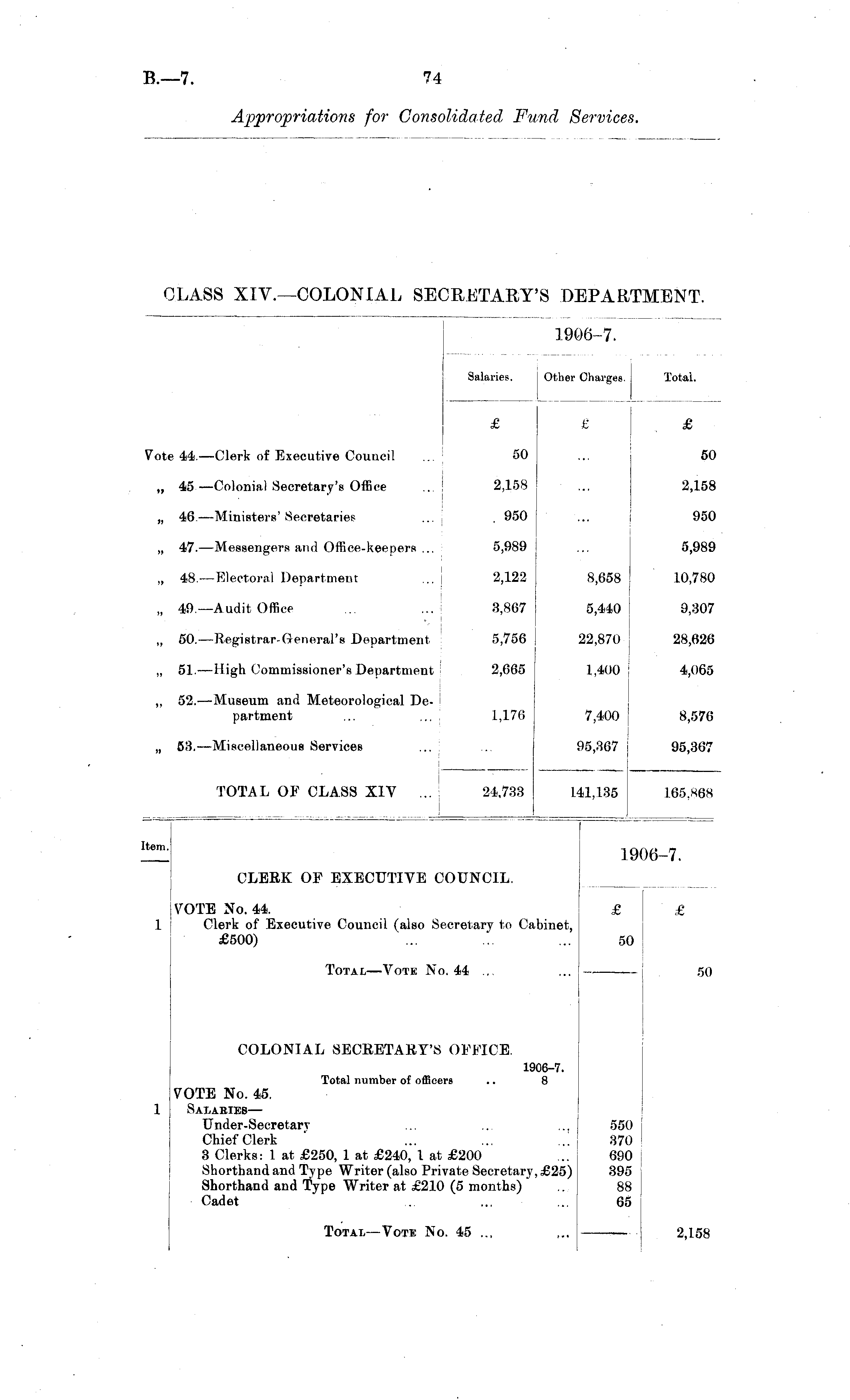 1906-7. Salaries. Other Charges. Total. £ £ £ Vote 44. —Clerk of Executive Council 50 50 „ 45 —Colonial Secretary's Office ... ! 2,158 2,158 „ 46—Ministers'Secretaries . 950 950 „ 47. —Messengers and Office-keepers ... 5,989 5,989 „ 48. —Electoral Department ... j 2,122 8,658 10,780 „ 49—Audit Office 3,867 5,440 9,307 - 22,870 28,626 „ 50. — Registrar-General's Department 5,756 „ 51.—High Commissioner's Department 2,665 1,400 4,065 ,, 52.—Museum and Meteorological Department ... ... | 1,176 7,400 8,576 „ 53. —Miscellaneous Services 95,367 95,367 TOTAL OF CLASS XIV ... 24,733 24,733 141,135 165,868 Item. 19 6-7. CLERK OF EXECUTIVE COUNCIL. VOTE No. 44. Clerk of Executive Council (also Secretary to Cabinet, £500) £ £ 50 50 Total—Vote No. 44 ... COLONIAL SECRETARY'S OFFICE. 1906-7. Total number of officers .. 8 VOTE No. 45. Salaries — Under-Secretarv Chief Clerk 3 Clerks: 1 at £250, 1 at £240, 1 at £200 Shorthand and Type Writer (also Private Secretary, £25) Shorthand and Type Writer at £210 (5 months) Cadet 550 370 690 395 88 65 Total—Vote No. 45 .., 2,158