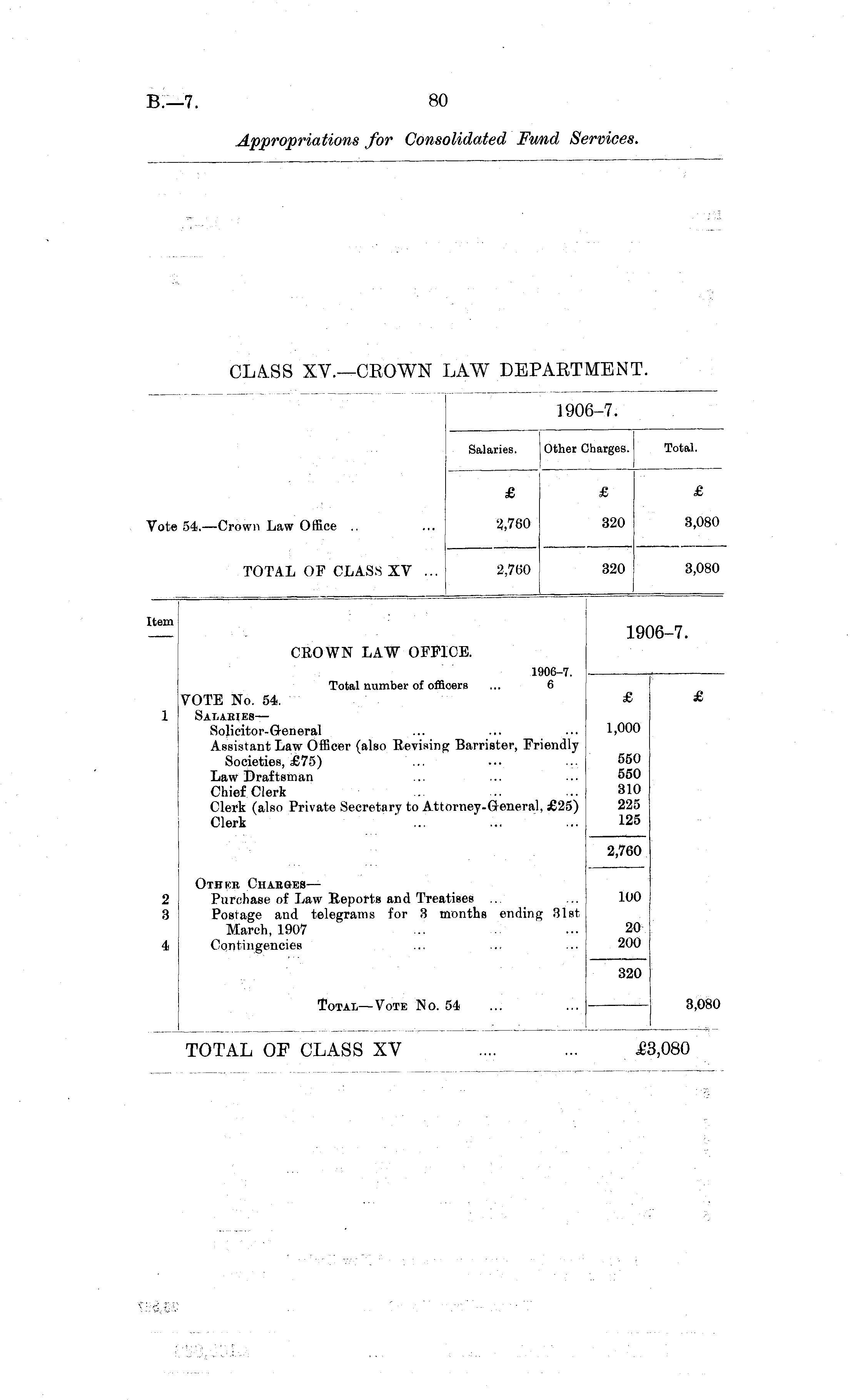 1906-7. Salaries. Other Charges. Total. £ £ £ ote 54.—Crown Law Office .. 2,780 320 3,080 TOTAL OF CLASS XV 2,760 320 3,080 ■ Item 19 16-7. CROWN LAW OFFICE. 1906-7. Total number of officers ... 6 VOTE No. 54. Salaries — Solicitor-General Assistant Law Officer (also Revising Barrister, Friendly Societies, £75) Law Draftsman Chief Clerk Clerk (also Private Secretary to Attorney-General, £25) Clerk £ 1,000 550 550 310 225 125 2,760 2 3 Oth kr Charges— Purchase of Law Reports and Treatises ... Postage and telegrams for 3 months ending 31st March, 1907 Contingencies 100 20 200 4 320 Total—Vote No. 54 3,080 TOTAL OF CLASS XV ;,080