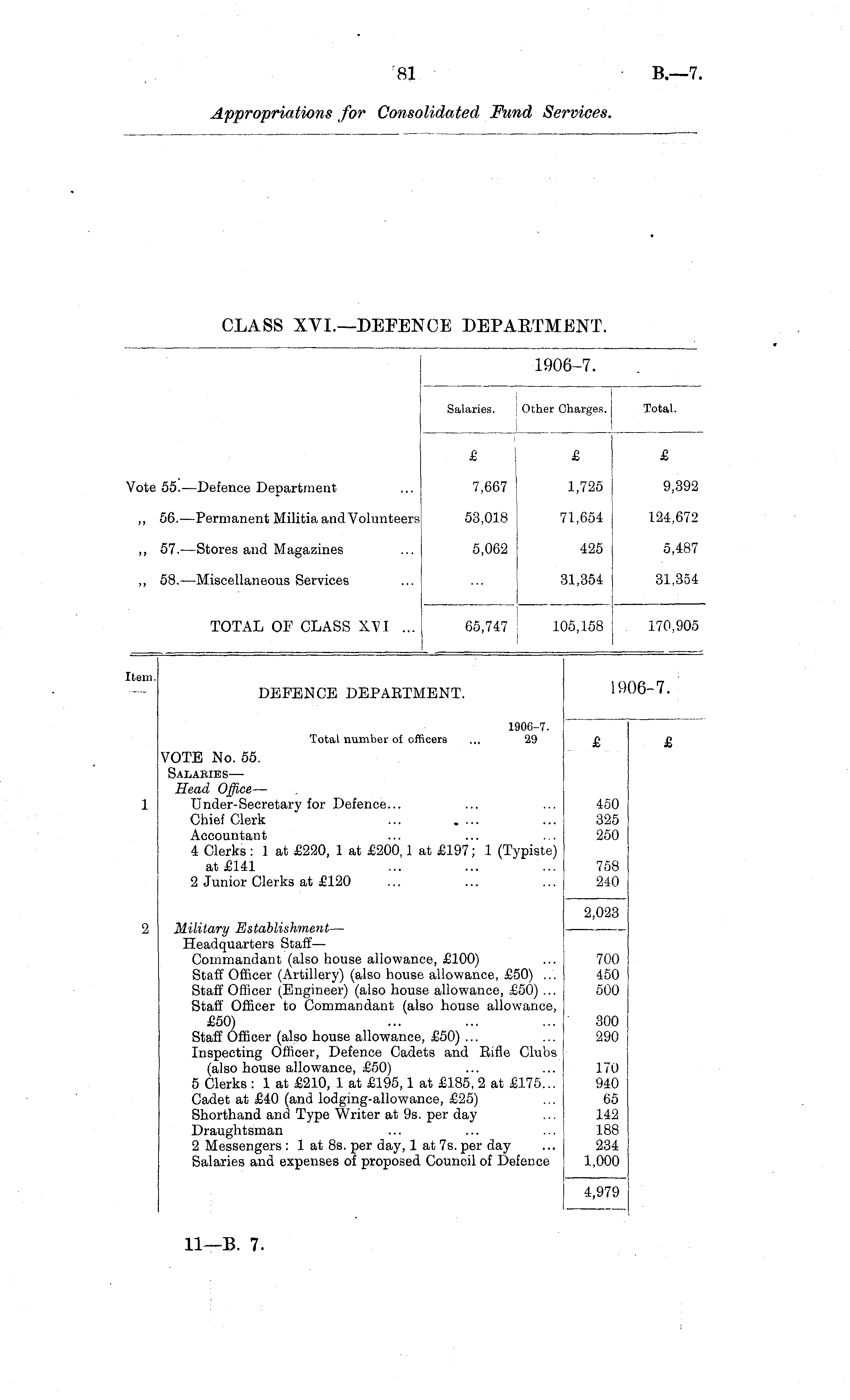 1906-7. Salaries. Other Charges. i Total. £ £ £ ote 55. —Defence Department 7,667 1,725 9,392 ,, 56.—Permanent Militia and Volunteers 53,018 71,654 124,672 ,, 57. —Stores and Magazines 5,062 425 5,487 ,, 58. —Miscellaneous Services 31,354 31,354 TOTAL OF CLASS XVI. ... 65,747 15,158 170,90, Item. 1906-7. DEFENCE DEPARTMENT. 1906-7. Total number of officers ... 29 VOTE No. 55. Salaries— Head Office — Under-Secretary for Defence... Chief Clerk Accountant 4 Clerks : 1 at £220, 1 at £200,1 at £197; 1 (Typiste) at £141 2 Junior Clerks at £120 £ 450 325 250 758 240 Military Establishment — Headquarters Staff— Commandant (also house allowance, £100) Staff Officer (Artillery) (also house allowance, £50) ..'. Staff Officer (Engineer) (also house allowance, £50) ... Staff Officer to Commandant (also house allowance, £50) Staff Officer (also house allowance, £50) ... Inspecting Officer, Defence Cadets and Rifle Clubs (also house allowance, £50) 5 Clerks : 1 at £210, 1 at £195,1 at £185, 2 at £175... Cadet at £40 (and lodging-allowance, £25) Shorthand and Type Writer at 9s. per day Draughtsman 2 Messengers : 1 at 8s. per day, 1 at 7s. per day Salaries and expenses of proposed Council of Defence 2,023 700 450 500 300 290 170 940 65 142 188 234 1,000 4,979