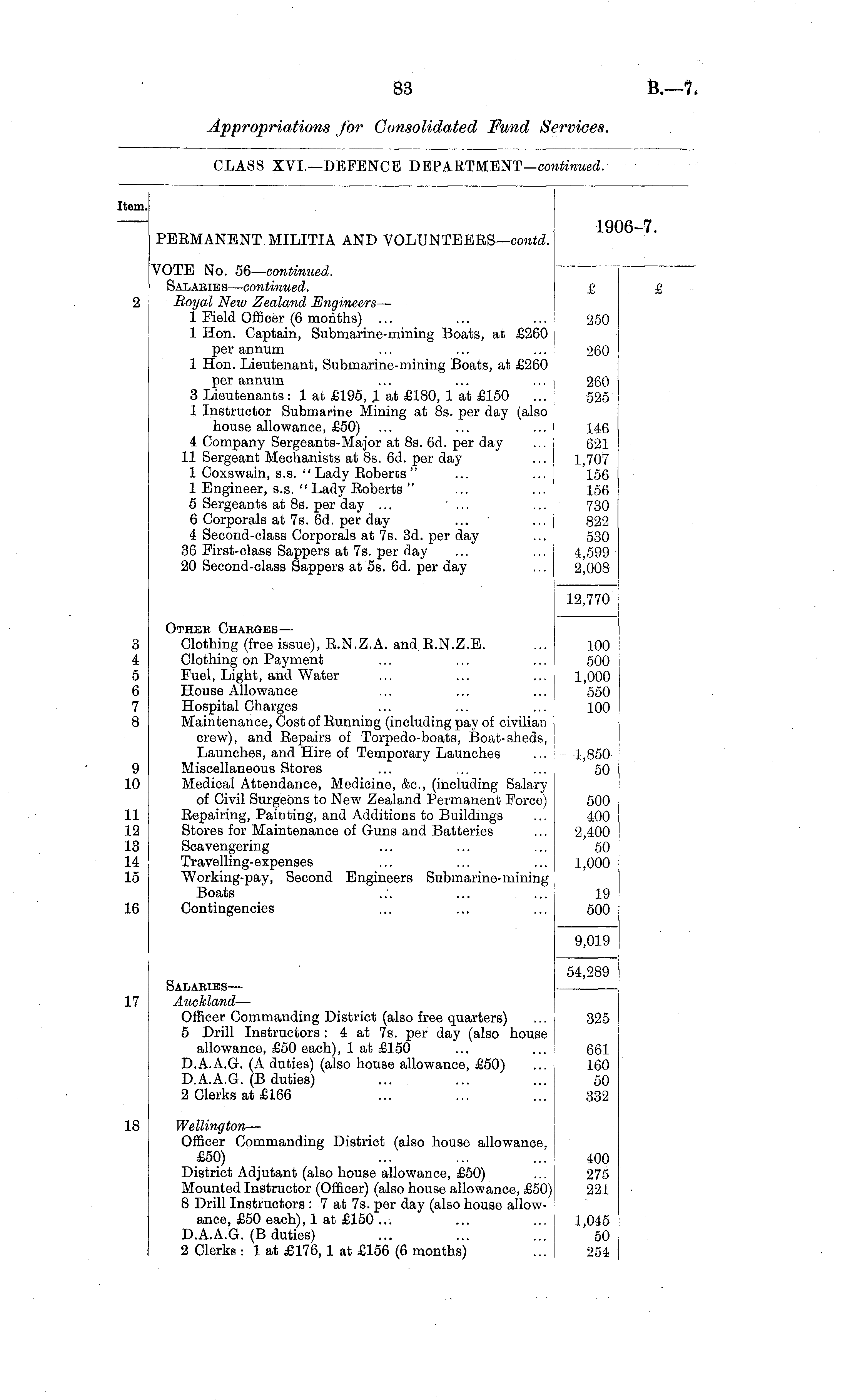 *m. PERMANENT MILITIA AND VOLUNTEERS— contd. 19' i6-7. VOTE No. 56— continued. Salaries— continued. Royal New Zealand Engineers — 1 Field Officer (6 months) ... 1 Hon. Captain, Submarine-mining Boats, at £260 per annum 1 Hon. Lieutenant, Submarine-mining Boats, at £260 £ 250 260 per annum 3 Lieutenants: 1 at £195, 1 at £180, 1 at £150 ... 1 Instructor Submarine Mining at 8s. per day (also house allowance, £50) 4 Company Sergeants-Major at 8s. 6d. per day 11 Sergeant Mechanists at 8s. 6d. per day 1 Coxswain, s.s. "Lady Roberts" 1 Engineer, s.s. " Lady Roberts " 5 Sergeants at 8s. per day ... "... 6 Corporals at 7s. 6d. per day 4 Second-class Corporals at 7s. 3d. per day 36 First-class Sappers at 7s. per day 20 Second-class Sappers at 5s. 6d. per day 260 525 146 621 1,707 156 156 730 822 530 4,599 2,008 12,770 9 10 3 4 5 6 7 8 Other Charges— Clothing (free issue), R.N.Z.A. and R.N.Z.E. Clothing on Payment Fuel, Light, and Water House Allowance Hospital Charges Maintenance, Cost of Running (including pay of civilian crew), and Repairs of Torpedo-boats, Boat-sheds, Launches, and Hire of Temporary Launches Miscellaneous Stores Medical Attendance, Medicine, &c, (including Salary of Civil Surgeons to New Zealand Permanent Force) Repairing, Painting, and Additions to Buildings Stores for Maintenance of Guns and Batteries Scavengering Travelling-expenses Working-pay, Second Engineers Submarine-mining Boats Contingencies 100 500 1,000 550 100 1,850 50 11 12 13 14 15 500 400 2,400 50 1,000 16 19 500 9,019 54,289 17 Salaries — Auckland — Officer Commanding District (also free quarters) 5 Drill Instructors : 4 at 7s. per day (also house allowance, £50 each), 1 at £150 D.A.A.G. (A duties) (also house allowance, £50) D.A.A.G. (B duties) 2 Clerks at £166 325 661 160 50 332 18 Wellington — Officer Commanding District (also house allowance, £50) District Adjutant (also house allowance, £50) Mounted Instructor (Officer) (also house allowance, £50) 8 Drill Instructors : 7 at 7s. per day (also house allowance, £50 each), 1 at £150 ... D.A.A.G. (B duties) 2 Clerks : 1 at £176,1 at £156 (6 months) 400 275 221 1,045 50 254