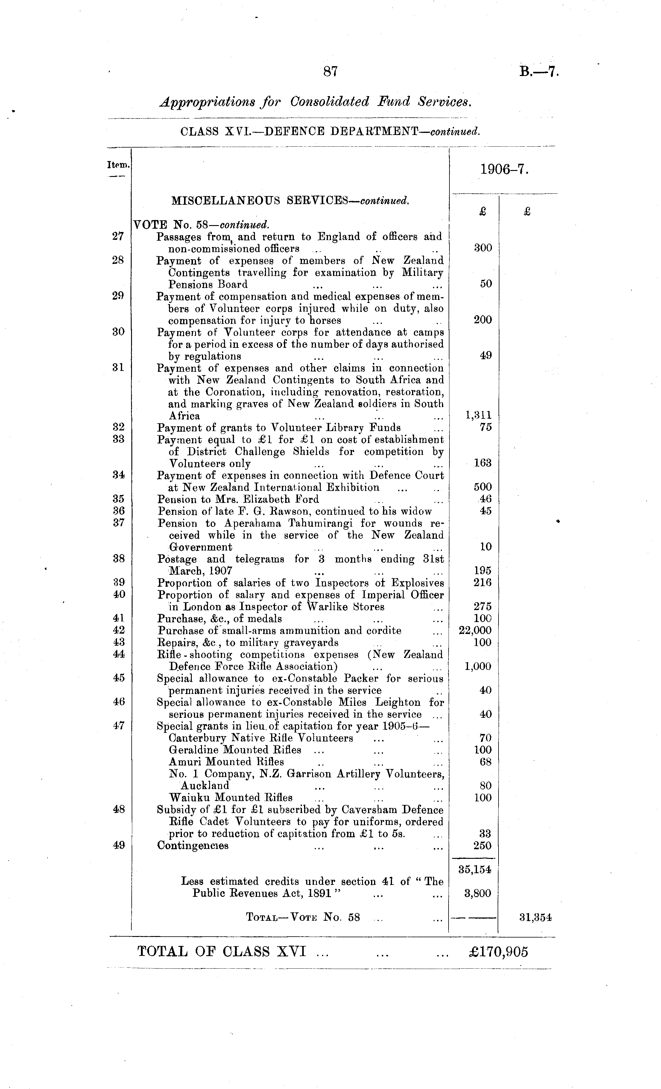 Item. 19 '6-7. MISCELLANEOUS SERVICES— continued. £ £ 27 28 29 30 31 32 33 34 35 36 37 VOTE No. 58— continued. Passages from, and return to England of officers and non-commissioned officers Payment of expenses of members of New Zealand Contingents travelling for examination by Military Pensions Board Payment of compensation and medical expenses of members of Volunteer corps injured while on duty, also compensation for injury to horses Payment of Volunteer corps for attendance at camps for a period in excess of the number of days authorised by regulations Payment of expenses and other claims in connection with New Zealand Contingents to South Africa and at the Coronation, including renovation, restoration, and marking graves of New Zealand soldiers in South Africa Payment of grants to Volunteer Library Funds Payment equal to £1 for £1 on cost of establishment of District Challenge Shields for competition by Volunteers only Payment of expenses in connection with Defence Court at New Zealand International Exhibition Pension to Mrs. Elizabeth Ford Pension of late F. G. Rawson, continued to his widow Pension to Aperahama Tahumirangi for wounds received while in the service of the New Zealand Government Postage and telegrams for 3 months ending 31st March, 1907 Proportion of salaries of two Inspectors of Explosives Proportion of salary and expenses of Imperial Officer in London as Inspector of Warlike Stores Purchase, &c, of medals Purchase of small-arms ammunition and cordite Repairs, &c , to military graveyards Rifle - shooting competitions expenses (New Zealand Defence Force Rifle Association) Special allowance to ex-Constable Packer for serious permanent injuries received in the service Special allowance to ex-Constable Miles Leighton for serious permanent injuries received in the service ... Special grants in lieu, of capitation for year 1905-6 — Canterbury Native Rifle Volunteers Geraldine Mounted Rifles ... Amuri Mounted Rifles No. 1 Company, N.Z. Garrison Artillery Volunteers, Auckland Waiuku Mounted Rifles Subsidy of £1 for £1 subscribed by Caversham Defence Rifle Cadet Volunteers to pay for uniforms, ordered prior to reduction of capitation from £1 to 5s. Contingencies 1,311 75 163 500 46 45 10 300 50 200 49 « 38 195 216 39 40 4! 42 43 44 275 100 22,000 100 45 1,000 46 40 17 40 70 100 68 80 100 48 33 250 49 Less estimated credits under section 41 of " The Public Revenues Act, 1891 " 35,154 3,800 Total—Vote No. 58 ... 31,354 TOTAL OF CLASS XVI £17' ,905