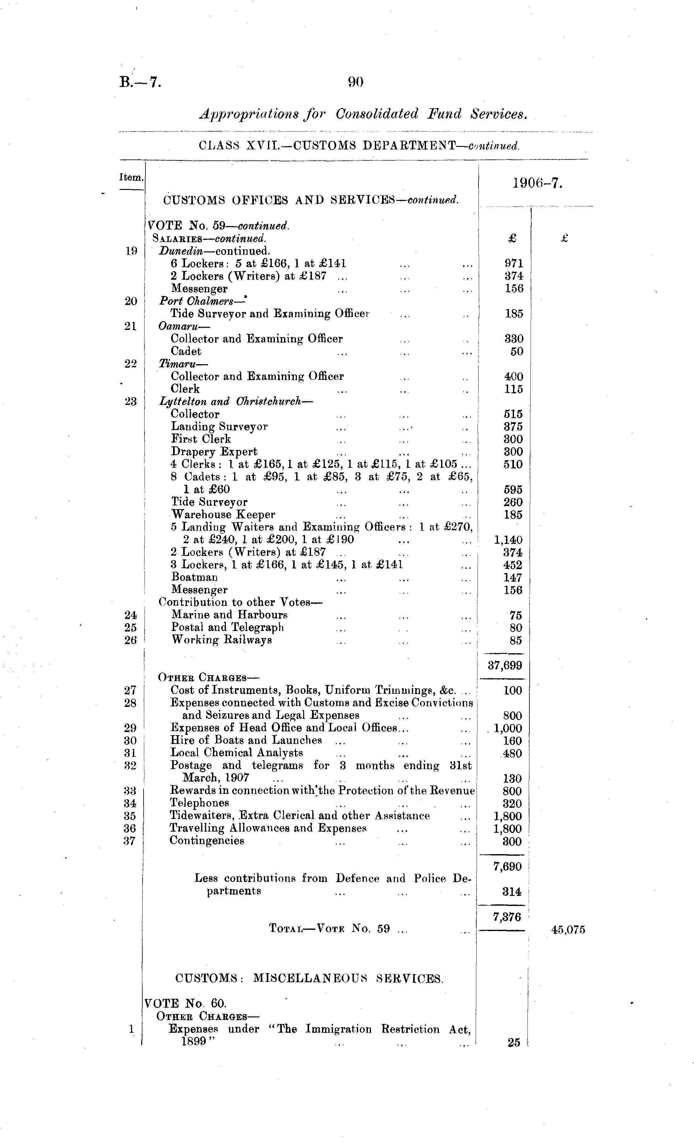 ;em. 19 '6-7. CUSTOMS OFFICES AND SERVICES— continued. 1!) VOTE No. 59—continued. Salaries— continued. Dunedin —continued. 6 Lockers: 5 at £166, 1 at £141 2 Lockers (Writers) at £187 ... Messenger Port Chalmers —* Tide Surveyor and Examining Officer £ 971 374 156 t 20 185 21 Oamaru — Collector and Examining Officer Cadet Timaru — Collector and Examining Officer Clerk Lyttelton and Christchurch — Collector Landing Surveyor First Clerk Drapery Expert 4 Clerks: 1 at £165,1 at £125, 1 at £115, 1 at £105... 8 Cadets : 1 at £95, 1 at £85, 3 at £75, 2 at £65, lat£60 Tide Surveyor Warehouse Keeper 5 Landing Waiters and Examining Officers : 1 at £270, 2 at £240, 1 at £200, 1 at £190 2 Lockers (Writers) at £187 ... 3 Lockers, I at £166, 1 at £145, 1 at £141 Boatman Messenger Contribution to other Votes— Marine and Harbours Postal and Telegraph Working Railways 330 50 22 400 115 23 515 375 300 300 510 595 260 185 1,140 374 452 147 156 24 25 26 75 80 85 Other Charges— Cost of Instruments, Books, Uniform Trimmings, &c. .. Expenses connected with Customs and Excise Convictions and Seizures and Legal Expenses Expenses of Head Office and Local Offices... Hire of Boats and Launches ... Local Chemical Analysts Postage and telegrams for 3 months ending 31st March, 1907 Rewards in connection with'the Protection of the Revenue Telephones Tidewaiters, Extra Clerical and other Assistance Travelling Allowances and Expenses Contingencies 37,699 27 28 100 29 30 31 32 800 i . 1,000 160 480 33 34 35 36 37 130 800 320 1,800 1,800 300 Less contributions from Defence and Police Departments 7,690 314 Total—Vote No. 59 ... 7,376 45,07? CUSTOMS: MISCELLANEOUS SERVICES. VOTE No 60. Other Charges— Expenses under "The Immigration Restriction Act, 1899" 1 25