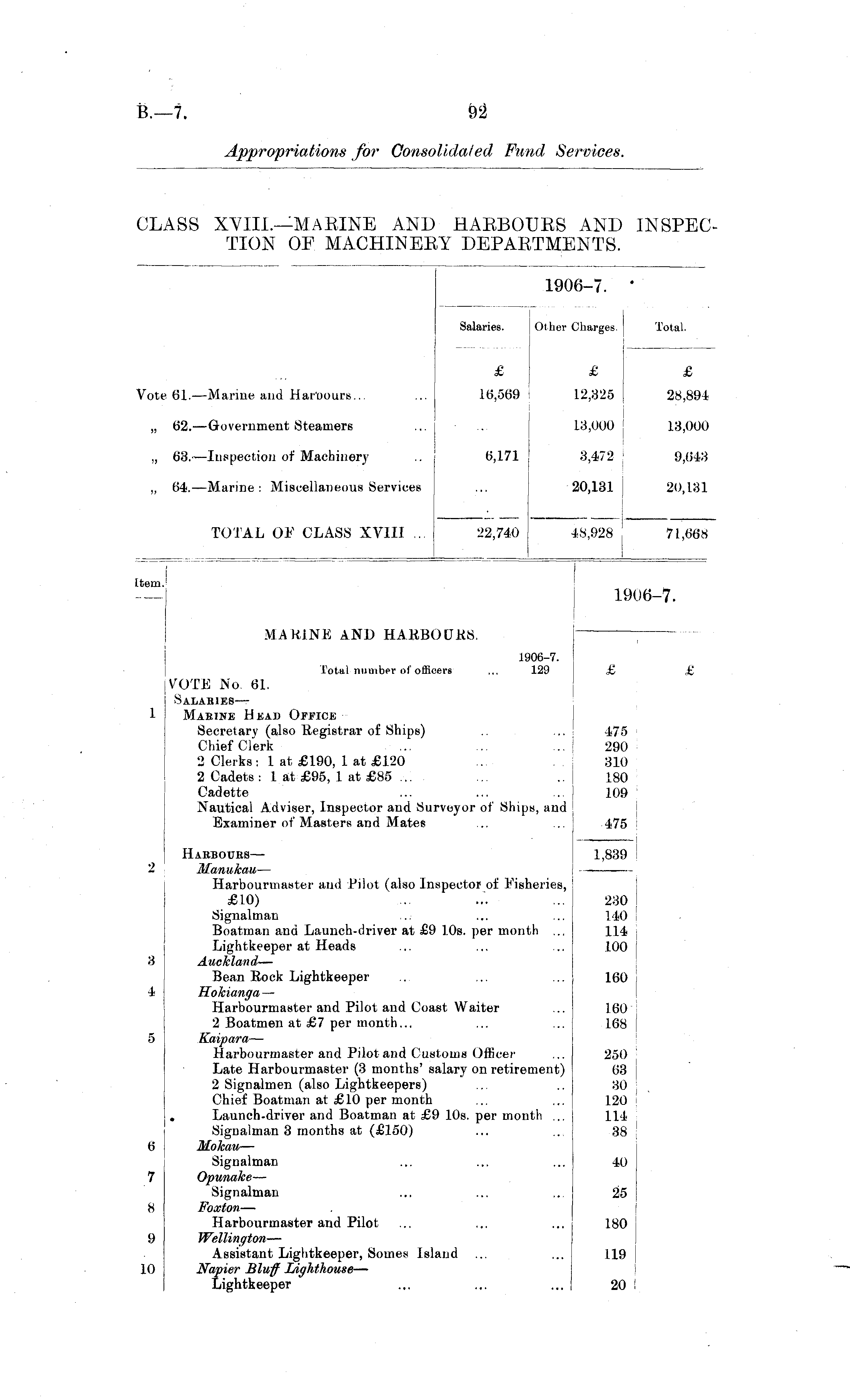 19( 1906-7. . Salaries. Other £ Salaries. Other Charges. Total. £ £ £ ote 61. —Marine and Har'oours... ... 16,569 16,569 12,325 28,894 „ 62. —Government Steamers 13,000 13,000 „ 63.—Inspection of Machinery 6,171 6,171 3,472 9,643 ,, 64. —Marine : Miscellaneous Services 20,131 20,131 TOTAL OF CLASS XVIII ... 22,740 22,740 48,928 71,668 Item. _ ,. _ 1 em. 1906-7. MARINE AND HARBOURS. 1906-7. Total number of officers ... 129 £ £ VOTE No 61. Salaries— 1 Marine H ead Office Secretary (also Registrar of Ships) Chief Clerk 2 Clerks : 1 at £190, 1 at £120 2 Cadets : 1 at £95, 1 at £85 ... Cadette Nautical Adviser, Inspector and Surveyor of Ships, and Examiner of Masters and Mates 475 290 310 180 109 ■ 475 Harbours— 2 Manukau — Harbourmaster and Pilot (also Inspector of Fisheries, £10) Signalman Boatman and Launch-driver at £9 10s. per month ... Lightkeeper at Heads 3 Auckland — Bean Rock Lightkeeper 4 Hokianga — Harbourmaster and Pilot and Coast Waiter 2 Boatmen at £7 per month... 5 Kaipara — Harbourmaster and Pilot and Customs Officer Late Harbourmaster (3 months' salary on retirement) 2 Signalmen (also Lightkeepers) Chief Boatman at £10 per month Launch-driver and Boatman at £9 10s. per month ... Signalman 3 months at (£150) 6 Mokau — Signalman 7 Opunake — Signalman 8 Foxton — Harbourmaster and Pilot 9 Wellington — Assistant Lightkeeper, Somes Island .0 Napier Bluff Lighthouse — Lightkeeper 1,839 2 230 140 114 100 3 4 160 160 168 250 63 30 120 114 38 6 40 7 25 8 9 180 119 10 20