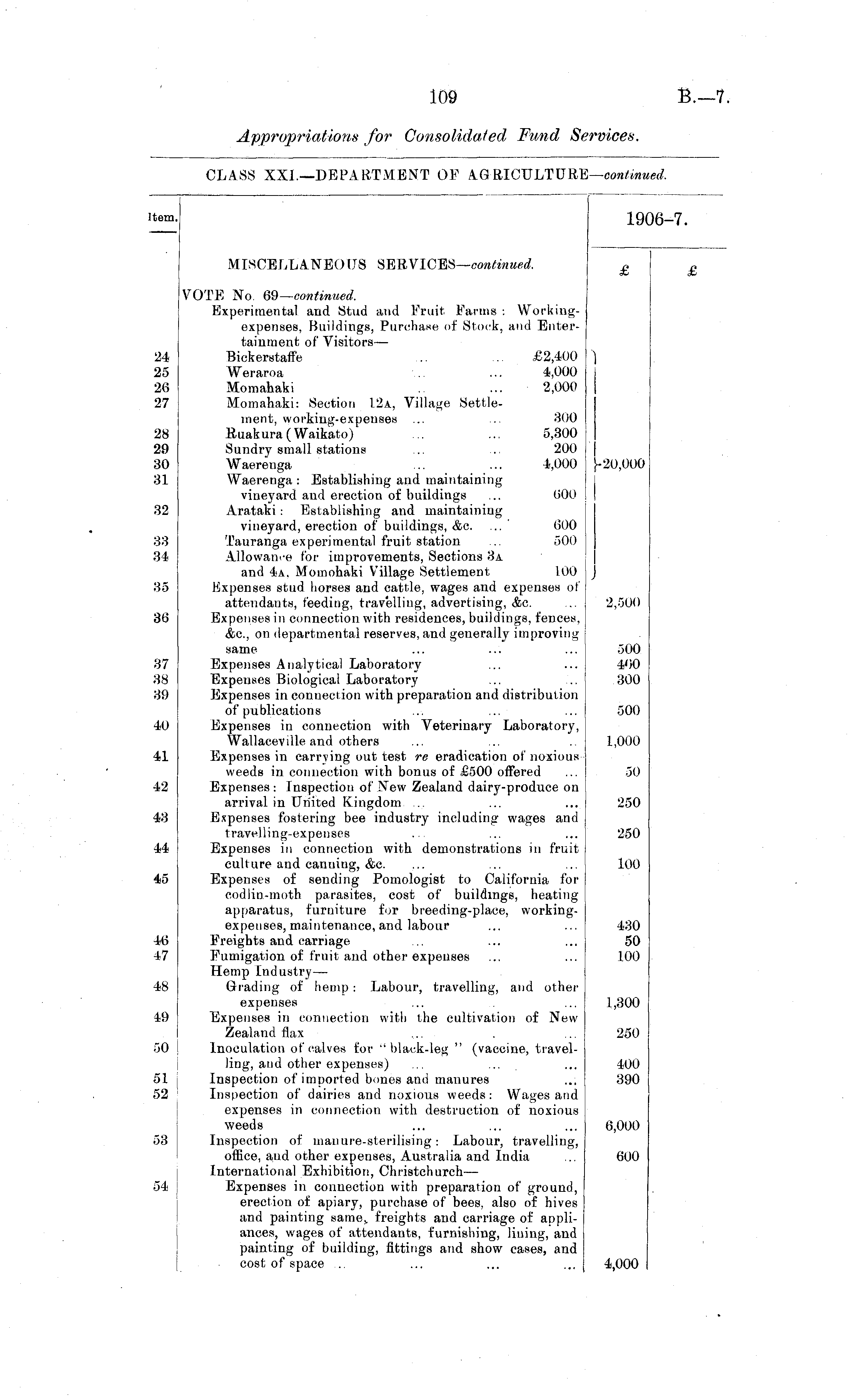 iem. MISCELLANEOUS SERVICES— continued. 24 25 26 27 28 29 30 31 VOTE No. 69— continued. Experimental and Stud and Fruit, Farms : Workingexpenses, Buildings, Purchase of Stock, and Entertainment of Visitors — Bickerstaffe ... ... £2,400 Weraroa ... 4,000 Momahaki ... ... 2,000 Momahaki: Section 12a, Village Settlement, working-expenses ... ... 300 Ruakura(Waikato) ... ... 5,300 Sundry small stations ... ... 200 Waerenga ... ... 4,000 Waerenga : Establishing and maintaining vineyard and erection of buildings ... 600 Arataki : Establishing and maintaining vineyard, erection of buildings, &c. ... ' 600 Tauranga experimental fruit station ... 500 Allowance for improvements, Sections 3a and 4a, Momohaki Village Settlement 100 Expenses stud horses and cattle, wages and expenses of attendants, feeding, travelling, advertising, &c. Expenses in connection with residences, buildings, fences, &c, on departmental reserves, and generally improving same 20,000 32 33 34 35 36 2,500 37 38 39 Expenses Analytical Laboratory Expenses Biological Laboratory Expenses in connection with preparation and distribution of publications Expenses in connection with Veterinary Laboratory, Wallaceville and others Expenses in carrving out test re eradication of noxious weeds in connection with bonus of £500 offered Expenses : Inspection of New Zealand dairy-produce on arrival in United Kingdom ... Expenses fostering bee industry including wages and travelling-expenses Expenses in connection with demonstrations in fruit culture and canning, &c. Expenses of sending Pomologist to California for codlin-moth parasites, cost of buildings, heating apparatus, furniture for breeding-place, workingexpenses, maintenance, and labour Freights and carriage Fumigation of fruit and other expenses Hemp Industry— Grading of hemp : Labour, travelling, and other expenses Expenses in connection with the cultivation of New Zealand flax Inoculation of calves for "black-leg " (vaccine, travelling, and other expenses) Inspection of imported bones and manures Inspection of dairies and noxious weeds: Wages and expenses in connection with destruction of noxious weeds Inspection of manure-sterilising: Labour, travelling, office, and other expenses, Australia and India International Exhibition, Christchurch— Expenses in connection with preparation of ground, erection of apiary, purchase of bees, also of hives and painting same, freights and carriage of appliances, wages of attendants, furnishing, lining, and painting of building, fittings and show cases, and cost of space ... 500 400 300 40 500 41 1,000 42 -50 43 250 44 250 100 45 46 47 430 50 100 IS 1,300 1:9 :,0 250 51 52 400 390 6,000 53 600 r,i 4,000