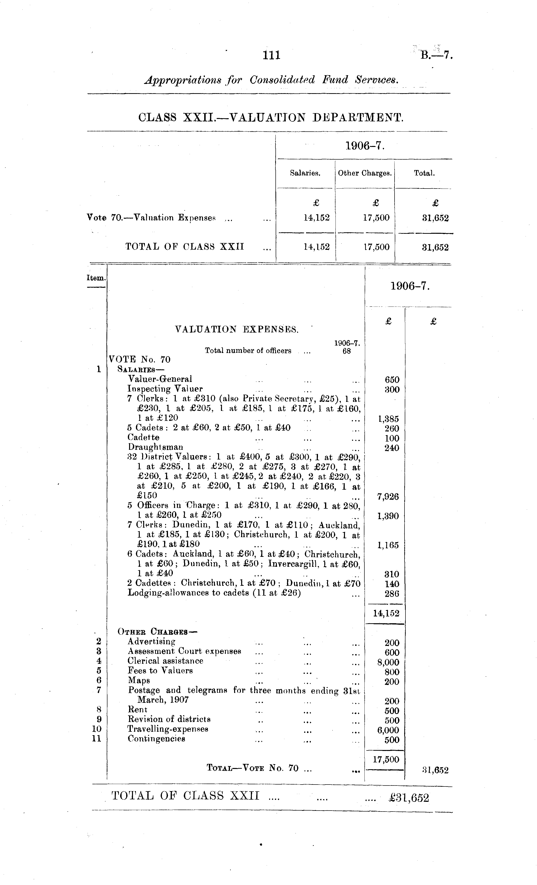 1906-7. Salaries. Other Charges. Total. ote 70. —Valuation Expenses ... £ 14,152 £ 7,500 £ 31,652 TOTAL OF CLASS XXII 14,152 7,500 31,652 .tern. 19 '6-7. £ £ VALUATION EXPENSES. ' 1906-7. Total number of officers ... 68 VOTE No. 70 Salaries — Valuer-General Inspecting Valuer 7 Clerks: 1 at £310 (also Private Secretary, £25), 1 at £230, 1 at £205, 1 at £185, 1 at £175, 1 at, £160, 1 at £120 ... 5 Cadets : 2 at £60, 2 at £50, I at £40 ... Cadette Draughtsman 32 District Valuers: 1 at £400, 5 at £300, 1 at £290, 1 at £285, 1 at £280, 2 at £275, 3 at £270, 1 at £260, 1 at £250, 1 at £245, 2 at £240, 2 at £220, 3 at £210, 5 at £200, 1 at £190, 1 at £166, 1 at £150 5 Officers in Charge: 1 at £310. 1 at £290, 1 at 280, 1 at £260, 1 at £250 7 Clerks: Dunedin, 1 at £170, 1 at £110; Auckland, 1 at £185, 1 at £130; Christchurch, 1 at £200, 1 at £190,1 at £180 6 Cadets: Auckland, 1 at £60, 1 at £40; Christchurch, 1 at £60; Dunedin, I at £50: Invercargill, 1 at £60, lat£40 2 Cadettes : Christchurch, 1 at £70 ; Dunedin, 1 at £70 Lodging-allowances to cadets (11 at £26) 650 300 1,385 260 100 240 7,926 1,390 1,165 310 140 286 Other Charges— Advertising Assessment Court expenses Clerical assistance Fees to Valuers Maps ... ... ' Postage and telegrams for three months ending 3lst March, 1907 14,152 2 3 4 5 6 7 200 600 8,000 800 200 8 9 10 11 Rent Revision of districts Travelling-expenses Contingencies 200 500 500 6,000 500 Total—Vote No. 70 ... 17,500 31,652 • •• TOTAL OF CLASS XXII £3 652