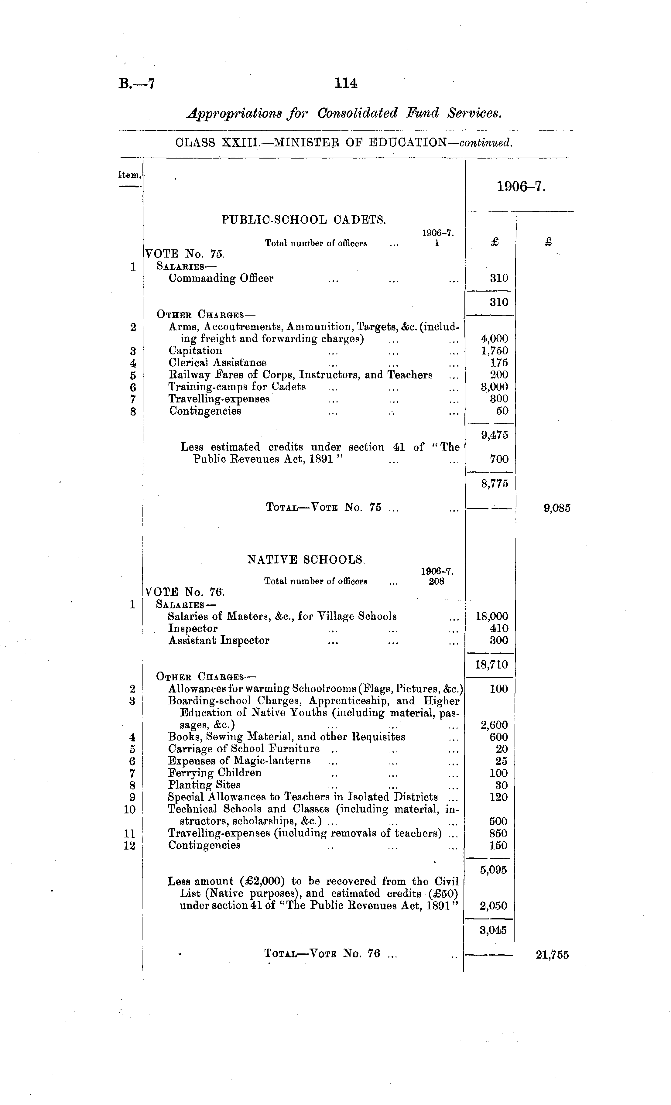 ;em. 19 '6-7. PUBLIC-SCHOOL CADETS, 1906-7. Total number of officers ... 1 VOTE No. 75. Salaries — Commanding Officer £ 310 2 3 4 5 6 7 8 Other Charges— Arms, Accoutrements, Ammunition, Targets, &c. (including freight and forwarding charges) Capitation Clerical Assistance Railway Fares of Corps, Instructors, and Teachers Training-camps for Cadets Travelling-expenses Contingencies 310 4,000 1,750 175 200 3,000 300 50 Less estimated credits under section 41 of " The Public Revenues Act, 1891 " 9,475 700 Total —Vote No. 75 ... 8,775 9,085 NATIVE SCHOOLS. 1906-7. Total number of officers ... 208 VOTE No. 76. Salaries — Salaries of Masters, &c, for Village Schools Inspector Assistant Inspector 18,000 410 300 Other Charges— Allowances for warming Schoolrooms (Flags, Pictures, &c.) Boarding-school Charges, Apprenticeship, and Higher Education of Native Youths (including material, passages, &c.) Books, Sewing Material, and other Requisites Carriage of School Furniture ,.'. Expenses of Magic-lanterns Ferrying Children Planting Sites Special Allowances to Teachers in Isolated Districts ... Technical Schools and Classes (including material, instructors, scholarships, &c.) ... Travelling-expenses (including removals of teachers) ... Contingencies 18,710 2 3 100 4 5 6 7 8 9 10 2,600 600 20 25 100 30 120 11 12 500 850 150 Less amount (£2,000) to be recovered from the Civil List (Native purposes), and estimated credits (£50) under section 41 of "The Public Revenues Act, 1891" 5,095 2,050 Total—Vote No. 76 ... 3,045 21,755