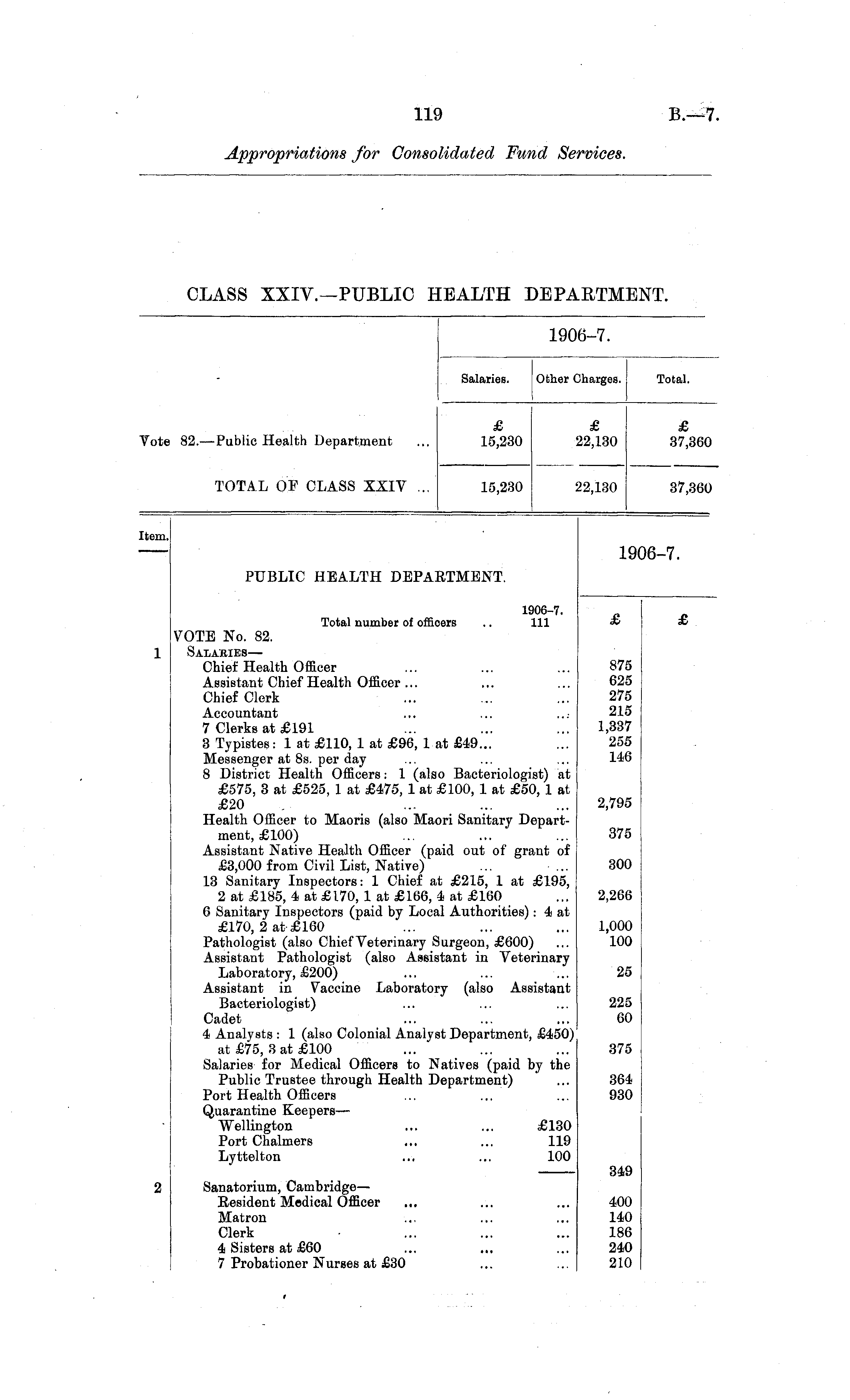 Salaries. Other Charges. Total. ote 82. —Public Health Department £ 15,230 £ 22,130 £ 37,360 TOTAL OF CLASS XXIV ... 15,230 12,180 37,360 !tem.| 1906-7. PUBLIC HEALTH DEPARTMENT. 1906-7. Total number of officers .. Ill VOTE No. 82. Salaries— Chief Health Officer Assistant Chief Health Officer ... Chief Clerk Accountant 7 Clerks at £191 3 Typistes: 1 at £110, 1 at £96, 1 at £49... Messenger at 8s. per day 8 District Health Officers: 1 (also Bacteriologist) at £575, 3 at £525, 1 at £475, 1 at £100, 1 at £50, 1 at £20 Health Officer to Maoris (also Maori Sanitary Department, £100) Assistant Native Health Officer (paid out of grant of £3,000 from Civil List, Native) 13 Sanitary Inspectors: 1 Chief at £215, 1 at £195, 2 at £185, 4 at £170, 1 at £166, 4 at £160 6 Sanitary Inspectors (paid by Local Authorities): 4 at £170, 2 at £160 Pathologist (also Chief Veterinary Surgeon, £600) Assistant Pathologist (also Assistant in Veterinary Laboratory, £200) Assistant in Vaccine Laboratory (also Assistant Bacteriologist) Cadet 4 Analysts : 1 (also Colonial Analyst Department, £450) at £75, 3 at £100 Salaries for Medical Officers to Natives (paid by the Public Trustee through Health Department) Port Health Officers Quarantine Keepers — Wellington ... ... £130 Port Chalmers ... ... 119 Lyttelton ... ... 100 £ 875 625 275 215 1,337 255 146 £ 2,795 375 300 2,266 1,000 100 25 225 60 375 364 930 349 Sanatorium, Cambridge— Resident Medical Officer ... Matron Clerk 4 Sisters at £60 7 Probationer Nurses at £30 400 140 186 240 210