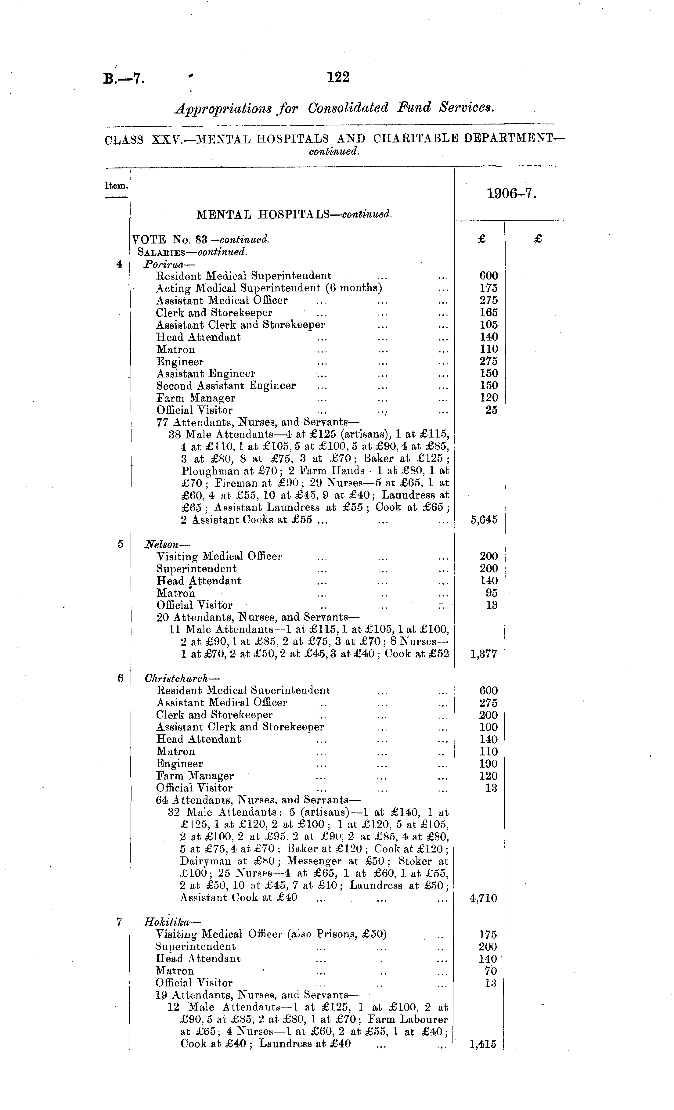 .tern. 19 '6-7. MENTAL HOSPITALS— continued. VOTE No. 83 —continued. Salaries — continued. Porirua — Resident Medical Superintendent Acting Medical Superintendent (6 months) Assistant Medical Officer Clerk and Storekeeper Assistant Clerk and Storekeeper Head Attendant Matron Engineer Assistant Engineer Second Assistant Engineer Farm Manager Official Visitor 77 Attendants, Nurses, and Servants— 38 Male Attendants —4 at £125 (artisans), 1 at £115, 4 at £110,1 at £105, 5 at £100, 5 at £90, 4 at £85, 3 at £80, 8 at £75, 3 at £70; Baker at £125 ; Ploughman at £70; 2 Farm Hands -1 at £80, 1 at £70; Fireman at £90; 29 Nurses—5 at £65, 1 at £60, 4 at £55, 10 at £45, 9 at £40; Laundress at £65 ; Assistant Laundress at £55 ; Cook, at £65 ; 2 Assistant Cooks at £55 ... £ 600 175 275 165 105 140 110 275 150 150 120 25 5,645 Nelson — Visiting Medical Officer Superintendent Head Attendant Matron Official Visitor 20 Attendants, Nurses, and Servants — 11 Male Attendants—1 at £115,1 at £105,1 at £100, 2 at £90,1 at £85, 2 at £75, 3 at £70; 8 Nurses— 1 at £70, 2 at £50, 2 at £45,3 at £40 ; Cook at £52 200 200 140 95 13 1,377 Christchurch — Resident Medical Superintendent Assistant Medical Officer Clerk and Storekeeper Assistant Clerk and Storekeeper Head Attendant Matron Engineer Farm Manager Official Visitor 64 Attendants, Nurses, and Servants— 32 Male Attendants: 5 (artisans) —1 at £140, 1 at £125, 1 at £120, 2 at £100 ; 1 at £120, 5 at £105, 2 at £100, 2 at £95, 2 at £90, 2 at £85, 4 at £80, 5 at £75,4 at £70 ; Baker at £120 ; Cook at £120 ; Dairyman at £80 ; Messenger at £50 ; Stoker at £100; 25 Nurses—4 at £65, 1 at £60, 1 at £55, 2 at £50, 10 at £45, 7 at £40; Laundress at £50; Assistant Cook at £40 600 275 200 100 140 110 190 120 13 4,710 Hokitika — Visiting Medical Officer (also Prisons, £50) Superintendent Head Attendant Matron ' ... ... Official Visitor 19 Attendants, Nurses, and Servants — 12 Male Attendants—1 at £125, 1 at £100, 2 at £90, 5 at £85, 2 at £80, 1 at £70; Farm Labourer at £65; 4 Nurses—1 at £60, 2 at £55, 1 at £40; Cook at £40 ; Laundress at £40 175 20.0 140 70 13 1,415