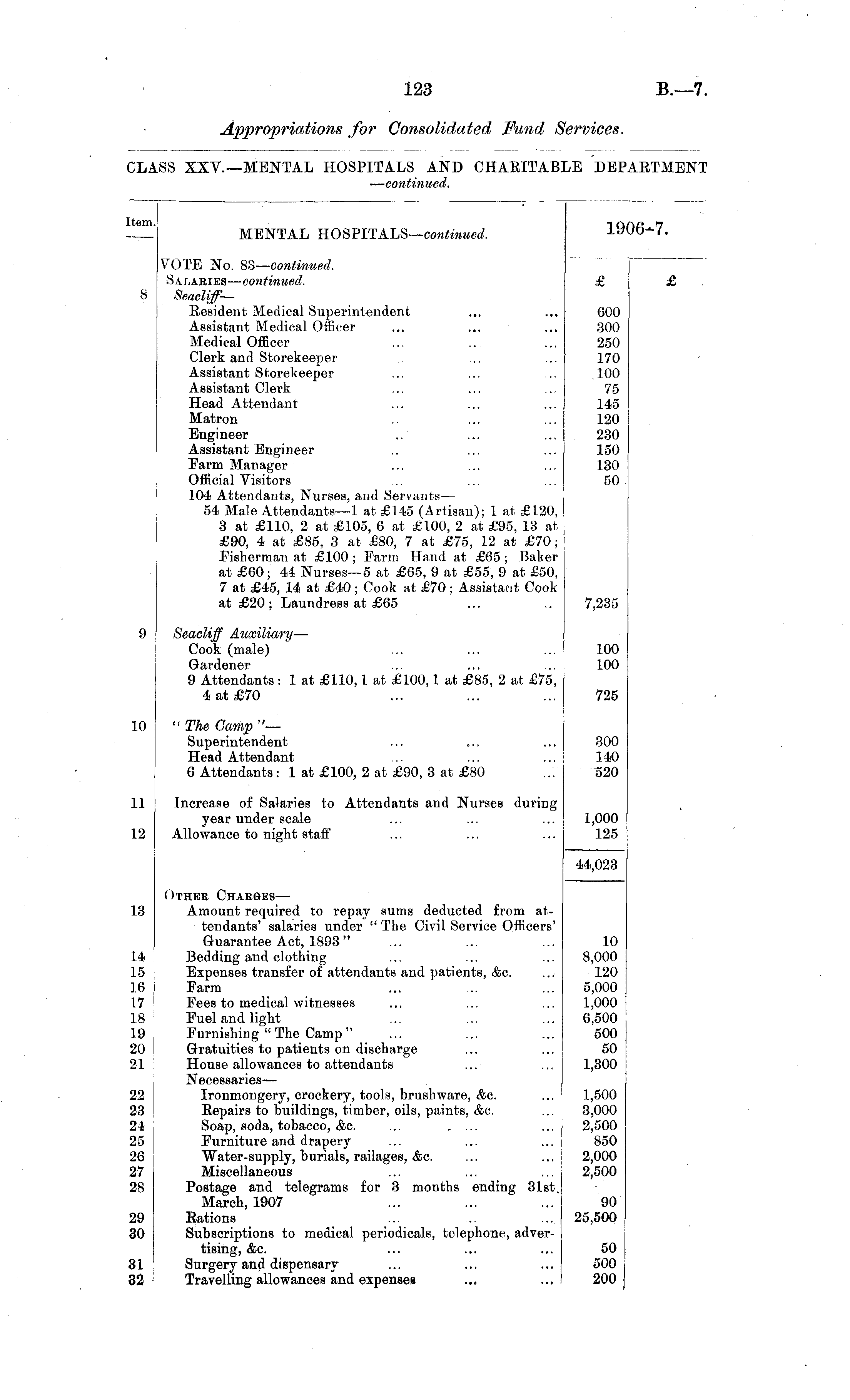 tern. 19 '6-7. MENTAL HOSPITALS— continued. VOTE No. 83— continued. Sa laries — continued. Seacliff- — Resident Medical Superintendent Assistant Medical Officer Medical Officer Clerk and Storekeeper Assistant Storekeeper Assistant Clerk Head Attendant Matron Engineer Assistant Engineer Farm Manager Official Visitors 104 Attendants, Nurses, and Servants — 54 Male Attendants—1 at £145 (Artisan); 1 at £120, 3 at £110, 2 at £105, 6 at £100, 2 at £95, 13 at £90, 4 at £85, 3 at £80, 7 at £75, 12 at £70; Fisherman at £100; Farm Hand at £65 ; Baker at £60; 44 Nurses—5 at £65, 9 at £55, 9 at £50, 7 at £45, 14 at £40; Cook at £70 ; Assistant Cook at £20; Laundress at £65 £ 600 300 250 170 ,100 75 145 120 230 150 130 50, 7,235 Seacliff Auxiliary — Cook (male) Gardener 9 Attendants : 1 at £110,1 at £100,1 at £85, 2 at £75, 4 at £70 100 100 725 10 " The Camp "— Superintendent Head Attendant 6 Attendants: 1 at £100, 2 at £90, 3 at £80 300 140 520 11 Increase of Salaries to Attendants and Nurses during year under scale Allowance to night staff 1,000 125 12 44,023 14 15 16 17 18 19 20 21 13 Other Charges— Amount required to repay sums deducted from attendants' salaries under " The Civil Service Officers' Guarantee Act, 1893 " Bedding and clothing Expenses transfer of attendants and patients, &c. Farm Fees to medical witnesses Fuel and light Furnishing " The Camp " Gratuities to patients on discharge House allowances to attendants Necessaries— Ironmongery, crockery, tools, brush ware, &c. Repairs to buildings, timber, oils, paints, Ac. Soap, soda, tobacco, &c. ... „ ... Furniture and drapery Water-supply, burials, railages, &c. Miscellaneous Postage and telegrams for 3 months ending 31st. March, 1907 Rations Subscriptions to medical periodicals, telephone, advertising, &c. Surgery and dispensary Travelling allowances and expenses 10 8,000 120 5,000 1,000 6,500 500 50 1,300 22 23 24 25 26 27 28 1,500 3,000 2,500 850 2,000 2,500 29 30 90 25,500 31 32 50 500 200
