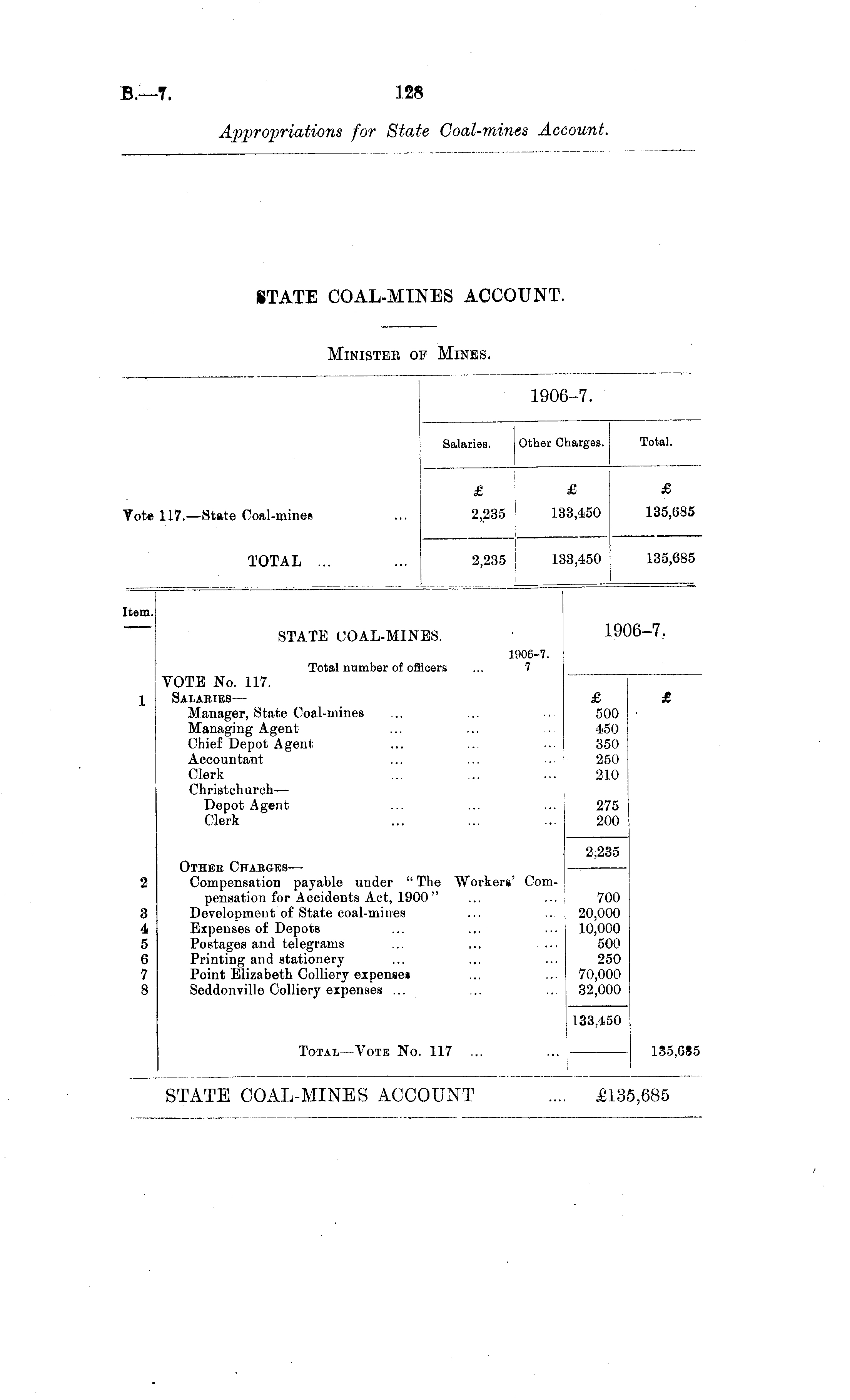 INISTEE 01 JNES. 1906-7. Salaries. Other Charges. Total. £ £ £ ote 117. —State Coal-mines 2,235 13,450 135,685 TOTAL 2,235 13,450 135,685 Item. STATE COAL-MINES. 1906-7. 1906-7. Total number of officers ... 7 VOTE No. 117. Salaries — Manager, State Coal-mines Managing Agent Chief Depot Agent Accountant Clerk Christchurch — Depot Agent Clerk £ 500 450 350 250 210 £ 275 200 Other Charges— Compensation payable under " The Workers' Compensation for Accidents Act, 1900" Development of State coal-mines Expenses of Depots Postages and telegrams ... ... ... Printing and stationery Point Elizabeth Colliery expense* Seddonville Colliery expenses ... 2,235 2 700 20,000 10,000 500 250 70,000 32,000 3 4 5 6 7 8 Total—Vote No. 117 ... 133,450 135,685 STATE COAL-MINES ACCOUNT £13^ ,685