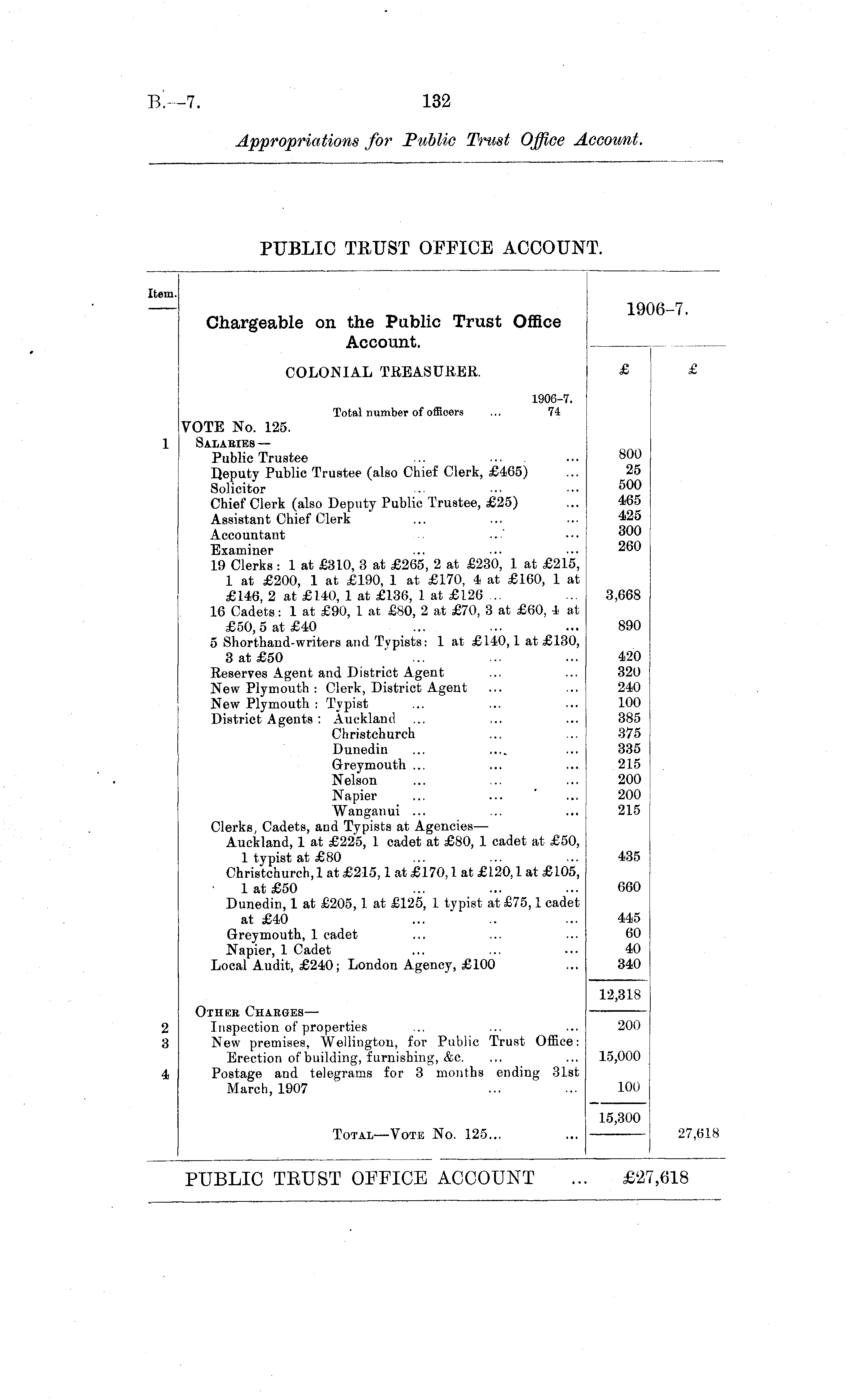 Item. 19 6-7. Chargeable on the Public Trust Office Account. COLONIAL TREASURER. 1906-7. Total number of officers ... 71 VOTE No. 125. Salaries — Public Trustee Deputy Public Trustee (also Chief Clerk, £465) Solicitor Chief Clerk (also Deputy Public Trustee, £25) Assistant Chief Clerk Accountant Examiner 19 Clerks : 1 at £310, 3 at £265, 2 at £230, 1 at £215, 1 at £200, 1 at £190, 1 at £170, 4 at £160, 1 at £146, 2 at £140, 1 at £136, 1 at £126 ... 16 Cadets: 1 at £90, 1 at £80, 2 at £70, 3 at £60, 4 at £50, 5 at £40 5 Shorthand-writers and Typists: 1 at £140,1 at £130, 3 at £50 Reserves Agent and District Agent New Plymouth : Clerk, District Agent New Plymouth : Typist District Agents : Auckland Christchurch Dunedin Greymouth ... Nelson ... ..: Napier Wanganui ... Clerks, Cadets, and Typists at Agencies — Auckland, 1 at £225, 1 cadet at £80, 1 cadet at £50, 1 typist at £80 Christchurch, 1 at £215,1 at £170,1 at £120,1 at £105, lat£50 Dunedin, 1 at £205, 1 at £125, 1 typist at £75,1 cadet at £40 800 25 500 465 425 300 260 3,668 890 420 320 240 100 385 375 335 215 200 200 215 435 660 Greymouth, 1 cadet Napier, 1 Cadet Local Audit, £240; London Agency, £100 445 60 40 340 Other Charges— Inspection of properties New premises, Wellington, for Public Trust Office: Erection of building, furnishing, &c. Postage and telegrams for 3 months ending 31st March, 1907 12,318 2 3 200 15,000 4 100 Total—Vote No. 125... 15,300 27,618 iFFICE ACCOUNT £2 ,618