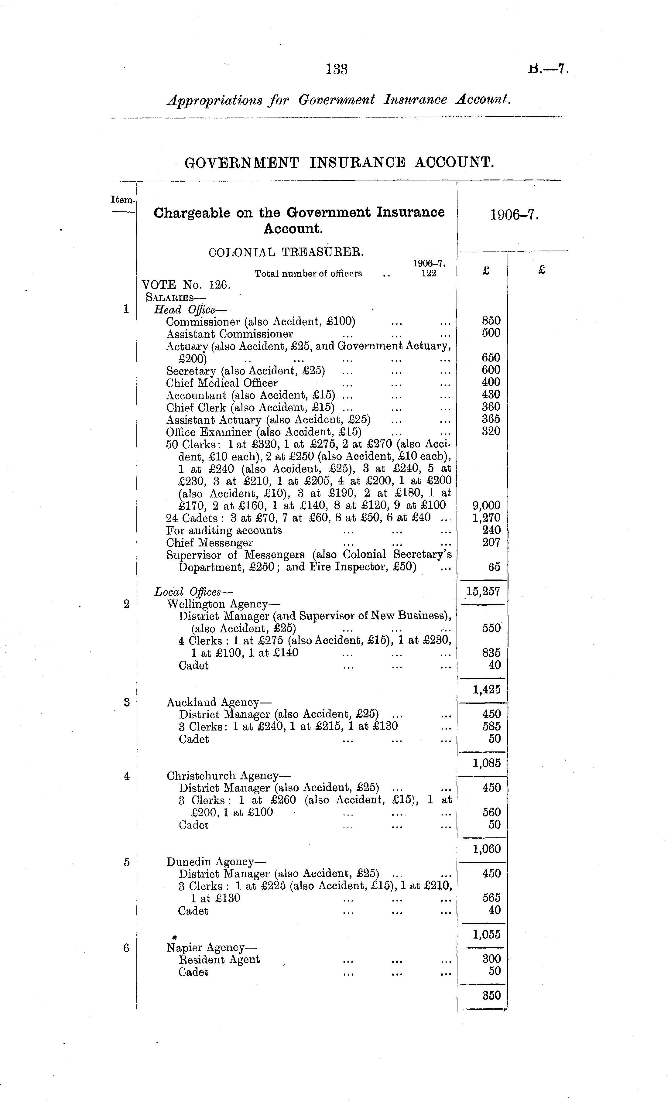 ;em. Chargeable on the Government Insurance 1906-7. Account. COLONIAL TREASURER. 1906-7. Total number of officers .. 122 £ i VOTE No. 126. Salaries — Head Office — Commissioner (also Accident, £100) Assistant Commissioner Actuary (also Accident, £25, and Government Actuary, £200) Secretary (also Accident, £25) Chief Medical Officer Accountant (also Accident, £15) ... Chief Clerk (also Accident, £15) ... Assistant Actuary (also Accident, £25) Office Examiner (also Accident, £15) 50 Clerks: 1 at £320, 1 at £275, 2 at £270 (also Accident. £10 each), 2 at £250 (also Accident, £10 each), 1 at £240 (also Accident, £25), 3 at £240, 5 at £230, 3 at £210, 1 at £205, 4 at £200, 1 at £200 (also Accident, £10), 3 at £190, 2 at £180, 1 at £170, 2 at £160, 1 at £140, 8 at £120, 9 at £100 24 Cadets : 3 at £70, 7 at £60, 8 at £50, 6 at £40 .... For auditing accounts Chief Messenger Supervisor of Messengers (also Colonial Secretary's Department, £250; and Fire Inspector, £50) 850 500 650 600 400 430 360 365 320 9,000 1,270 240 207 65 Local Offices — Wellington Agency— District Manager (and Supervisor of New Business), (also Accident, £25) 4 Clerks : 1 at £275 (also Accident, £15), 1 at £230, 1 at £190, 1 at £140 Cadet 15,257 550 835 40 Auckland Agency— District Manager (also Accident, £25) ... 3 Clerks: 1 at £240, 1 at £215, 1 at £130 Cadet 1,425 450 585 50 Christchurch Agency— District Manager (also Accident, £25) ... 3 Clerks : 1 at £260 (also Accident, £15), 1 at £200, 1 at £100 Cadet 1,085 450 560 50 Dunedin Agency — District Manager (also Accident, £25) .., 3 Clerks : 1 at £225 (also Accident, £15), 1 at £210, 1 at £130 Cadet 1,060 450 565 40 Napier Agency— Resident Agent Cadet 1,055 300 50 350