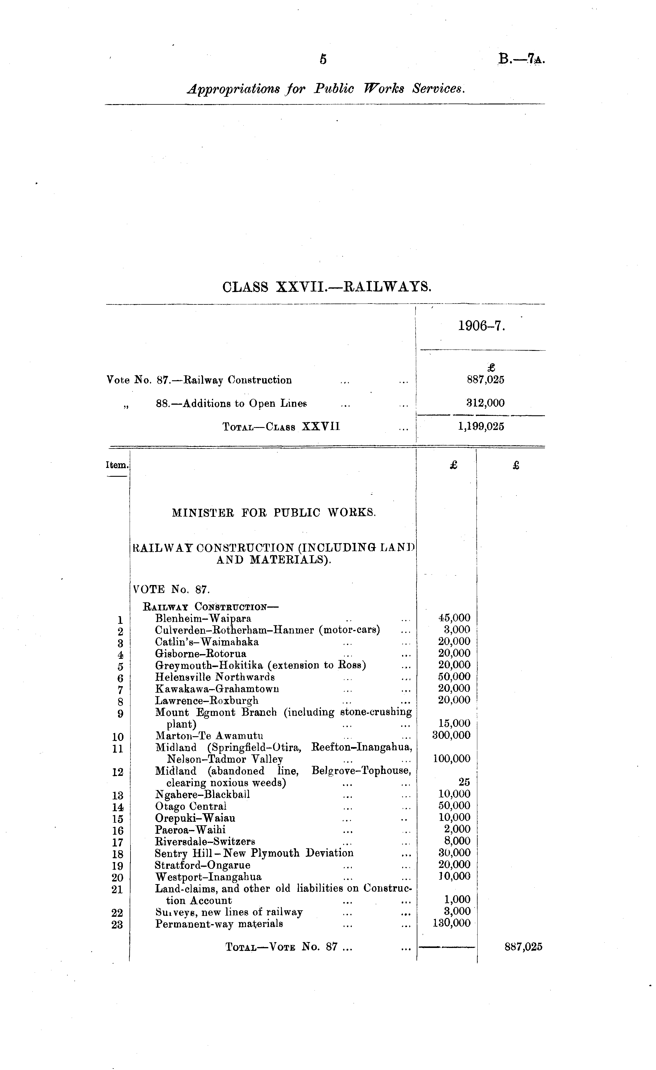1906-7. ote No. 87. —Railway Construction £ 887,025 ., 88. —Additions to Open Lines 312,000 Total—Class XXVII 1,199,025 tern. MINISTER FOR PUBLIC WORKS. RAILWAY CONSTRUCTION (INCLUDING LAND AND MATERIALS). VOTE No. 87. 1 2 3 <t 5 e 7 8 9 Railway Construction — Blenheim-Waipara Culverden-Rotherham-Hanrner (motor-cars) Catlin's-Waimahaka Gisborne—Rotorua Greymouth-Hokitika (extension to Ross) Helensville Northwards Kawakawa-Grahamtown Lawrence-Roxburgh Mount Egmont Branch (including stone-crushing plant) Marton-Te Awamutu Midland (Springfield-Otira, Reei'ton-Inangahua, Nelson-Tadmor Valley Midland (abandoned line, Belgrove-Tophouse, clearing noxious weeds) Ngahere-Blackball Otago Central Orepuki-Waiau Paeroa-Waihi Riversdale-Switzers Sentry Hill-New Plymouth Deviation Stratf ord-Ongarue Westport-Inangahua Land-claims, and other old liabilities on Construction Account Suiveye, new lines of railway Permanent-way materials 45,000 3,000 20,000 20,000 20,000 50,000 20,000 20,000 10 11 15,000 300,000 100,000 12 25 10,000 50,000 10,000 2,000 8,000 30,000 20,000 10,000 13 14 15 16 17 18 19 20 21 22 23 1,000 3,000 130,000 Total—Vote No. 87 ... 887,025
