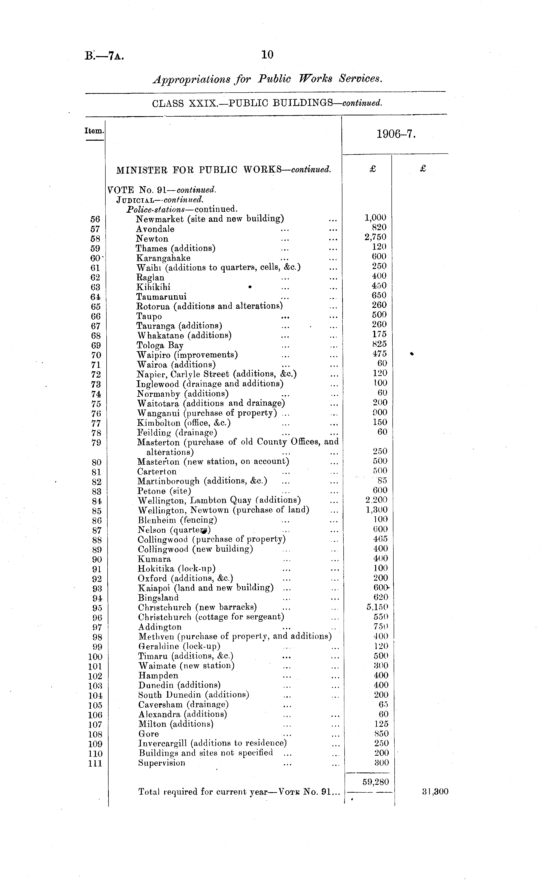 Item. 19 i6-7. MINISTER FOR PUBLIC WORKS— continued. £ 56 57 58 59 6061 62 63 64 65 66 67 68 69 70 71 72 73 74 75 70 77 78 79 80 81 82 83 81. 85 8(5 87 88 89 90 91 92 93 94 95 96 97 98 99 100 101 102 103 104 105 106 107 108 109 110 111 70TE No. 91— continued. Judicial — continued. Police-stations —continued. Newmarket (site and new building) Avondale Newton Thames (additions) Karangahake Waihi (additions to quarters, cells, &c.) Raglan Kihikihi Taumarunui Rotorua (additions and alterations) Taupo Tauranga (additions) Whakatane (additions) Tologa Bay Waipiro (improvements) Wairoa (additions) Napier, Carlyle Street (additions, &c.) Inglewood (drainage and additions) Norrnanby (additions) Waitotara (additions and drainage) Wanganui (purchase of property) ... Kimbolton (office, &c.) Feilding (drainage) Masterton (purchase of old County Offices, and alterations) Masterton (new station, on account) Carterton Marlinborough (additions, &c.) Petone (site) Wellington, Lambton Quay (additions) Wellington, Newtown (purchase of land) Blenheim (fencing) Nelson (quartetjj!) Collingwood (purchase of property) Collingwood (new building) Kumara Hokitika (lock-up) Oxford (additions, &c.) Kaiapoi (land and new building) ... Bingsland Christchurch (new barracks) Christchurch (cottage for sergeant) Addington Metliven (purchase of property, and additions) Geraldine (lock-up) Timaru (additions, Ac.) Waimate (new station) Hainpden Dunedin (additions) South Dunedin (additions) Caversham (drainage) Alexandra (additions) Milton (additions) Gore Invercargill (additions to residence) Buildings and sites not specified Supervision 1,000 820 2,750 120 600 250 400 450 650 260 500 260 175 825 475 00 120 100 60 200 000 150 00 250 500 r>00 ss 000 2.200 1,300 100 000 4(55 400 400 100 200 600020 5,150 550 750 400 120 500 300 400 400 200 65 00 125 850 250 200 300 Total required for current year—Votjs No. 91... 59,280 31,301