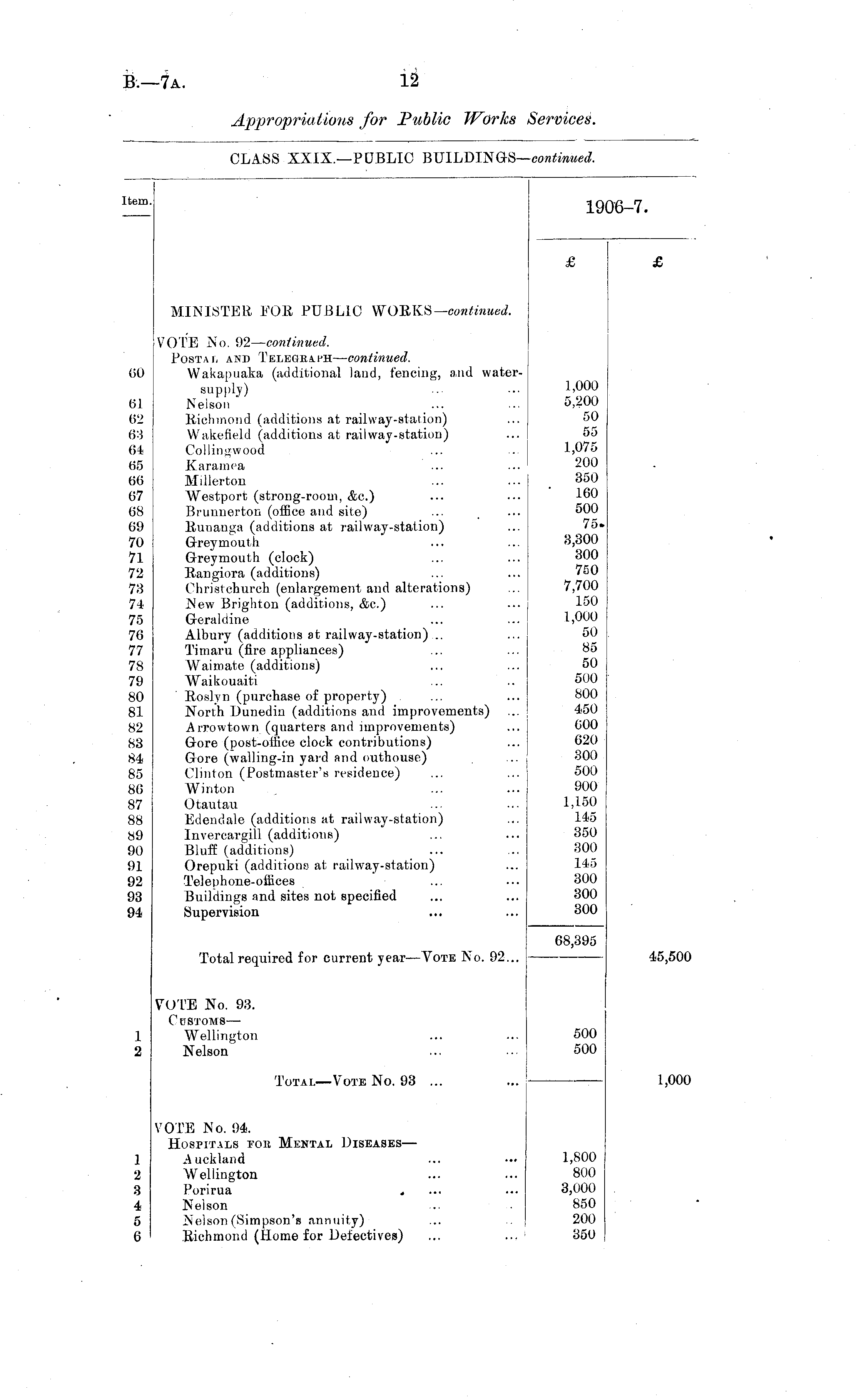 iem '6-7. MINISTER FOE PUBLIC WOEKS— continued. GO 61 62 63 64 65 66 67 68 69 70 71 72 73 74 75 76 77 78 79 80 81 82 83 84 85 86 87 88 89 90 91 92 93 94 VOTE No. 92— continued. Postal and Telegbaph— continued. Wakapuaka (additional land, fencing, and watersupply) Nelson Eichmond (additions at railway-station) Wakefleld (additions at rail way-station) Collingwood Xarainea Millerton Westport (strong-room, &c.) Brunnerton (office and site) Eunanga (additions at railway-station) Grey mouth Grey mouth (clock) Kangiora (additions) Christchurch (enlargement and alterations) New Brighton (additions, &c.) Q-eraldine Albury (additions at railway-station) ... Timaru (fire appliances) Waimate (additions) Waikouaiti Roslyn (purchase of property) North Dunedin (additions and improvements) Arrowtown (quarters and improvements) Gore (post-office clock contributions) Gore (walling-in yard nnd outhouse) Clinton (Postmaster's residence) Winton Otautau Edendale (additions at railway-station) Invercargill (additions) Bluff (additions) Orepuki (additions at railway-station) Telephone-offices Buildings and sites not specified Supervision 1,000 5,200 50 55 1,075 200 350 ' 160 500 75* 3,300 300 750 7,700 150 1,000 50 85 50 500 800 450 COO 620 300 500 900 1,150 145 350 300 145 300 300 300 Total required for current year —Vote No. 92... 68,395 45,501 VOTE No. 93. Cbstoms— Wellington Nelson 500 500 L 2 Total—Vote No. 93 ... 1,001 1 2 3 4 5 6 VOTE No. 94. Hospitals fob Mental Diseases — Auckland Wellington Porirua Nelson Nelson (Simpson's annuity) Eichmond (Home for Defectives) 1,800 800 3,000 850 200 350