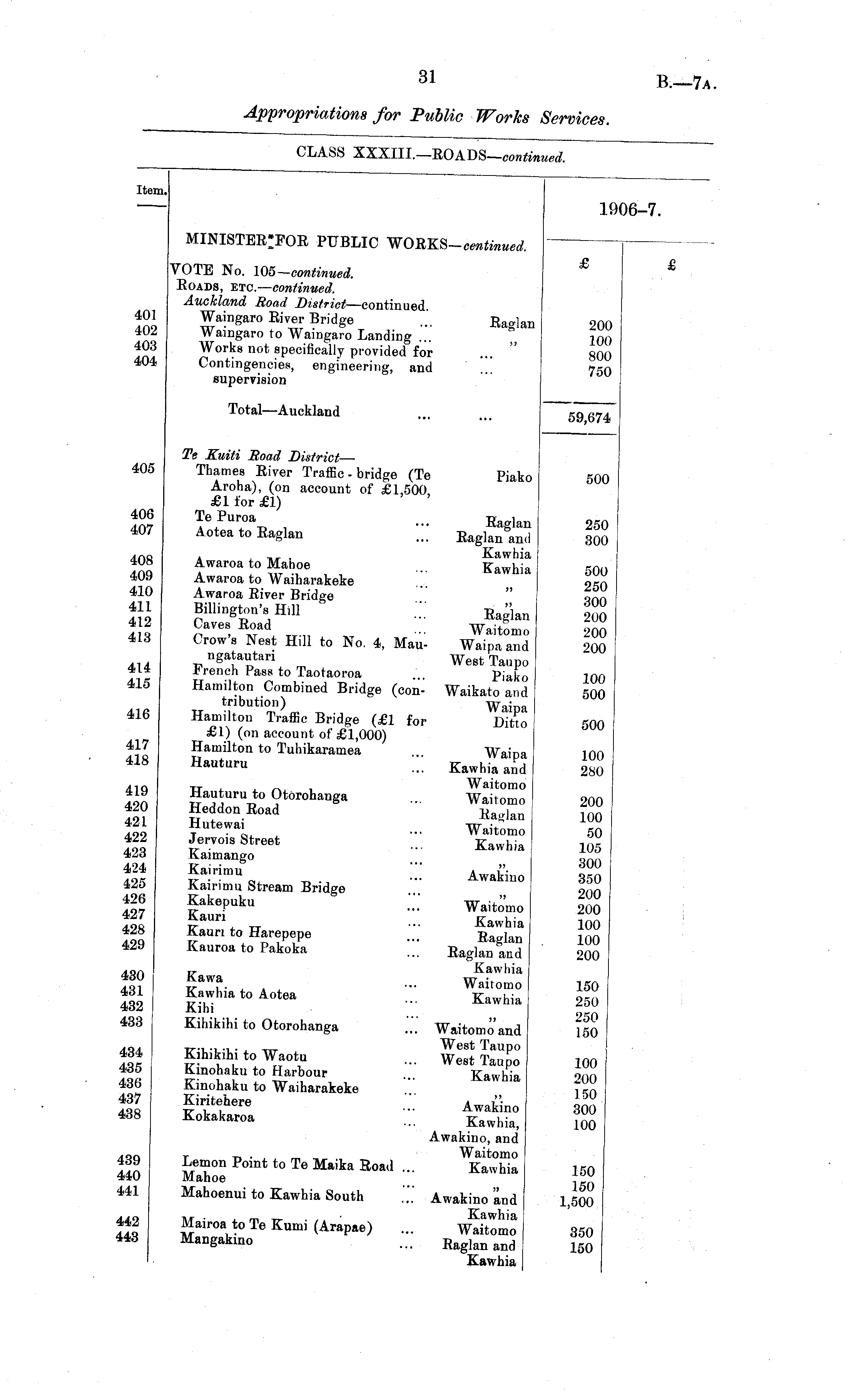 Item. 19 '6-7. minister;for public works- cw «w. 401 402 403 404 VOTE No. 105-continued. Roads, etc. — continued. Auckland Road District —continued Waingaro River Bridge ..'. Eaglan Waingaro to Waingaro Landing ... Works not specifically provided for Contingencies, engineering, and supervision £ 200 100 800 750 Total—Auckland 59,674 405 406 407 408 409 410 411 412 413 414 415 416 417 418 419 420 421 422 423 424 425 426 427 428 429 Te Kuiti Road District — Thames River Traffic - bridge (Te Piako Aroha), (on account of £1,500 £1 for £1) TePuroa ... E laQ Aotea to Raglan ... Eag]an and , ,, , Kawhia Awaroa to Mahoe ... Kawhia Awaroa to Waiharakeke Awaroa River Bridge BillingWsH.il .';.' Ea^'lan Caves Road Waitomo Crow's Nest Hill to No. 4, Mau- Waipa and ngatautari Wegt T irench Pass to Taotaoroa ... pj a £ 0 Hamilton Combined Bridge (con- Waikato and tribution) Waipa Hamilton Traffic Bridge (£1 for Ditto £1) (on account of £1,000) Hamilton to Tuhikaramea Waipa Hauturu ... Kawhia and tt , ,-,, , Waitomo Hauturu to Otorohanga ... Waitomo Heddon Road Ea ]an Hutewa. ... Waitomo Jervois Street ... Kawhia Kaimango £ a i rim V „., ■■'•' Awaki »° Kairimu Stream Bridge £ ake P uku .'.'.' Waitomo 1 &UF \ _ ... Kawhia Kauri to Harepepe ... E alan Kauroa to Pakoka ... Raglan and Tr Kawhia £ awa . A t ... Waitomo Kawhia to Aotea ... Kawhia Klhi Kihikihi to Otorohanga .'.'.' Waitomo and TT'l. •!_•!_• j -rrr WeStTaUpO Kihikihi to Waotu ... West Tau £ 0 Kinohaku to Harbour ... Kawhia Kinohaku to Waiharakeke Kiritehere ..'.' Awakino Kokakaroa ... Kawhia, Awakino, and t x. • , , m ,, Waitomo Lemon Point to Te Maika Road ... Kawhia Mahoe Mahoenui to Kawhia South .'" Awakino and Mairoa to Te Kumi (Arapae) ... Waitomo MaD g aklno ... Raglan and Kawhia 500 250 300 500 250 300 200 200 200 100 500 500 100 280 200 100 50 105 300 350 200 200 100 100 200 430 431 432 433 150 250 250 150 434 435 436 437 438 100 200 150 300 100 439 440 441 150 150 1,500 442 443 350 150