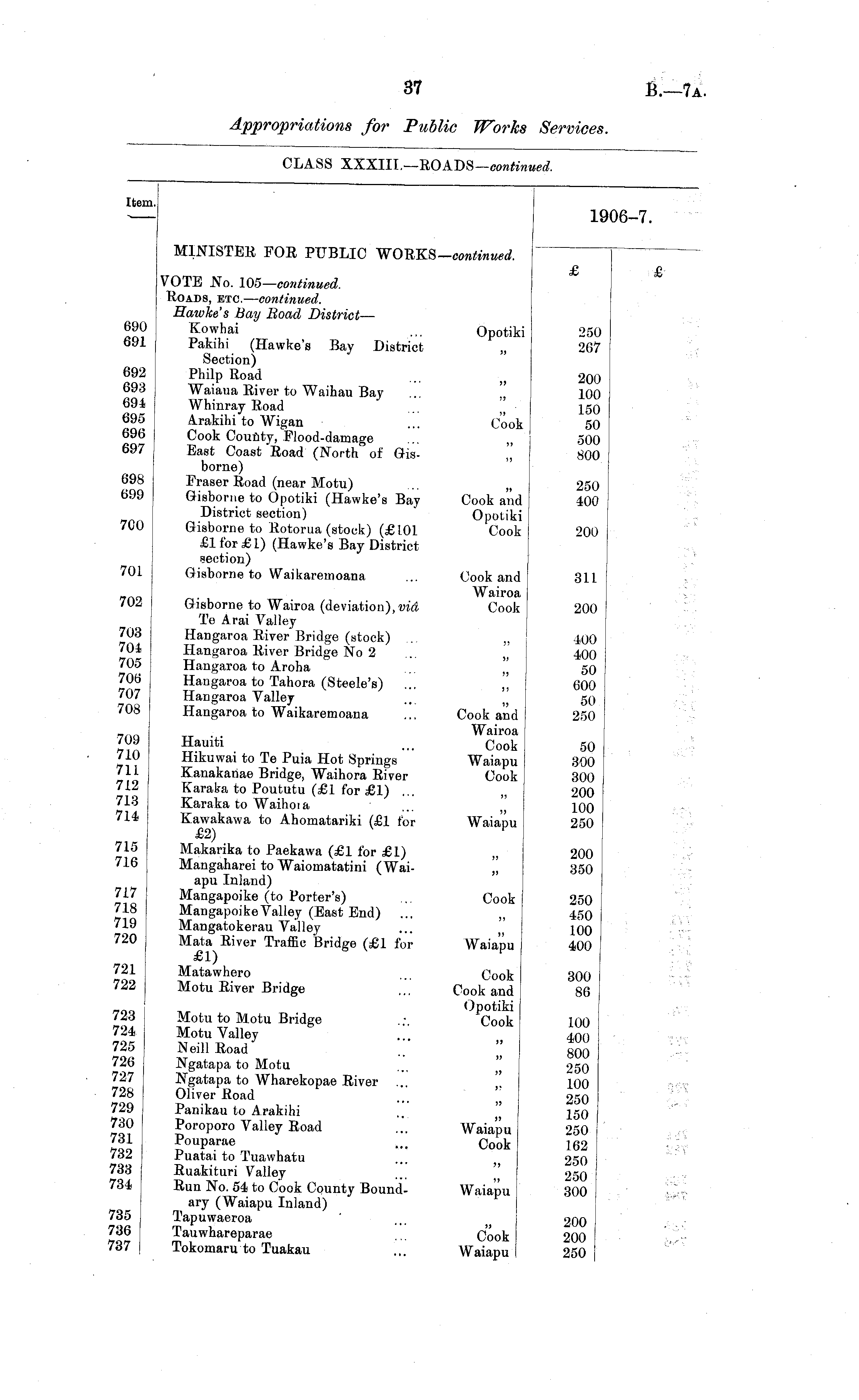 Item. 19 '6-7. MINISTER FOR PUBLIC WORKS-continued. VOTE No. 105— continued. Roads, etc. — continued. Hawke's Bay Road District — Kowhai ... Opotiki Pakihi (Hawke's Bay District Section) Philp Road Waiaua River to Waihau Bay Whinray Road Arakihi to Wigan ... Cook Cook County, Flood-damage East Coast Road (North of Gisborne) Fraser Road (near Motu) Gisborne to Opotiki (Hawke's Bay Cook and District section) Opotiki Gisborne to Rotorua (stock) (£101 Cook £lfor£l) (Hawke's Bay District section) Gisborne to Waikaremoana ... Cook and Wairoa Gisborne to Wairoa (deviation), vid Cook Te Arai Valley Hangaroa River Bridge (stock) ... „ Hangaroa River Bridge No 2 Hangaroa to Aroha ... J Hangaroa to Tahora (Steele's) ... "„ Hangaroa Valley Hangaroa to Waikaremoana ... Cook and Wairoa Hauiti ... Cook Hikuwai to Te Puia Hot Springs Waiapu Kanakanae Bridge, Waihora River Cook Karaka to Poututu (£1 for £1) ... Karaka to Waihoia Kawakawa to Ahomatariki (£1 for Waiapu £2) Makarika to Paekawa (£1 for £1) Mangaharei to Waiomatatini (Wai- "„ apu Inland) Mangapoike (to Porter's) ... Cook Mangapoike Valley (East End) Mangatokerau Valley Mata River Traffic Bridge (£1 for Waiapu £1) Matawhero ... Cook Motu River Bridge ... Cook and Opotiki Motu to Motu Bridge ■ Cook Motu Valley Neill Road " Ngatapa to Motu Ngatapa to Wharekopae River Oliver Road Panikau to Arakihi Poroporo Valley Road ... Waiapu Pouparae ... Cook Puatai to Tuawhatu Ruakituri Valley Run No. 54 to Cook County Bound- Waiapu ary (Waiapu Inland) Tapuwaeroa Tauwhareparae .,. Cook Tokomaru to Tuakau ... Waiapu £ £ 690 691 250 267 692 693 694 695 696 697 200 100 150 50 500 800 698 699 250 400 700 200 701 311 702 200 703 704 705 706 707 708 400 400 50 600 50 250 709 710 711 712 713 714 50 300 300 200 100 250 715 716 200 350 717 718 719 720 ; 250 450 100 400 j 721 722 300 86 723 724 725 726 727 728 729 730 731 732 733 734 100 400 800 250 100 250 150 250 162 250 250 300 ■ ■ 735 736 737 ' | 200 200 250 - ■ '