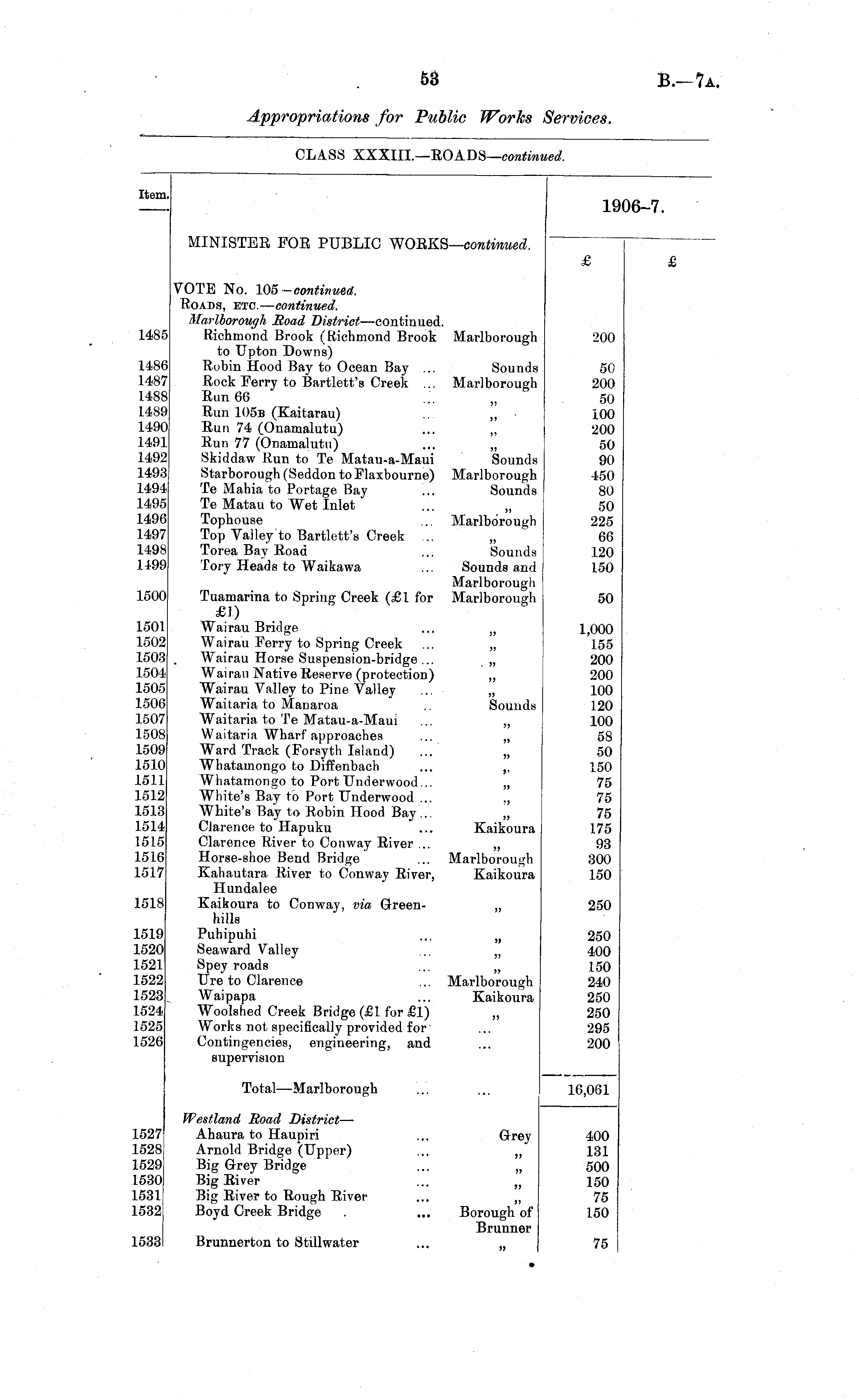 Item. i. 19 '6-7. MINISTER FOR PUBLIC WORKS— continued. 7 i ) ) L > i I. ' 1 ) ) i i VOTE No. 105-continued. Roads, etc. — continued. Marlborough Road District —continued. Richmond Brook (Richmond Brook Marlborough to Upton Downs) Robin Hood Bay to Ocean Bay ... Sounds Rock Ferry to Bartlett's Creek ... Marlborough Run 66 Run 105b (Kaitarau) ... „ Run 74 (Onamalutu) ... „ Run 77 (Onamalutu) ... „ Skiddaw Run to Te Matau-a-Maui Sounds Starborough (Seddon to Flaxbourne) Marlborough Te Mahia to Portage Bay ... Sounds Te Matau to Wet Inlet ... „ Tophouse ... Marlborough Top Valley to Bartlett's Creek ... „ Torea Bay Road ... Sounds Tory Heads to Waikawa ... Sounds and Marlborough Tuamarina to Spring Creek (£1 for Marlborough £1) Wairau Bridge ... „ Wairau Ferry to Spring Creek ... „ Wairau Horse Suspension-bridge ... „ Wairau Native Reserve (protection) „ Wairau Valley to Pine Valley ... „ Waitaria to Manaroa .. Sounds Waitaria to Te Matau-a-Maui ... ,, Waitaria Wharf approaches ... „ Ward Track (Forsyth Island) ... „ Whatamongo to Diffenbach ... „ Whatamongo to Port Underwood... „ White's Bay to Port Underwood ... „ White's Bay to Robin Hood Bay... „ Clarence to Hapuku ... Kaikoura Clarence River to Conway River ... „ Horse-shoe Bend Bridge ... Marlborough Kahautara River to Conway River, Kaikoura Hundalee Kaikoura to Conway, via Greenhills Puhipuhi ... „ Seaward Valley ... „ Spey roads ... „ Ure to Clarence ... Marlborough Waipapa ... Kaikoura Woolshed Creek Bridge (£1 for £1) „ Works not specifically provided for Contingencies, engineering, and supervision £ 200 1485 1486 1487 1488 1489 1490 1491 1492 1493 1494 1495 1496 1497 1498 1499 50 200 50 100 200 50 90 450 80 50 225 66 120 150 1500 50 1501 1502 1503 1504 1505 1506 1507 1508 1509 1510 1511 1512 1513 1514 1515 1516 1517 1,000 155 200 200 100 120 100 58 50 150 75 75 75 175 93 300 150 1518 250 1519 1520 1521 1522 1523 1524 1525 1526 250 400 150 240 250 250 295 200 Total—Marlborough 16,061 .527 .528 .529 .530 .531 532 Westland Road District — Ahaura to Haupiri ... Grey Arnold Bridge (Upper) ... „ Big Grey Bridge ... „ Big River ... (| Big River to Rough River ... ,, Boyd Creek Bridge ... Borough of Brunner 400 131 500 150 75 150 533 Brunnerton to Stillwater 75