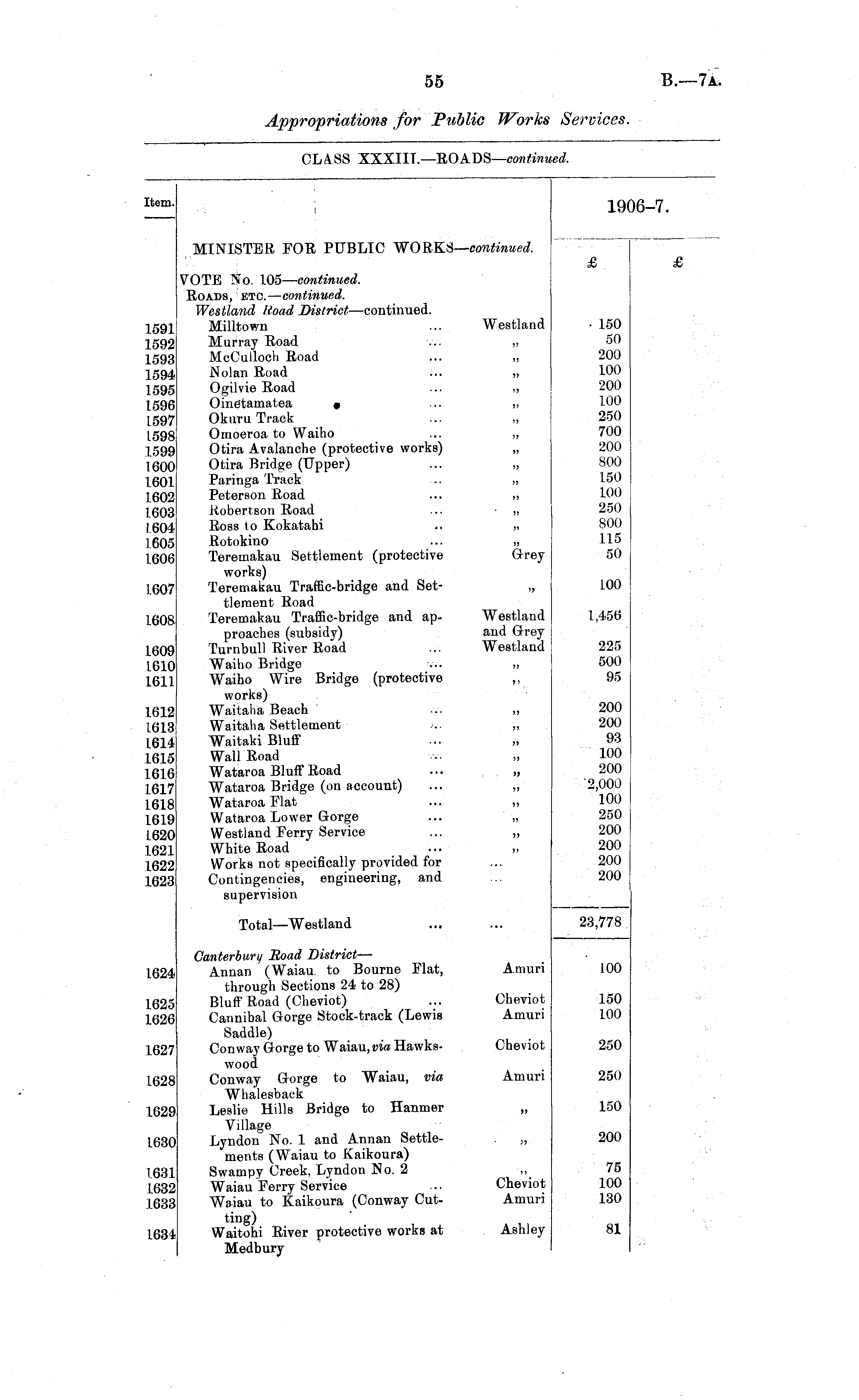 [tern.; i 19 i6-7. MINISTER FOR PUBLIC WORKS— continued. VOTE No. 105— continued. Roads, etc. — continued. Westland lioad District —continued. Milltown ... Westland Murray Road ... „ McCulloch Road ... „ Nolan Road ... „ Ogilvie Road ... ,, Oinetamatea * ... ,, Okuru Track ... „ Omoeroa to Waiho ... „ Otira Avalanche (protective works) „ Otira Bridge (Upper) ... ,, Paringa Track .. „ Peterson Road ... ,, Robertson Road ... ■ „ Ross to Kokatahi .. „ Rotokino ... „ Teremakau Settlement (protective Grey works) Teremakau Traffic-bridge and Set- „ tlement Road Teremakau Traffic-bridge and ap- Westland proaches (subsidy) and Grey Turnbull River Road ... Westland Waiho Bridge ... „ Waiho Wire Bridge (protective ,, works) Waitaha Beach ... „ Waitaha Settlement >.. „ Waitaki Bluff Wall Road Wataroa Bluff Road ... „ Wataroa Bridge (on account) ... „ Wataroa Flat ... „ Wataroa Lower Gorge ... „ Westland Ferry Service ... „ White Road Works not specifically provided for Contingencies, engineering, and supervision £ 1591 1592 1593 1594 1595 1596 1597 1598 1599 1600 1601 1602 1603 1604 1605 1606 • 150 50 200 100 200 100 250 700 200 800 150 100 250 800 115 50 1607 100 1608 1,456 1609 1610 1611 225 500 95 1612 1613 1614 1615 1616 1617 1618 1619 1620 1621 1622 1623 200 200 93 100 200 2,000 100 250 200 200 200 200 Total—Westland 23,778 1624 1625 1626 Canterbury Road District — Annan (Waiau. to Bourne Flat, Amuri through Sections 24 to 28) Bluff Road (Cheviot) ... Cheviot Cannibal Gorge Stock-track (Lewis Amuri Saddle) Conway Gorge to Waiau, via Hawks- Cheviot wood 100 150 100 1627 250 1628 Conway Gorge to Waiau, via Amuri Whalesback Leslie Hills Bridge to Hanmer „ Village Lyndon No. 1 and Annan Settle- . „ ments (Waiau to Kaikoura) Swampy Creek, Lyndon No. 2 ,, Waiau Ferry Service ... Cheviot Waiau to Kaikoura (Conway Cut- Amuri ting) Waitohi River protective works at Ashley Medbury 250 1629 150 1630 200 1631 1632 1633 75 100 130 1634 81
