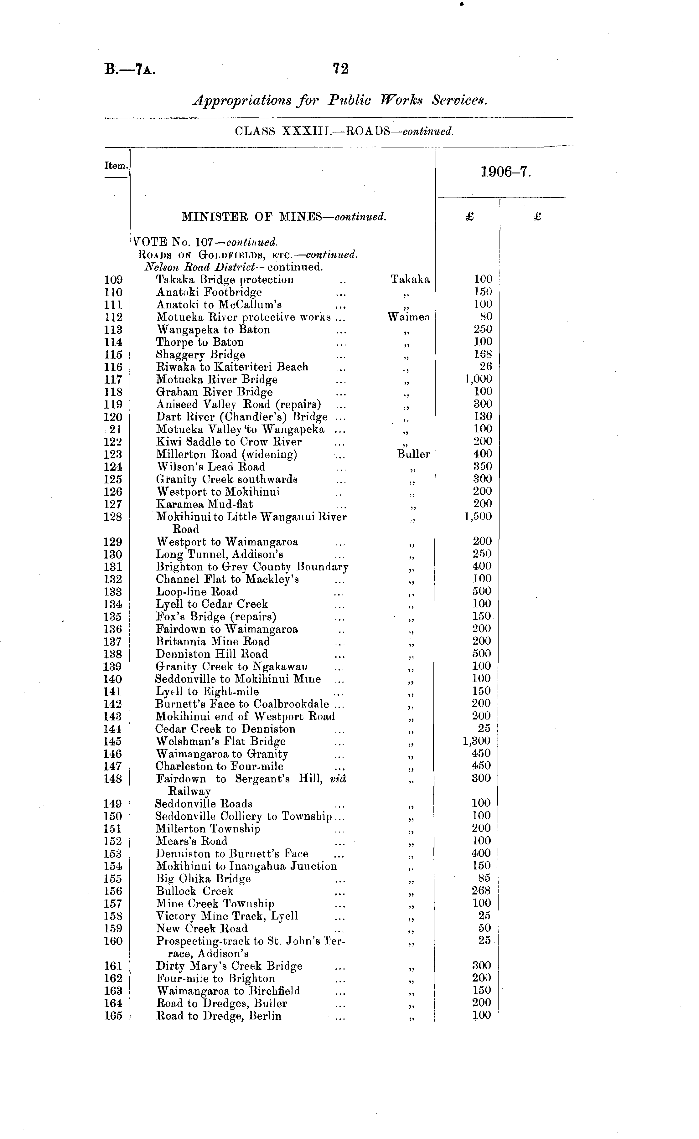 Item. 19 i6-7. MINISTER OF MINES— continued. £ £ 109 110 111 112 113 114 115 116 117 118 119 120 21 122 123 124 125 126 127 128 129 130 131 132 133 134 135 136 137 138 139 140 141 142 143 144 145 146 147 148 VOTE No. 107—continued. Roads on Goldfields, etc. — continued. Nelson Road District —continued. Takaka Bridge protection Anatoki Footbridge Anatoki to McCallum's Motueka River protective works ... Wangapeka to Baton Thorpe to Baton Shaggery Bridge Riwaka to Kaiteriteri Beach Motueka River Bridge Graham River Bridge Aniseed Valley Road (repairs) Dart River (Chandler's) Bridge ... Motueka Valley to Wangapeka ... Kiwi Saddle to Crow River Millerton Road (widening) Wilson's Lead Road Granity Creek southwards Westport to Mokihinui Karamea Mud-flat Mokihinui to Little Wanganui River Road Westport to Waimangaroa Long Tunnel, Addison's Brighton to Grey County Boundary Channel Flat to'Mackley's Loop-line Road Lyell to Cedar Creek Fox's Bridge (repairs) Fairdown to Waimangaroa Britannia Mine Road Denniston Hill Road Granity Creek to Ngakawau Seddonville to Mokihinui Mine Lyell to Eight-mile Burnett's Face to Coalbrookdale ... Mokihinui end of Westport Road Cedar Creek to Denniston Welshman's Flat Bridge Waimangaroa to Granity Charleston to Four-mile Fairdown to Sergeant's Hill, vid Railway Seddonville Roads Seddonville Colliery to Township ... Millerton Township Mears's Road Denniston to Burnett's Face Mokihinui to Inangahua Junction Big Ohika Bridge Bullock Creek Mine Creek Township Victory Mine Track, Lyell New Creek Road Prospecting-track to St. John's Terrace, Addison's Dirty Mary's Creek Bridge Four-mile to Brighton Waimangaroa to Birchfield Road to Dredges, Buller Road to Dredge, Berlin Takaka 55 Waimea 55 55 55 •5 55 '5 55 Buller 11 11 11 ii ;) )) 11 Ii If 1 i 11 ') 11 11 )» 11 11 )) 11 H 11 Ii fl »> i' n ii ii n n ii ii ii ii )' It 100 150 100 80 250 100 168 26 1,000 100 300 130 100 200 400 350 300 200 200 1,500 200 250 400 100 500 100 150 200 200 500 100 100 150 200 200 25 1,300 450 450 300 149 150 151 152 153 154 155 156 157 158 159 160 100 100 200 100 400 150 85 268 100 25 50 25 161 162 163 164 165 300 200 150 200 100