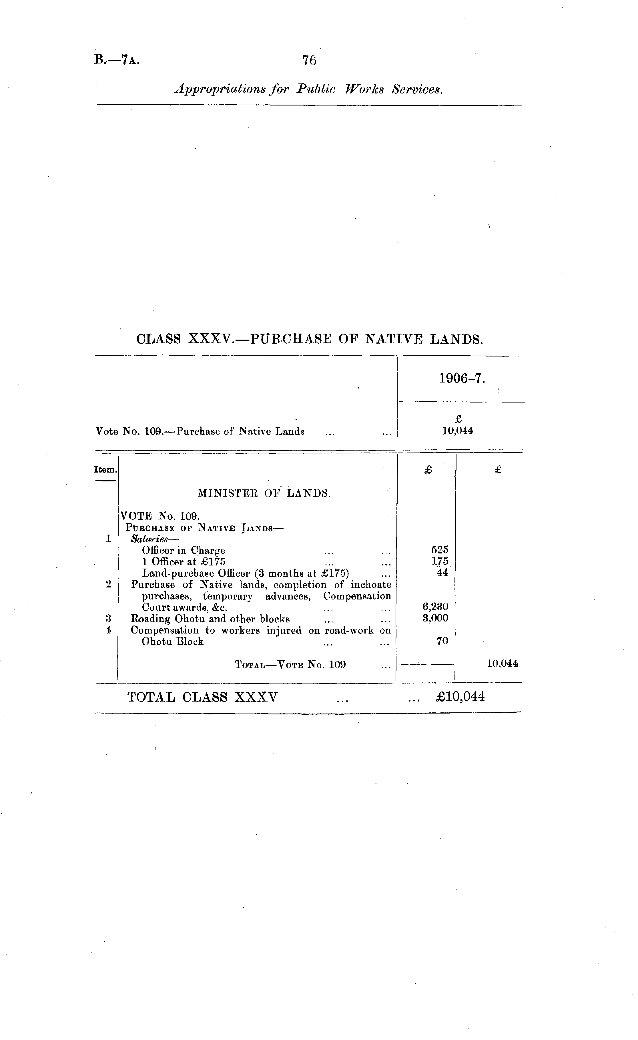 1906-7. Vote No. 109.—Purchase of Native Lands £ 10,044 item. MINISTER OF LANDS. VOTE No. 109. Purchase of Native Lands— Salaries — Officer in Charge 1 Officer at £175 Land-purchase Officer (3 months at £175) Purchase of Native lands, completion of inchoate purchases, temporary advances, Compensation Court awards, &c. Roading Ohotu and other blocks Compensation to workers injured on road-work on Ohotu Block 525 175 44 2 6,230 3,000 3 4 70 Total—Vote No. 109 10,044 TOTAL CLASS XXXV £1 1,044