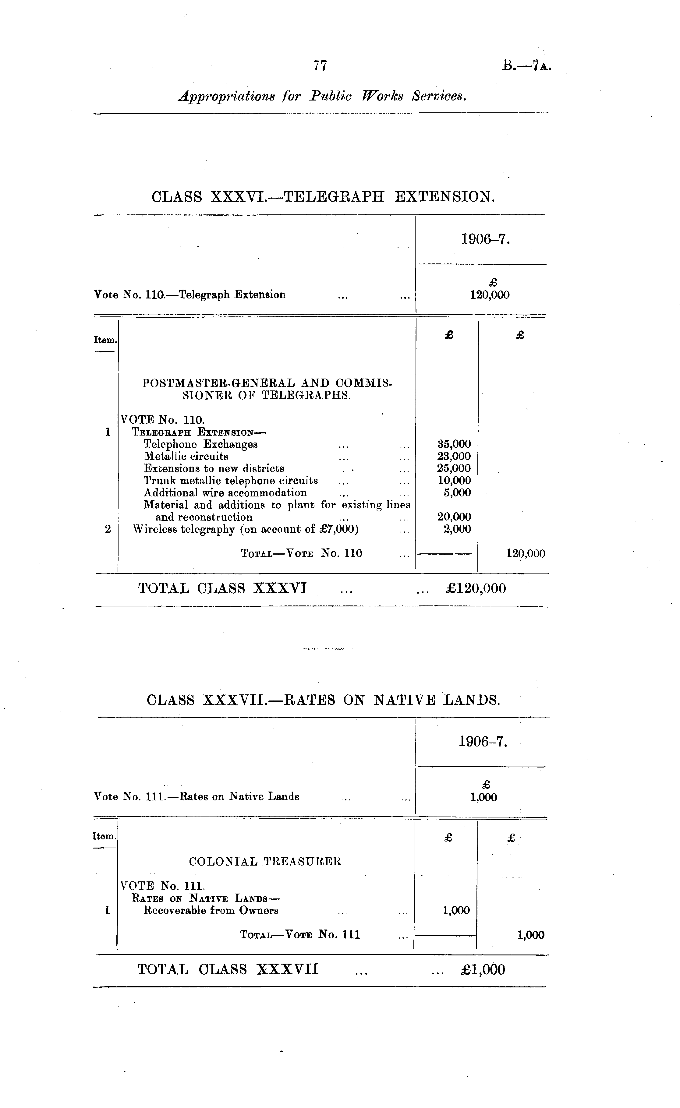 1906-7. £ ,000 Vote No. 111. —Rates on Native Lands Item. COLONIAL TREASURER VOTE No. 111. Rates on Native Lands — Recoverable from Owners 1,000 Total—Vote No. Ill 1,000 TOTAL CLASS XXXVII £1,000