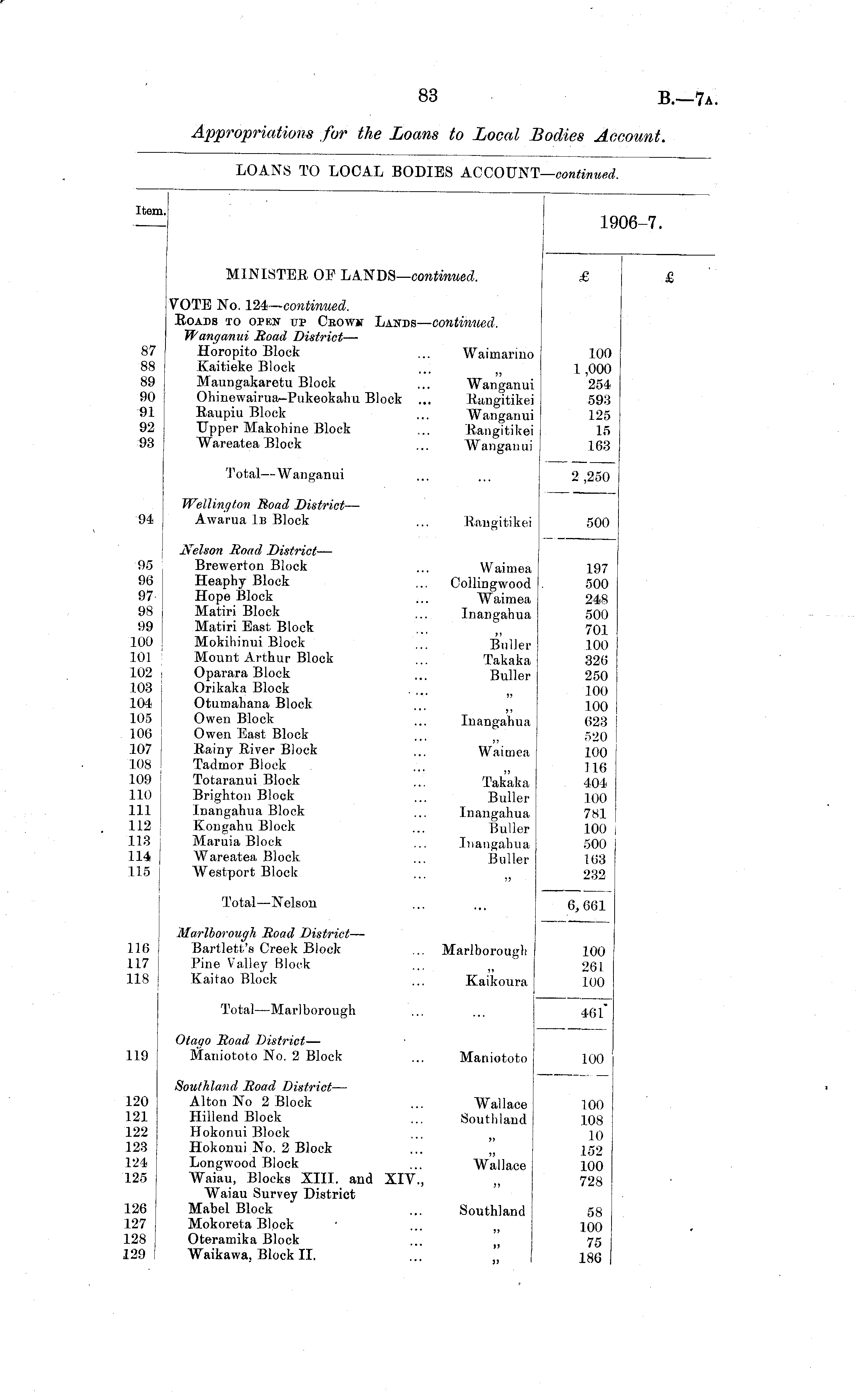 Item. 19 i6-7. MINISTER OF LANDS— continued. £ £ 87 88 89 90 91 92 93 VOTE No. 124— continued. Roads to open up Cbowjt Lands — continued. Wanganui Road District — Horopito Block ... Waimarino Kaitieke Block Maungakaretu Block ... Wanganui Ohinewairua-Pukeokahu Block ... Rangitikei Raupiu Block ... Wanganui Upper Makohine Block ... Rangitikei Wareatea Block ... Wanganui 100 1,000 254 593 125 15 163 Total—Wanganui 2 ,250 94 Wellington Road District — Awarua Ib Block ... Rangitikei 500 95 96 97 98 99 100 101 102 103 104 105 106 107 108 109 110 111 112 113 114 115 Nelson Road District — Brewerton Block ... Waimea Heaphy Block ... Collingwood Hope Block ... Waimea Matiri Block ... Inangahua Matiri East Block Mokihinui Block ... Buller Mount Arthur Block ... Takaka Oparara Block ... Buller Orikaka Block .... Otumahana Block Owen Block ... Inangahua Owen East Block Rainy River Block ... Waimea Tadmor Block Totaranui Block ... Takaka Brighton Block ... Buller Inangahua Block ... Inangahua Kongahu Block ... Buller Maruia Block ... Inangahua Wareatea Block ... Buller Westport Block 197 500 248 500 701 100 326 250 100 100 623 520 100 116 404 100 781 100 i 500 163 232 Total—Nelson 6,661 116 117 118 Marlborough Road District — Bartlett's Creek Block ... Marlborou"h Pine Valley Block Kaitao Block ... Kaikoura 100 261 100 Total—Marlborough 461" Otago Road District — Maniototo No. 2 Block ... Maniototo 100 119 120 121 122 123 124 125 Southland Road District — Alton No 2 Block ... Wallace Hillend Block ... Southland Hokonui Block Hokonui No. 2 Block ... "„ Longwood Block ... Wallace Waiau, Blocks XIII. and XIV., Waiau Survey District Mabel Block ... Southland Mokoreta Block Oteramika Block Waikawa, Block II. ... j 100 108 10 152 100 728 126 127 128 129 58 100 75 186