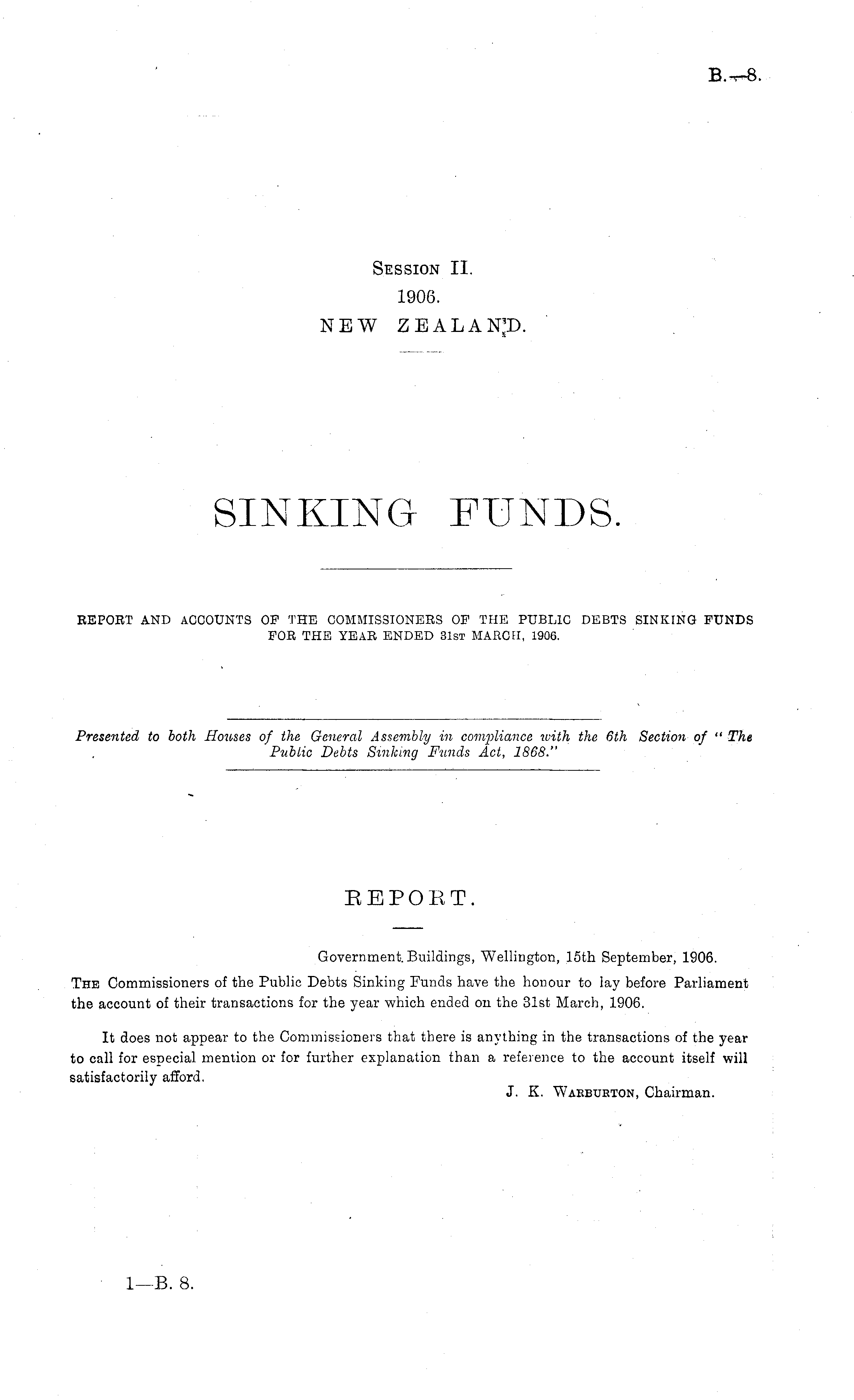 Government. Buildings, Wellington, 15th September, 1906. The Commissioners of the Public Debts Sinking Funds have the honour to lay before Parliament the account of their transactions for the year which ended on the 31st March, 1906. It does not appear to the Commissioners that there is anything in the transactions of the year to call for especial mention or for further explanation than a reference to the account itself will satisfactorily afford. J. K. Warburton, Chairman.