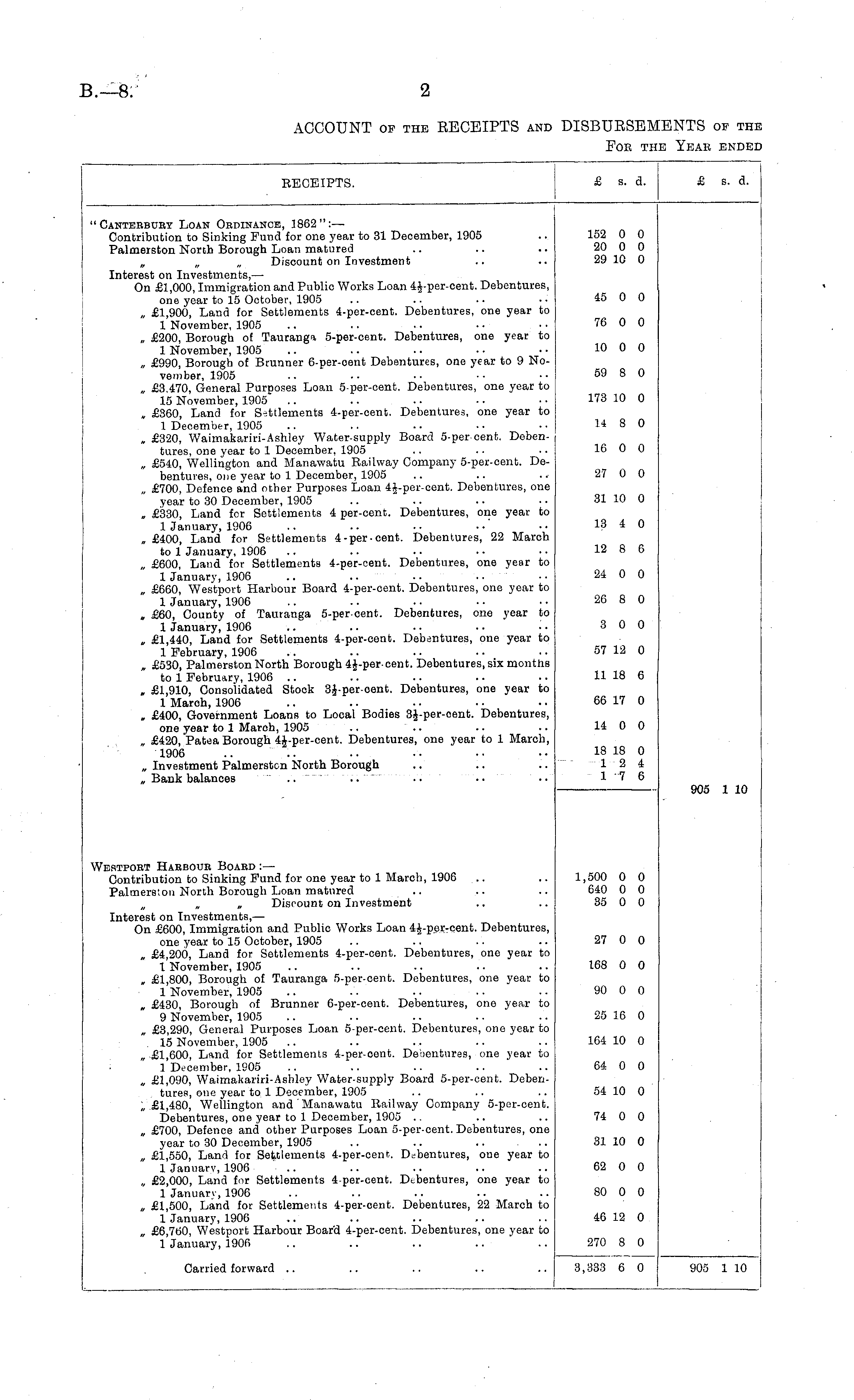 RECEIPTS. s. s. 'Canterbury Loan Ordinance, ]862": — Contribution to Sinking Fund for one year to 31 December, 1905 Palmerston North Borough Loan matured „ „ „ Discount on Investment Interest on Investments, — On £1,000, Immigration and Public Works Loan 4J-per-cent. Debentures, one year to 15 October, 1905 „ £1,900, Land for Settlements 4-per-cent. Debentures, one year to 1 November, 1905 „ £200, Borough of Tauranga 5-per-cent. Debentures, one year to 1 November, 1905 „ £990, Borough of Brunner 6-per-cent Debentures, one year to 9 November, 1905 „ £3.470, General Purposes Loan 5-per-cent. Debentures, one year to 15 November, 1905 „ £360, Land for Settlements 4-per-cent. Debentures, one year to 1 December, 1905 „ £320, Waimakariri-Ashley Water-supply Board 5-per-cent. Debentures, one year to 1 December, 1905 „ £540, Wellington and Manawatu Railway Company 5-per-cent. Debentures, one year to 1 December, 1905 „ £700, Defence and other Purposes Loan 4J-per-cent. Debentures, one year to 30 December, 1905 „ £330, Land fcr Settlements 4 per-cent. Debentures, one year to 1 January, 1906 , £400, Land for Settlements 4-per-cent. Debentures, 22 March to 1 January, 1906 „ £600, Land for Settlements 4-per-cent. Debentures, one year to 1 January, 1906 „ £660, Westport Harbour Board 4-per-cent. Debentures, one year to 1 January, 1906 , £60, County of Tauranga 5-per-cent. Debentures, one year to 1 January, 1906 „ £1,440, Land for Settlements 4-per-cent. Debentures, one year to 1 February, 1906 „ £530, Palmerston North Borough 41-percent. Debentures, six months to 1 February, 1906 .. » £1,910, Consolidated Stock 3J-per-oent. Debentures, one year to 1 March, 1906 . £400, Government Loans to Local Bodies 3J-per-oent. Debentures, one year to 1 March, 1905 „ £420, Patea Borough 4J-per-cent. Debentures, one year to 1 March, 1906 „ Investment Palmerston North Borough „ Bank balances .. .. .. 152 0 0 20 0 0 29 10 0 45 0 0 76 0 0 10 0 0 59 8 0 173 10 0 14 8 0 16 0 0 27 0 0 31 10 0 13 4 0 12 8 6 24 0 0 26 8 0 3 0 0 57 12 0 11 18 6 66 17 0 14 0 0 18 18 0 12 4 1 7 6 •- 905 1 10 Westport Harbour Board :— Contribution to Sinking Fund for one year to 1 March, 1906 Palmerston North Borough Loan matured „ „ Discount on Investment Interest on Investments, — On £600, Immigration and Public Works Loan 4J-per-cent. Debentures, one year to 15 October, 1905 „ £4,200, Land for Settlements 4-per-cent. Debentures, one year to 1 November, 1905 » £1,800, Borough of Tauranga 5-per-cent. Debentures, one year to 1 November, 1905 „ £430, Borough of Brunner 6-per-cent. Debentures, one year to 9 November, 1905 „ £3,290, General Purposes Loan 5-per-cent. Debentures, one year to 15 November, 1905 .. „ £1,600, Land for Settlements 4-per-cent. Debentures, one year to 1 December, 1905 „ £1,090, Waimakariri-Ashley Water-supply Board 5-per-cent. Debentures, one year to 1 December, 1905 „ £1,480, Wellington and Manawatu Railway Company 5-por-cent. Debentures, one year to 1 December, 1905 .. „ £700, Defence and other Purposes Loan 5-per-cent. Debentures, one year to 30 December, 1905 .. .. .. ... „ £1,550, Land for Settlements 4-per-cent. D-bentures, one year to 1 January, 1906 .. „ £2,000, Land fnr Settlements 4-per-cent. Debentures, one year to 1 January, 1906 „ £1,500, Land for Settlements 4-per-cent. Debentures, 22 March to 1 January, 1906 „ £6,760, Westport Harbour Board 4-per-cent. Debentures, one year to 1 January, 1906 1,500 0 0 640 0 0 35 0 0 27 0 0 168 0 0 90 0 0 25 16 0 164 10 0 64 0 0 54 10 0 74 0 0 31 10 0 62 0 0 80 0 0 46 12 0 270 8 0 Carried forward 3,333 6 0 905 1 10