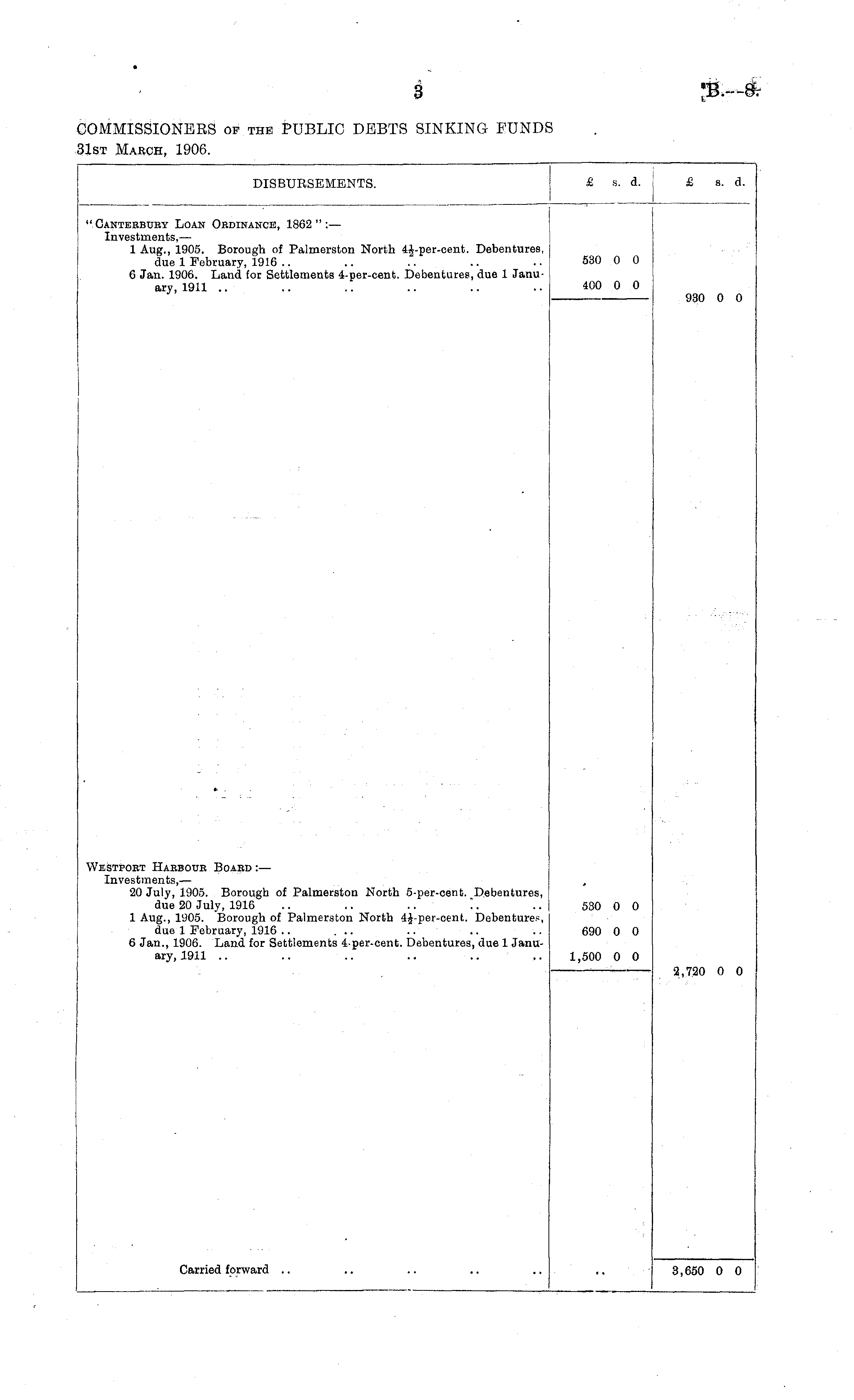 DISBURSEMENTS. s. s. L. . I ; ' Canterbury Loan Ordinance, 1862 " :— Investments, — 1 Aug., 1905. Borough of Palmerston North 4J-per-cent. Debentures, due 1 February, 1916 .. 6 Jan. 1906. Land for Settlements 4-per-cent. Debentures, due 1 January, 1911 .. 530 0 0 400 0 0 930 0 0 » . Westport Harbour Board :— Investments, — 20 July, 1905. Borough of Palmerston North 5-per-cent. Debentures, due 20 July, 1916 1 Aug., 1905. Borough of Palmerston North 4£-per-oent. Debentures, due 1 February, 1916 .. ... 6 Jan., 1906. Land for Settlements 4-per-cent. Debentures, due 1 January, 1911 530 0 0 690 0 0 1,500 0 0 2,720 0 0 Carried forward 3,650 0 0
