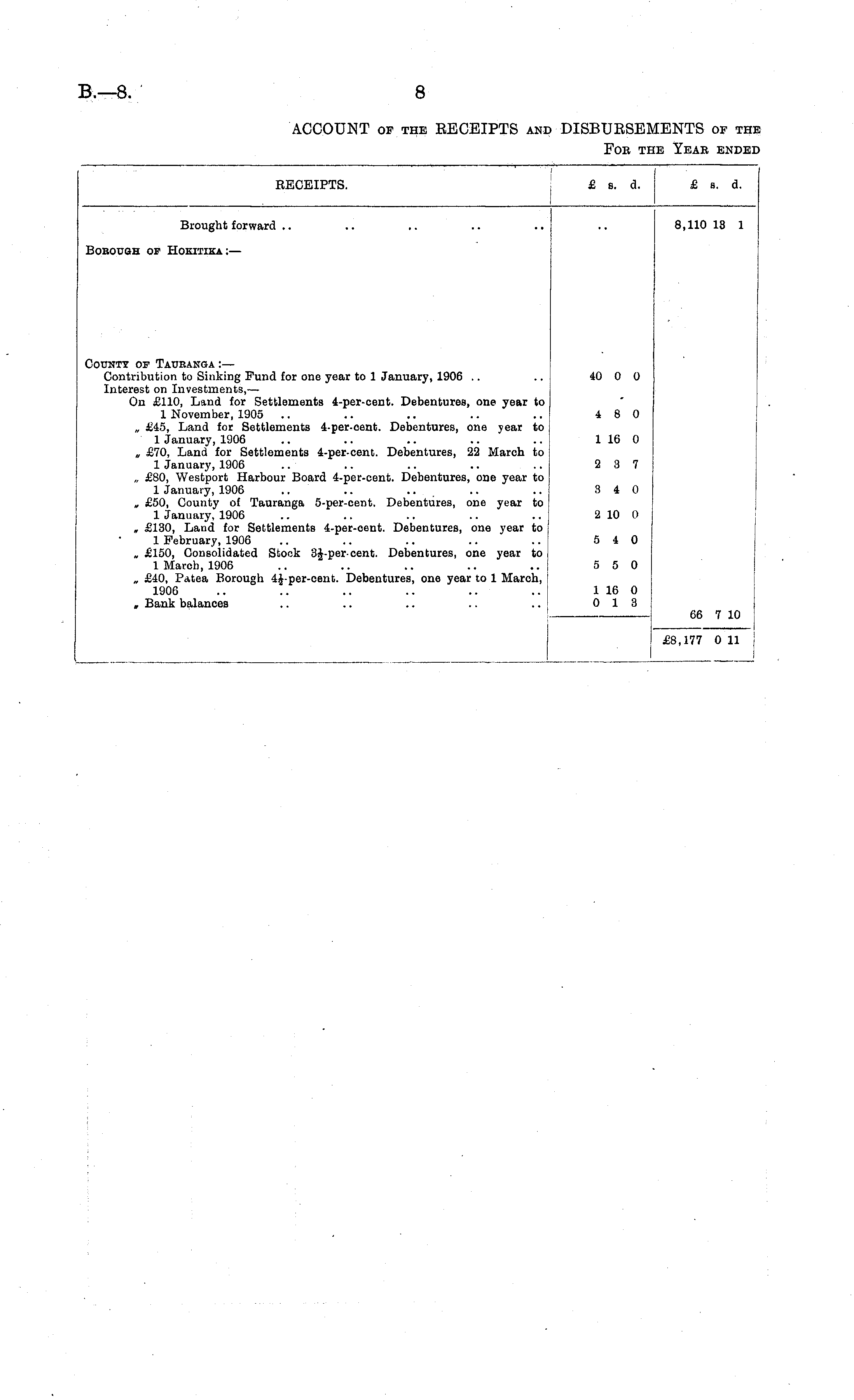 RECEIPTS. £ s. d. £ B. d. Brought forward 8,110 13 1 ioEOCGH of Hokitika: — Iounty of Tauranga :— Contribution to Sinking Fund for one year to 1 January, 1906 Interest on Investments, — On £110, Land for Settlements 4-per-cent. Debentures, one year to 1 November, 1905 „ £45, Land for Settlements 4-per-cent. Debentures, one year to 1 January, 1906 „ £70, Land for Settlements 4-per-cent. Debentures, 22 March to 1 January, 1906 „ £80, Westport Harbour Board 4-per-cent. Debentures, one year to 1 January, 1906 „ £50, County of Tauranga 5-per-cent. Debentures, one year to 1 January, 1906 .. ' .. „ £130, Land for Settlements 4-per-cent. Debentures, one year to 1 February, 1906 „ £150, Consolidated Stock 3J-percent. Debentures, one year to 1 March, 1906 „ £40, Patea Borough 4J-per-cent. Debentures, one year to 1 March, 1906 „ Bank balances 40 0 0 4 8 0 1 16 0 2 3 7 3 4 0 2 10 0 5 4 0 5 5 0 1 16 0 0 13 66 7 10 £8,177 0 11