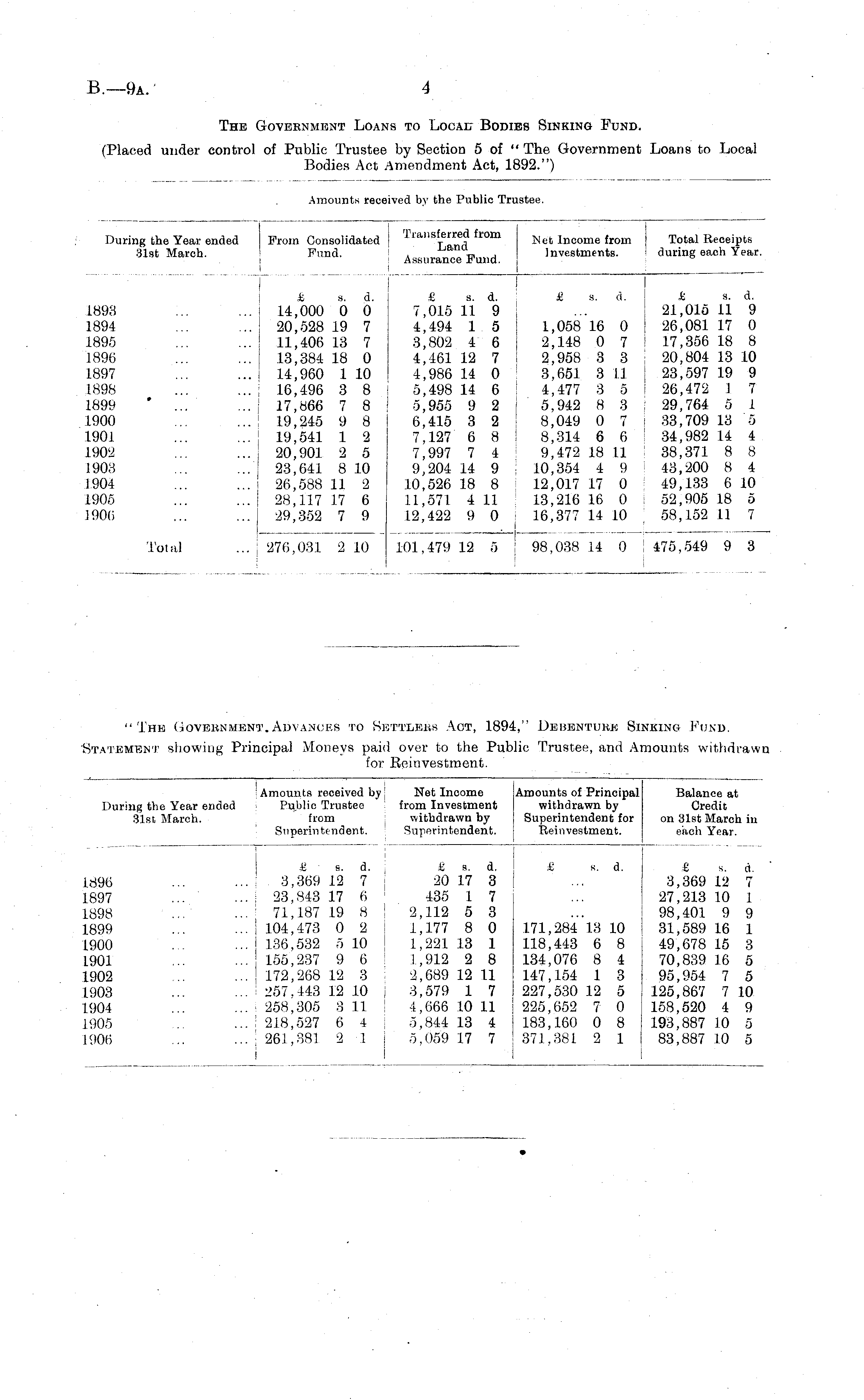 "The Government Advances to Settlers Act, 1894," Debenture Sinking Fund. Statement showing Principal Moneys paid over to the Public Trustee, and Amounts withdrawn for Reinvestment.