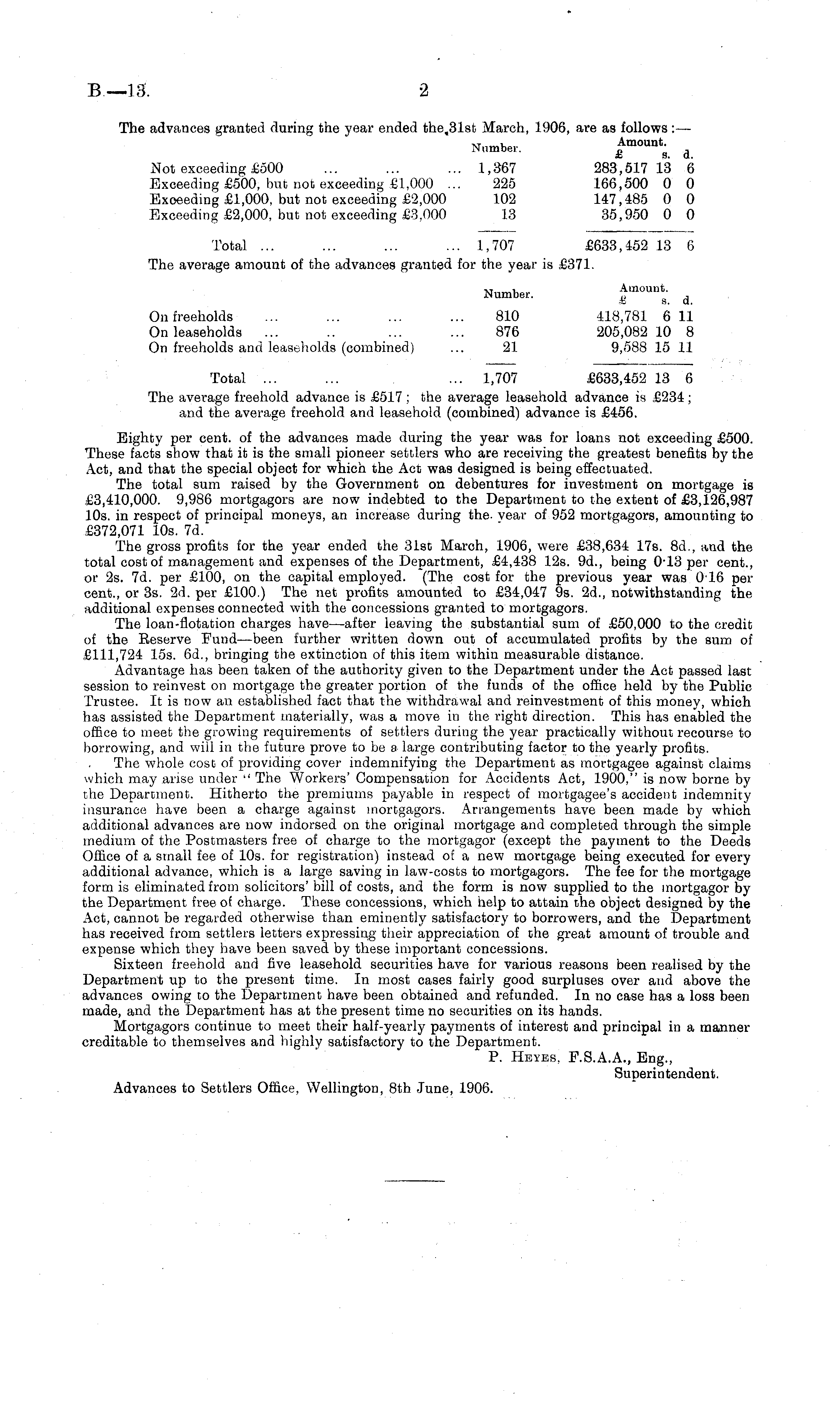 The advances granted during the year ended the,3lst March, 1906, are as follows :— Number. Amount Not exceeding £500 ... ... ... 1,367 283,517 13 6 Exceeding £500, but not exceeding £1,000 ... 225 166,500 0 0 Exceeding £1,000, but not exceeding £2,000 102 147,485 0 0 Exceeding £2,000, but not exceeding £3,000 13 35,950 0 0 Total ... ... ... ... 1,707 £633,452 13 6 The average amount of the advances granted for the year is £371. xt ~.v. Amount. Number. „ , £ s. a. On freeholds ... ... ... ... 810 418,781 6 11 On leaseholds ... .. ... ... 876 205,082 10 8 On freeholds and leaseholds (combined) ... 21 9,588 15 11 Total ... ... ... 1,707 £633,452 13 6 The average freehold advance is £517 ; the average leasehold advance is £234; and the average freehold and leasehold (combined) advance is £456. Eighty per cent, of the advances made during the year was for loans not exceeding £500. These facts show that it is the small pioneer settlers who are receiving the greatest benefits by the Act, and that the special object for which the Act was designed is being effectuated. The total sum raised by the Government on debentures for investment on mortgage is £3,410,000. 9,986 mortgagors are now indebted to the Department to the extent of £3,126,987 10s. in respect of principal moneys, an increase during the. vear of 952 mortgagors, amounting to £372,071 10s. 7d. The gross profits for the year ended the 31sc March, 1906, were £38,634 17s. Bd., and the total cost of management and expenses of the Department, £4,438 12s. 9d., being 0-13 per cent., or 2s. 7d. per £100, on the capital employed. (The cost for the previous year was o'l6 per cent., or 3s. 2d. per £100.) The net profits amounted to £34,047 9s. 2d., notwithstanding the additional expenses connected with the concessions granted to mortgagors. The loan-flotation charges have—after leaving the substantial sum of £50,000 to the credit of the Beserve Fund —been further written down out of accumulated profits by the sum of £111,724 15s. 6d., bringing the extinction of this item within measurable distance. Advantage has been taken of the authority given to the Department under the Act passed last session to reinvest on mortgage the greater portion of the funds of the office held by the Public Trustee. It is now an established fact that the withdrawal and reinvestment of this money, which has assisted the Department materially, was a move in the right direction. This has enabled the office to meet the growing requirements of settlers during the year practically without recourse to borrowing, and will in the future prove to be a large contributing factor to the yearly profits. The whole cost of providing cover indemnifying the Department as mortgagee against claims which may arise under " The Workers' Compensation for Accidents Act, 1900," is now borne by the Department. Hitherto the premiums payable in respect of mortgagee's accident indemnity insurance have been a charge against mortgagors. Arrangements have been made by which additional advances are now indorsed on the original mortgage and completed through the simple medium of the Postmasters free of charge to the mortgagor (except the payment to the Deeds Office of a small fee of 10s. for registration) instead of a new mortgage being executed for every additional advance, which is a large saving in law-costs to mortgagors. The fee for the mortgage form is eliminated from solicitors' bill of costs, and the form is now supplied to the mortgagor by the Department free of charge. These concessions, which help to attain the object designed by the Act, cannot be regarded otherwise than eminently satisfactory to borrowers, and the Department has received from settlers letters expressing their appreciation of the great amount of trouble and expense which they have been saved by these important concessions. Sixteen freehold and five leasehold securities have for various reasons been realised by the Department up to the present time. In most cases fairly good surpluses over and above the advances owing to the Department have been obtained and refunded. In no case has a loss been made, and the Department has at the present time no securities on its hands. Mortgagors continue to meet their half-yearly payments of interest and principal in a manner creditable to themselves and bighlv satisfactory to the Department. P. Hexes, P.S.A.A., Eng., Superintendent. Advances to Settlers Office, Wellington, Bth June, 1906.